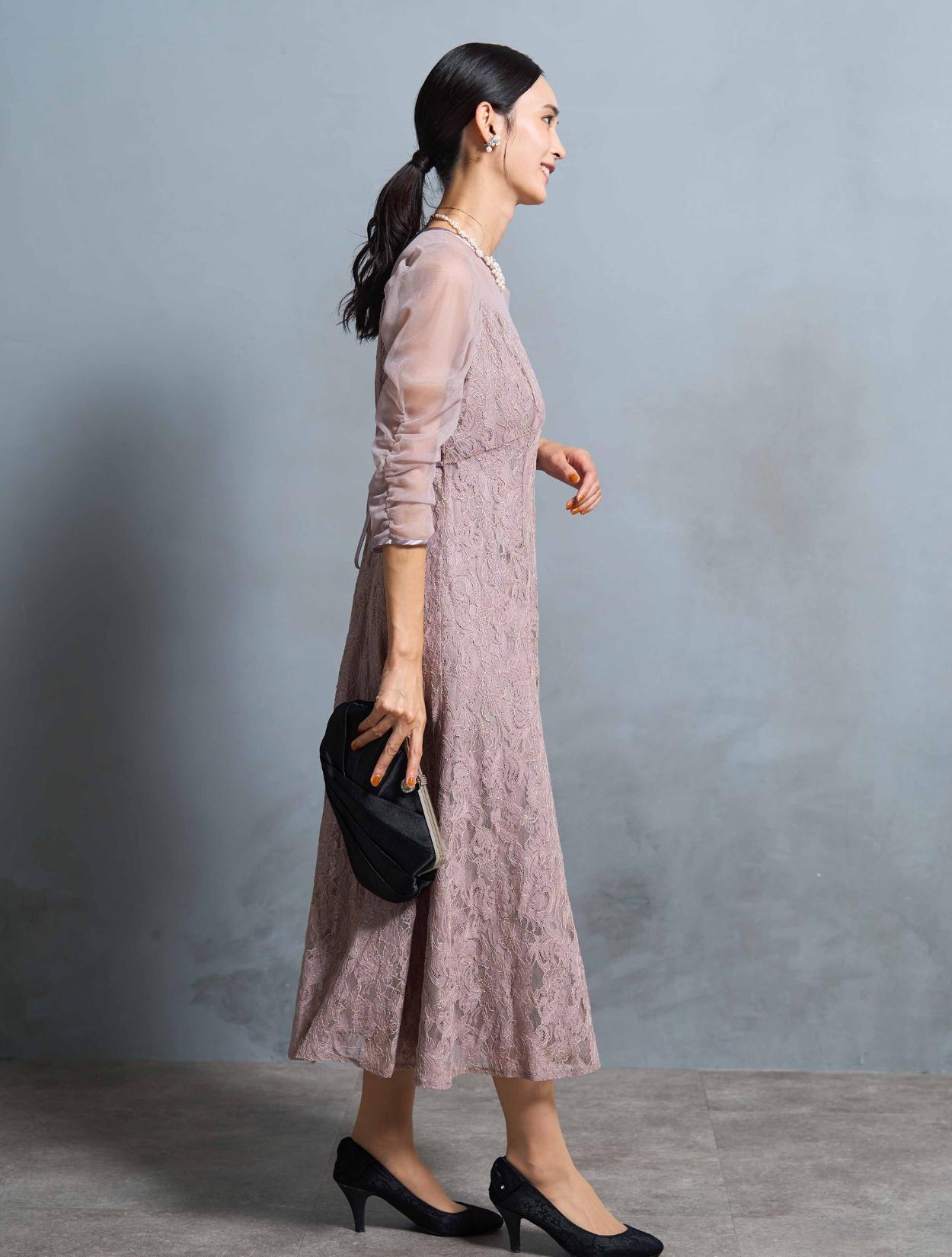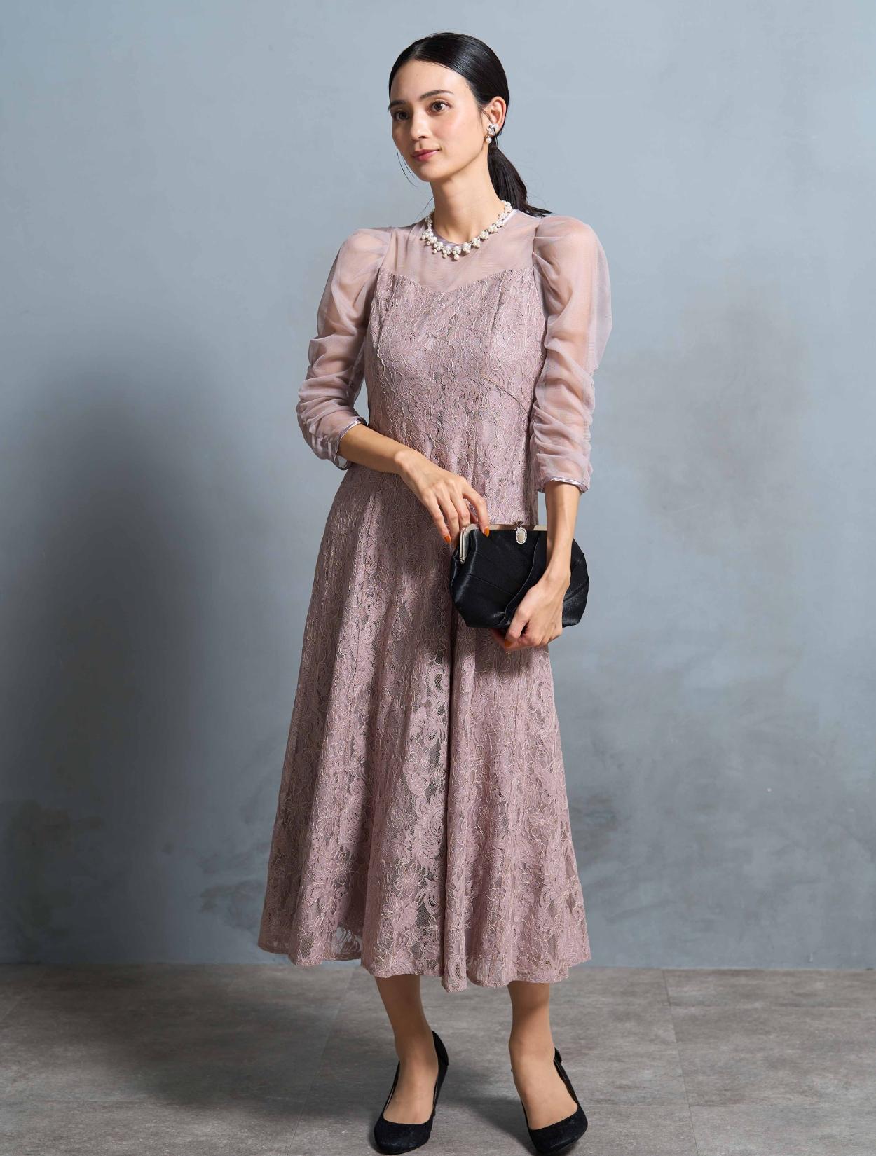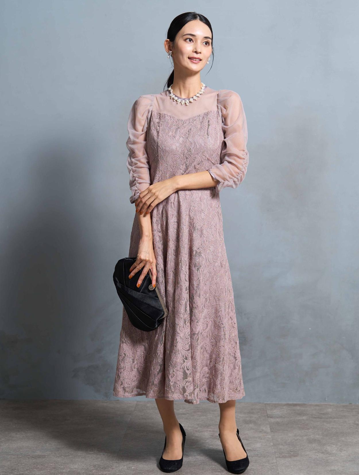 高級感のある上品なレースが目を惹くドレス。デコルテからお袖にかけてはシンプルなシアーチュールが使われているので、レースドレスでも甘くなり過ぎず幅広い年代におすすめです。ギャザーを寄せたお袖のデザインはお顔周りを華やかに見せてくれて、写真写りも良くSNS映えします◎。肩幅が気になる方でも着こなしやすい、控えめなボリューム感なのも嬉しいポイントです。ウエストには華奢なリボン紐が付いているので、キュッと絞って細身の方でもキレイに着こなせます。さりげなくウエストマークできるのでスタイルアップ効果もあり。首元も開きすぎないデザインなので、Sサイズや低身長の方でも着こなしやすいドレスです。ボリュームを落としたフレアスカートは、全体のバランスをすっきり大人っぽく見せてくれます。