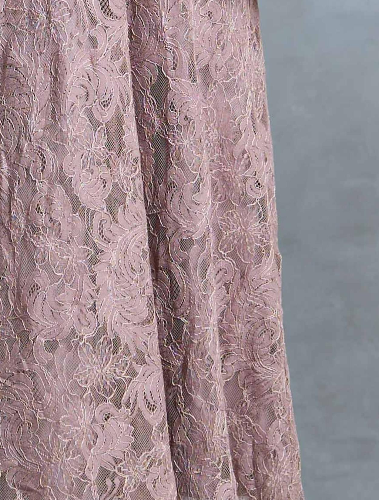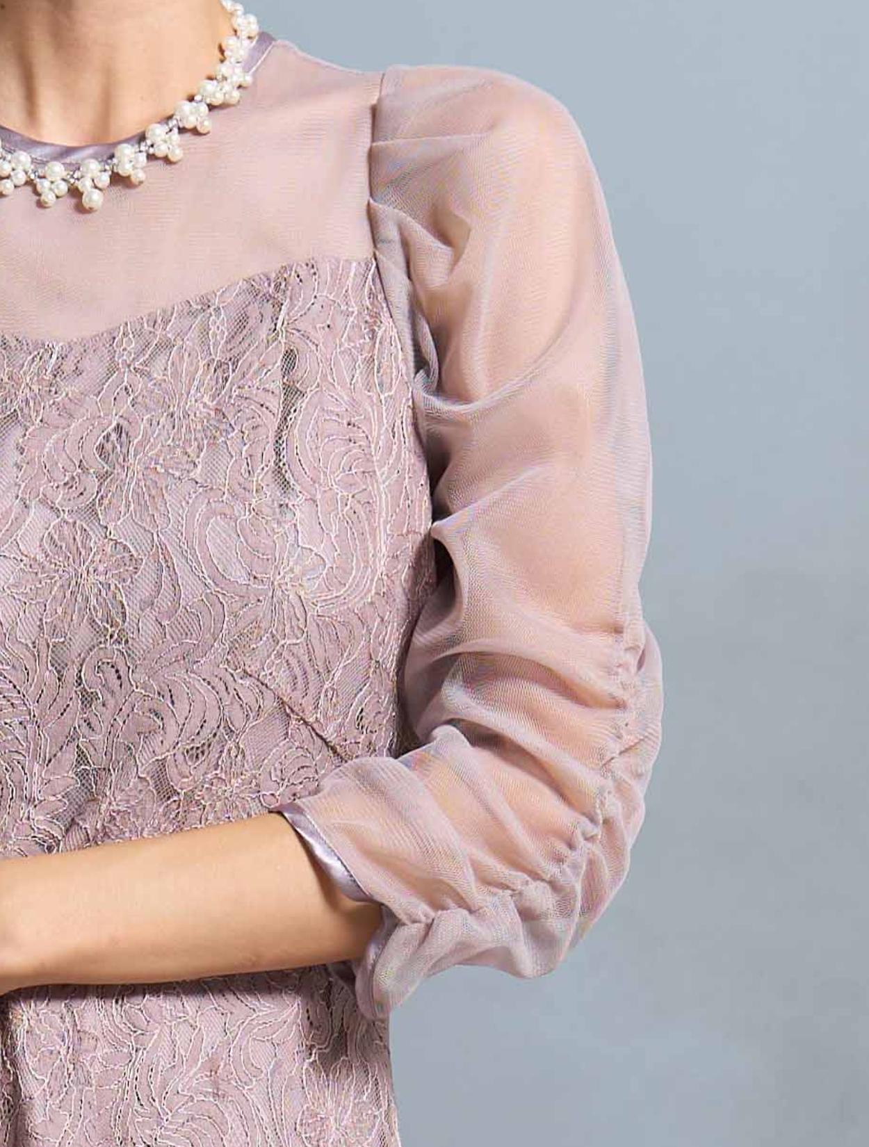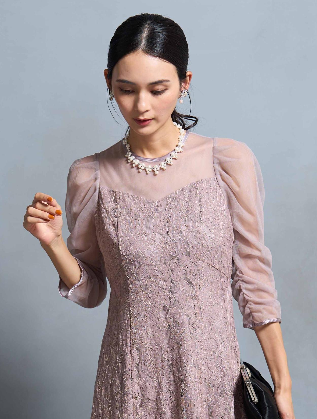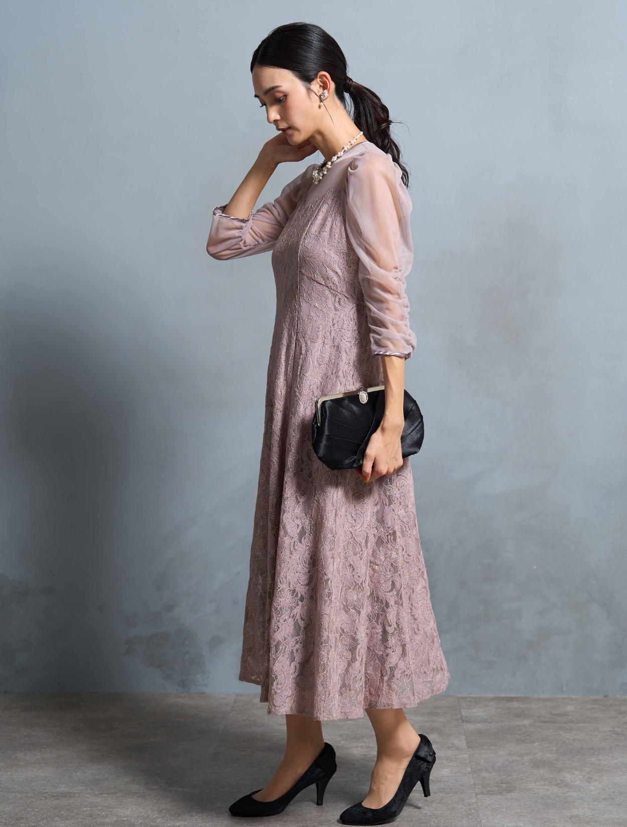 高級感のある上品なレースが目を惹くドレス。デコルテからお袖にかけてはシンプルなシアーチュールが使われているので、レースドレスでも甘くなり過ぎず幅広い年代におすすめです。ギャザーを寄せたお袖のデザインはお顔周りを華やかに見せてくれて、写真写りも良くSNS映えします◎。肩幅が気になる方でも着こなしやすい、控えめなボリューム感なのも嬉しいポイントです。ウエストには華奢なリボン紐が付いているので、キュッと絞って細身の方でもキレイに着こなせます。さりげなくウエストマークできるのでスタイルアップ効果もあり。首元も開きすぎないデザインなので、Sサイズや低身長の方でも着こなしやすいドレスです。ボリュームを落としたフレアスカートは、全体のバランスをすっきり大人っぽく見せてくれます。