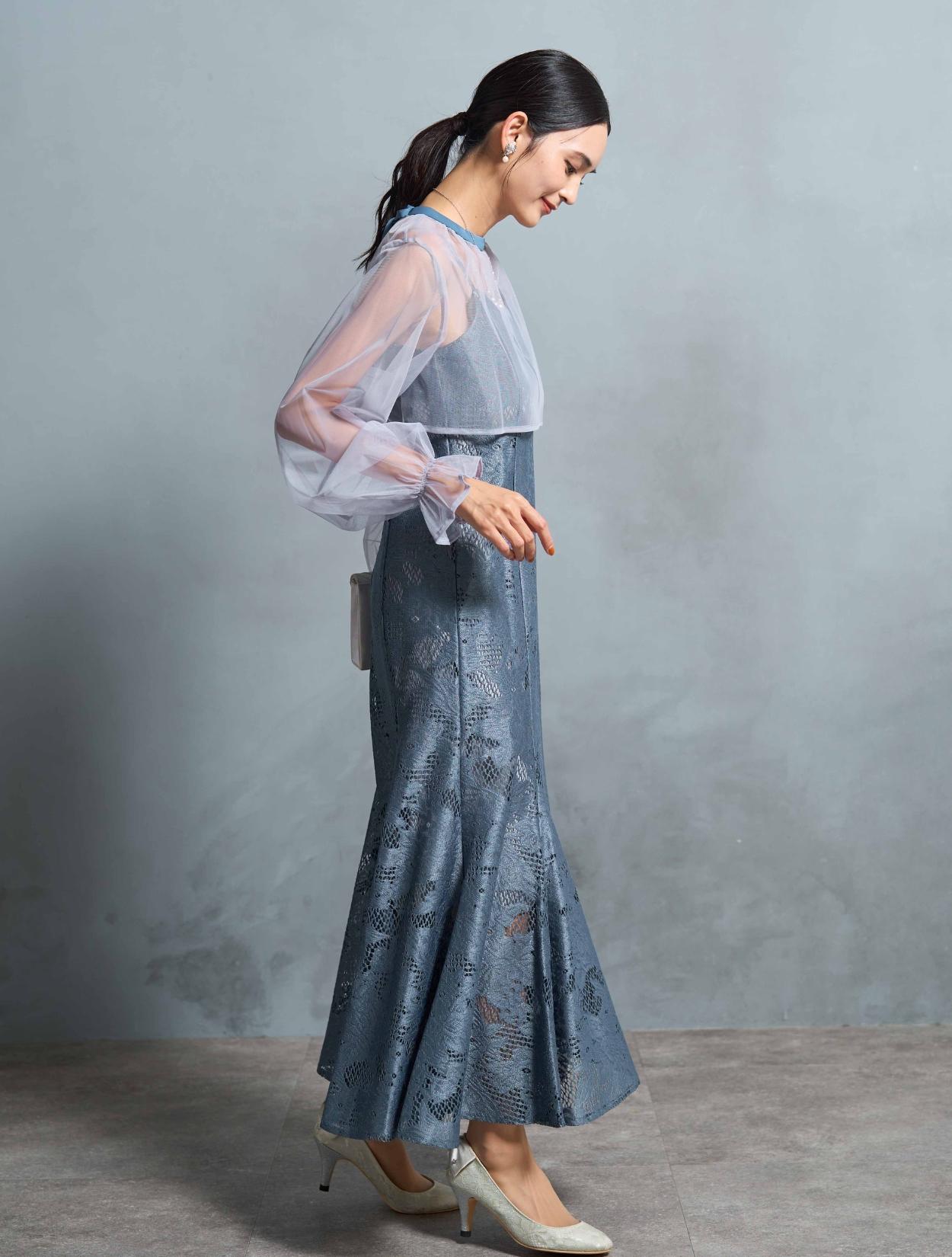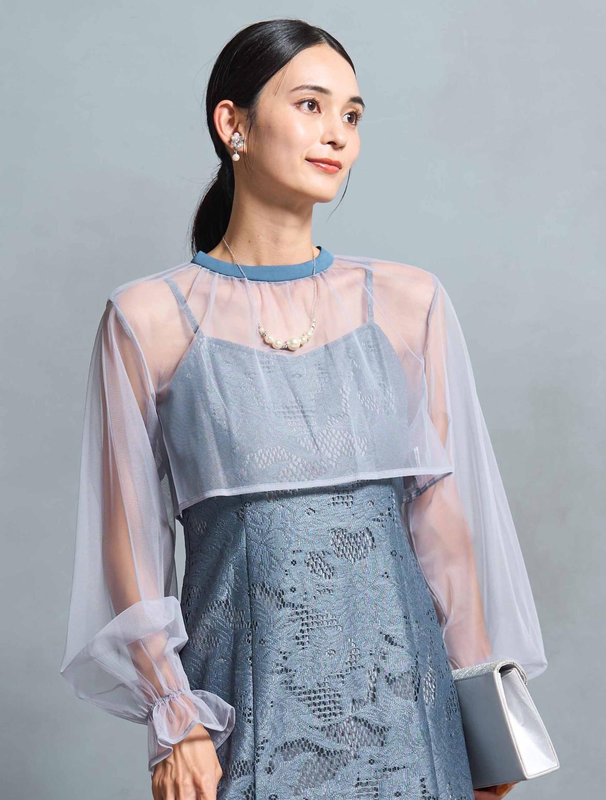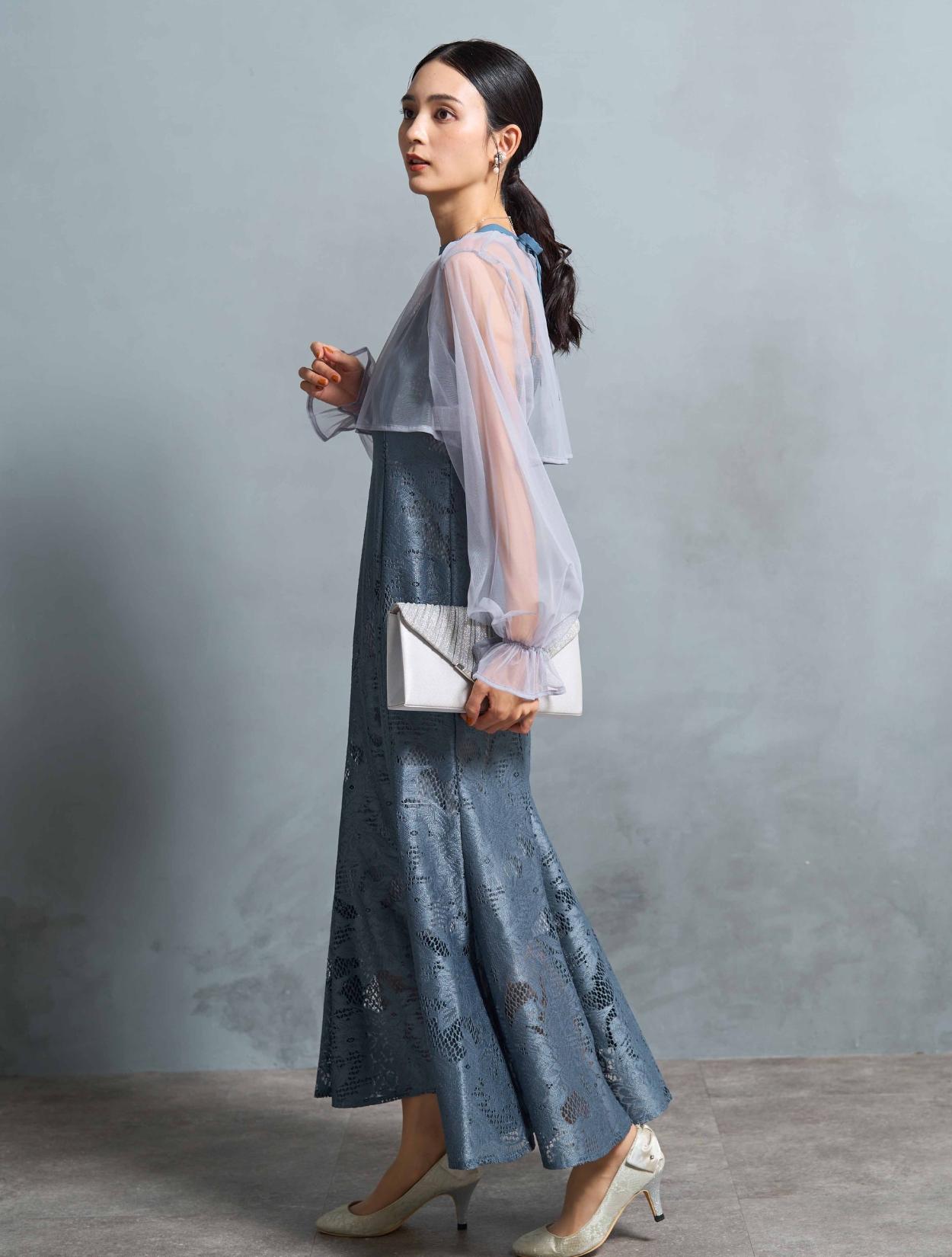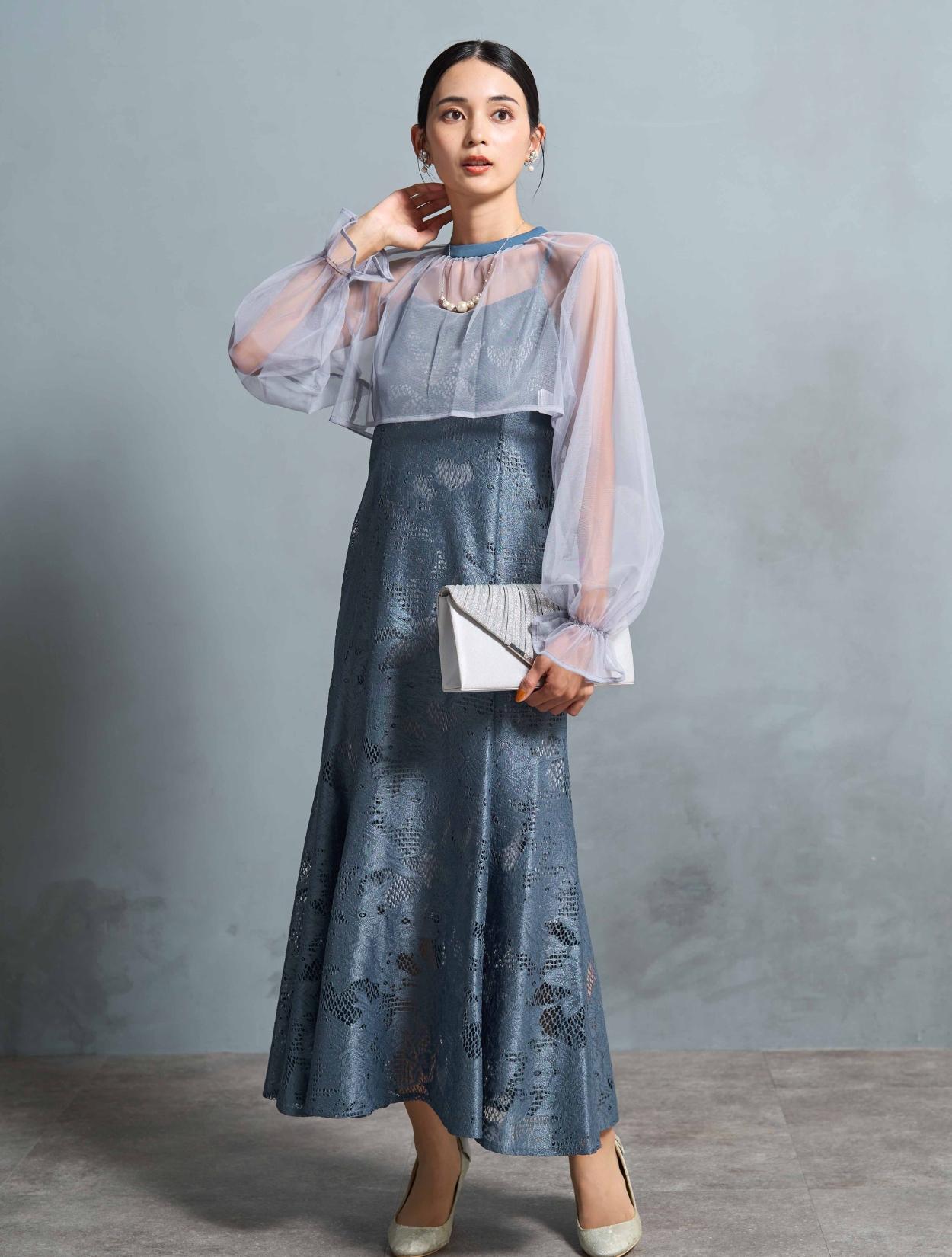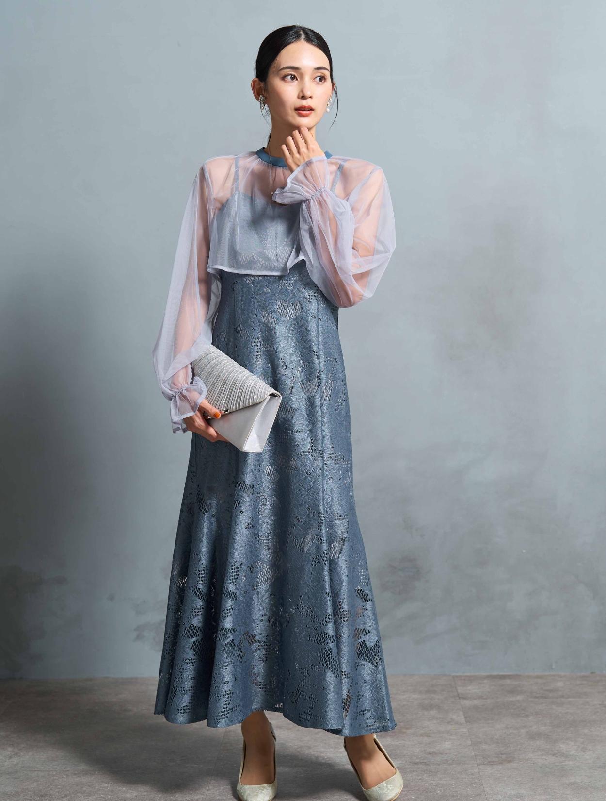 明るく爽やかなブルーが若々しい印象。20代30代のお呼ばれにぴったりのカラーです。ライトグレーのシアーブラウスが、透明感をプラス。どなたでも着やすい派手すぎず上品なカラーです。