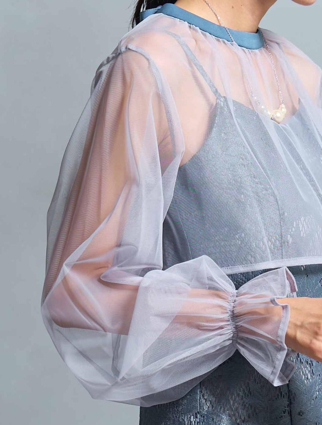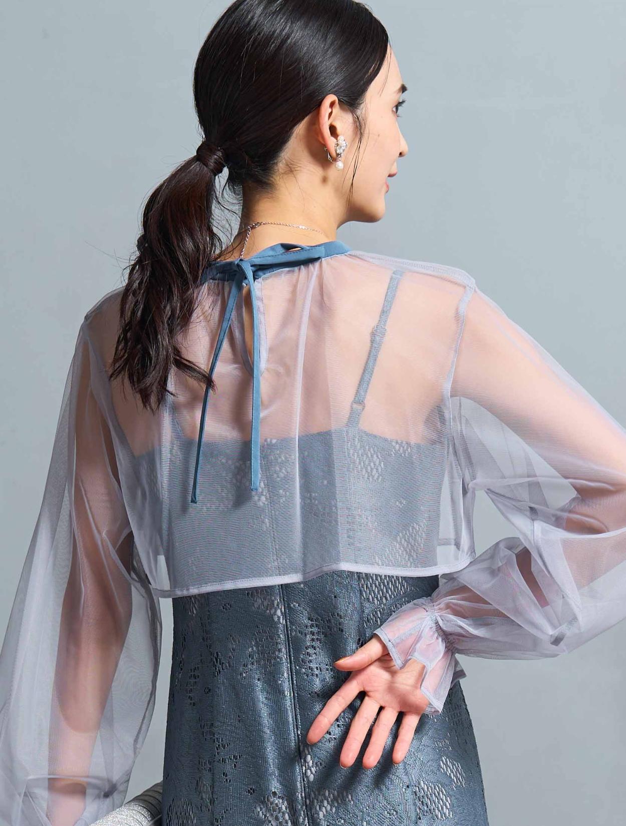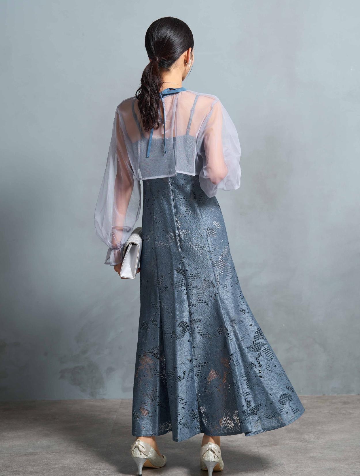 上品で高級感のあるジャガードレースのワンピースに、トレンドのシアー素材のブラウスをセットにしたドレス。ブラウスは前後どちらを前にしても着られる2wayタイプ。シンプルな着こなしがお好きな方は、リボンを後ろに。フェミニンな着こなしがしたい方は、リボンを前に持ってくると◎。また、ワンピースの下に着ても違った印象を楽しめます。しっかりと腕をカバーする、上品な長袖のデザイン。キャンディースリーブが遊びのあるポイントです。キャミソールワンピースはアジャスター付きなので、デコルテ部分が華奢な方や、丈が心配な方でも調節可能です。トレンド感のあるマーメイドシルエットのスカートは、ボディラインを拾い過ぎずスタイルアップを叶えてくれます。裏地のスカートは膝丈なので、厚みのあるジャガードレースでも足元は軽く見えます。