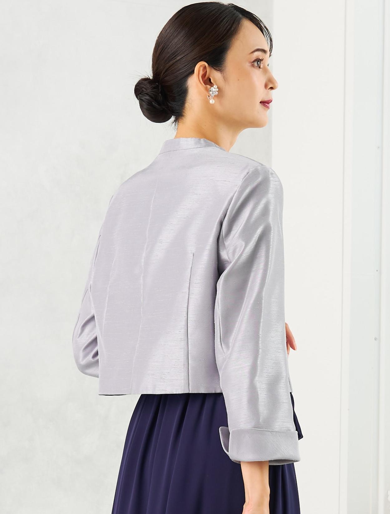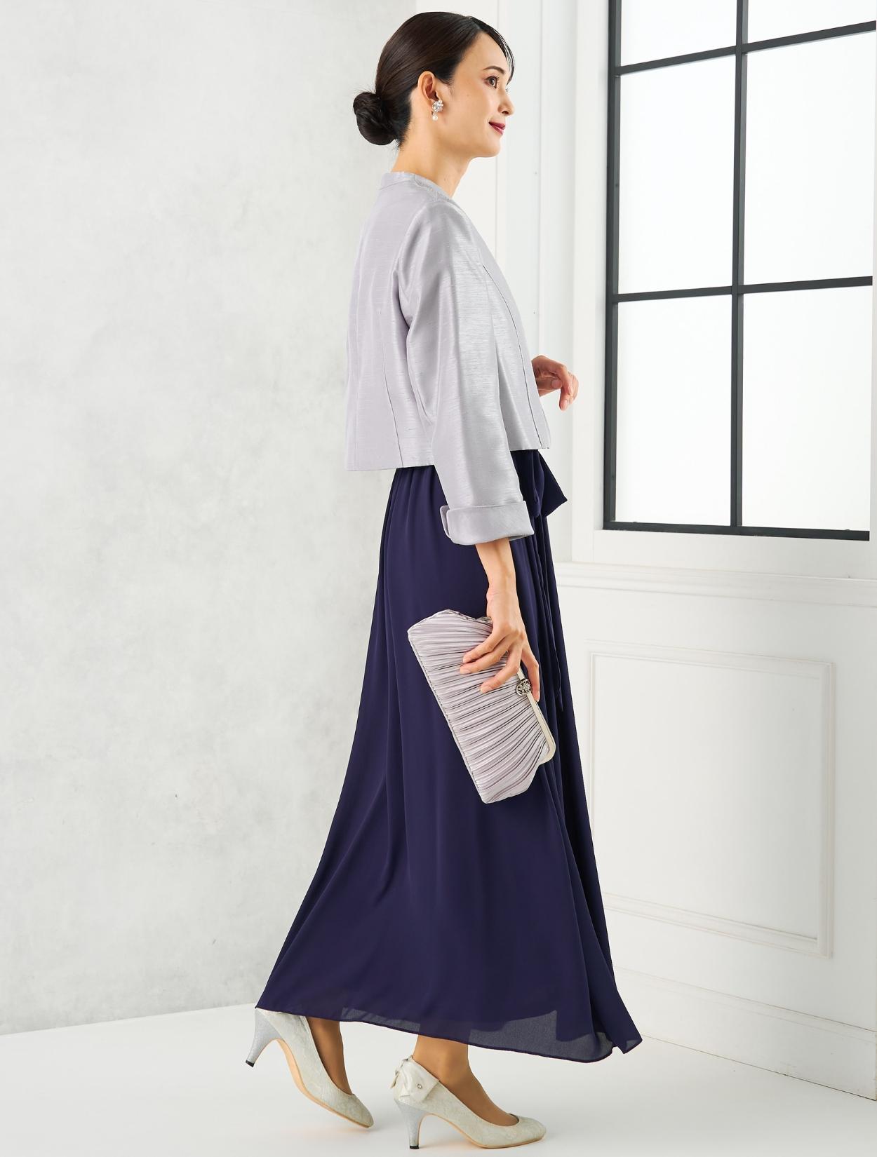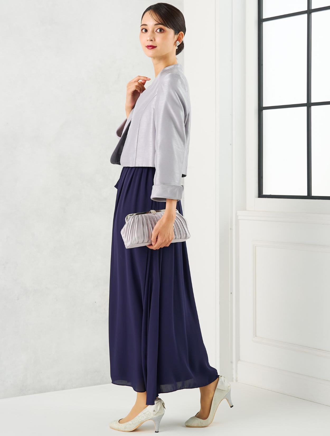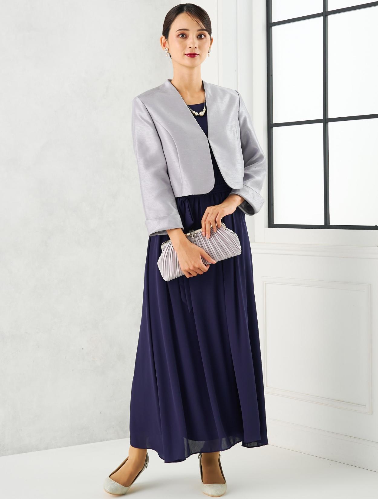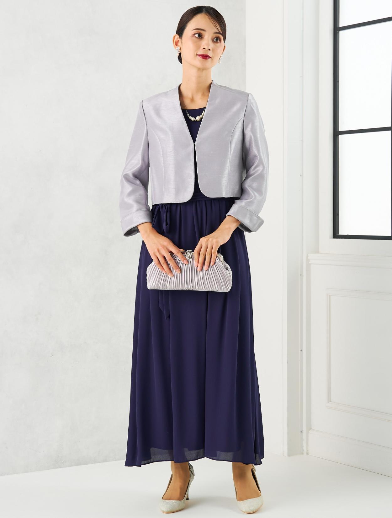 ネイビーのロングドレスに、高級感のあるシャンタンジャケットを合わせた親族向きのコーディネートセットです。上品できちんと感があるので、母親用のドレスコーデとしてもおすすめです。
