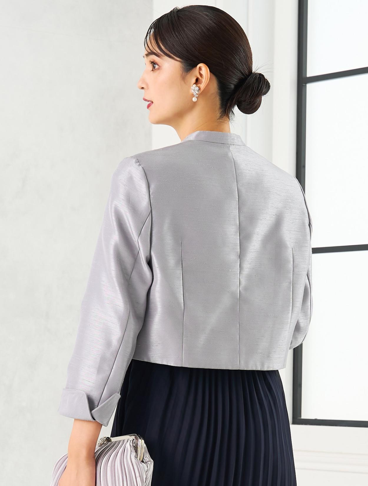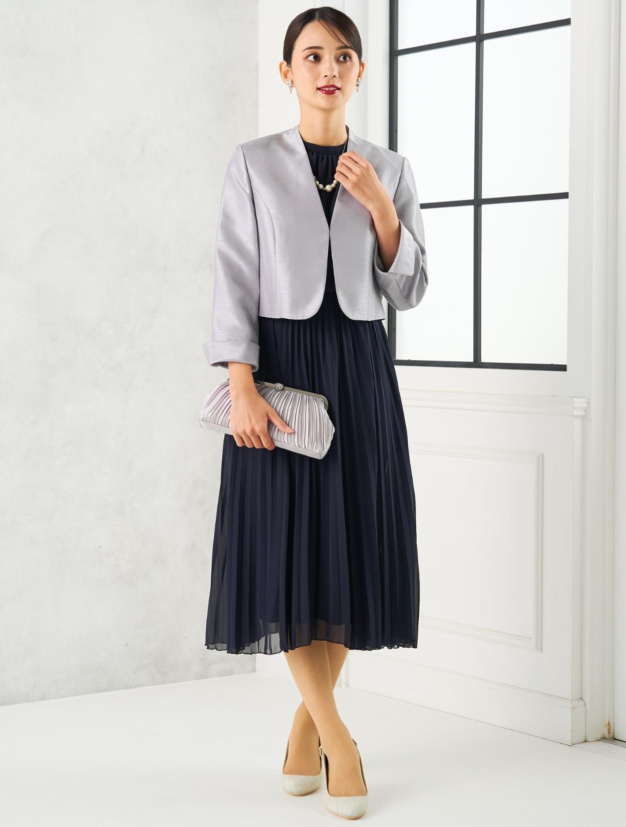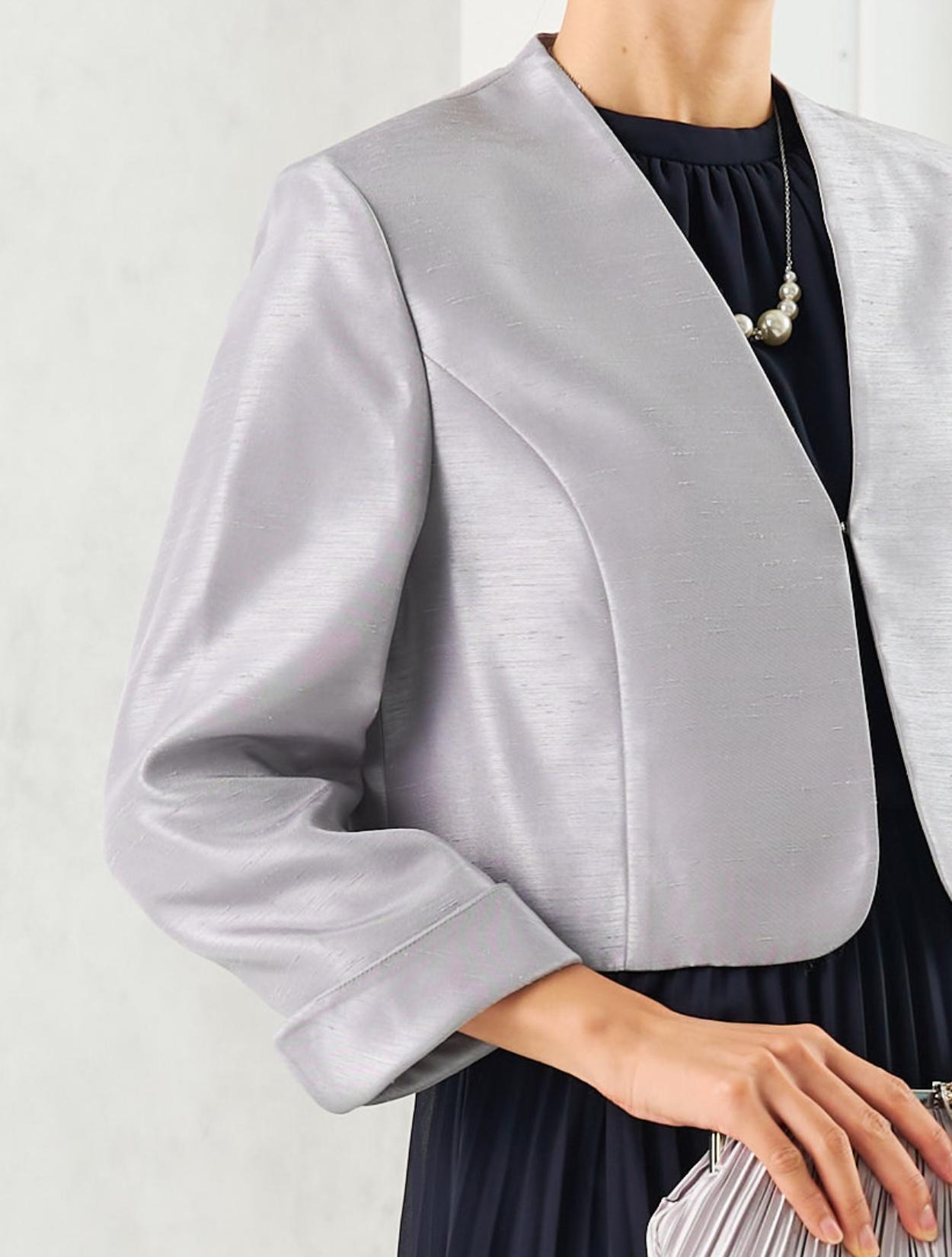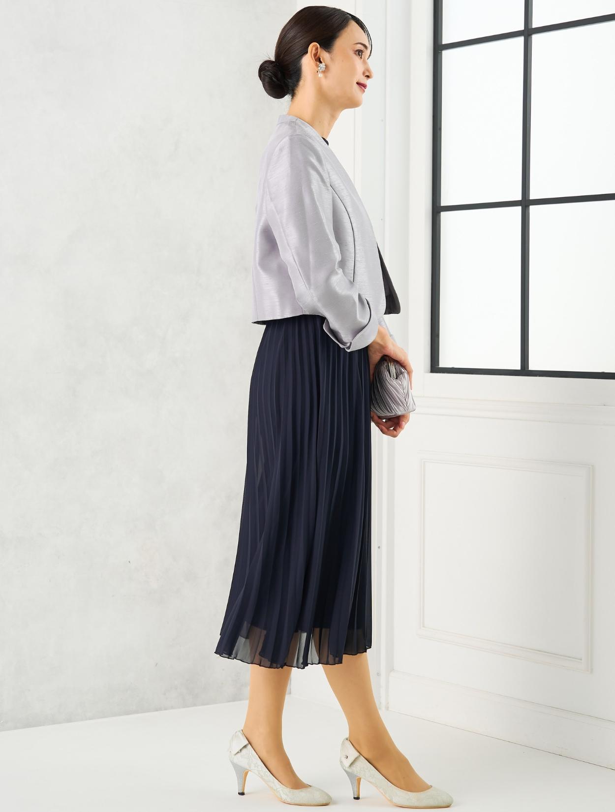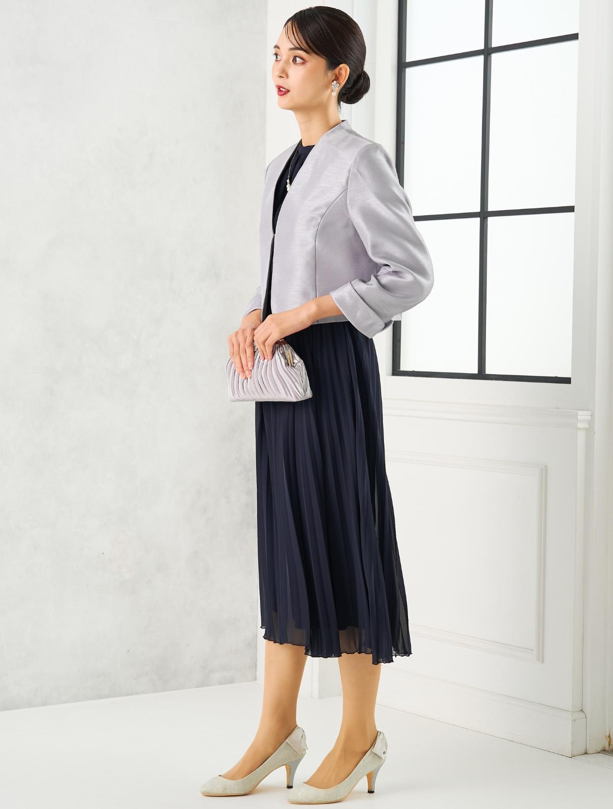高級感のあるシャンタンジャケットを合わせた親族向きのコーディネートセット。きちんと感があり露出を抑えた上品なコーデです。低身長の方にもおすすめ。