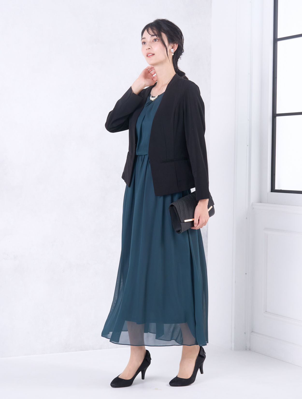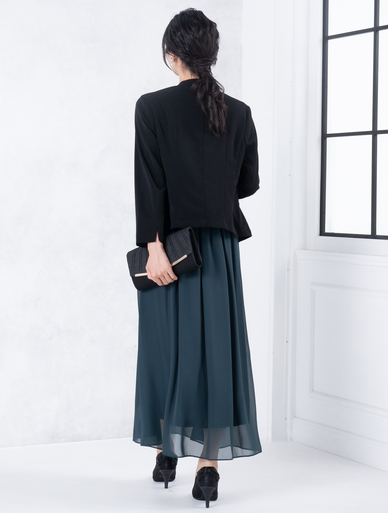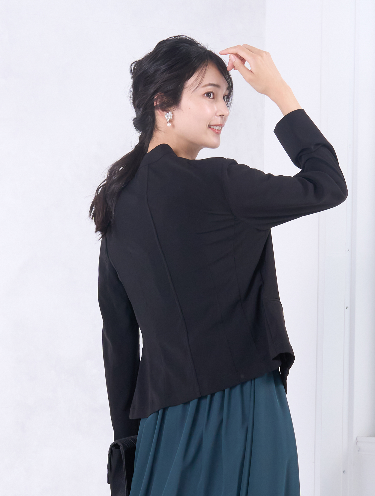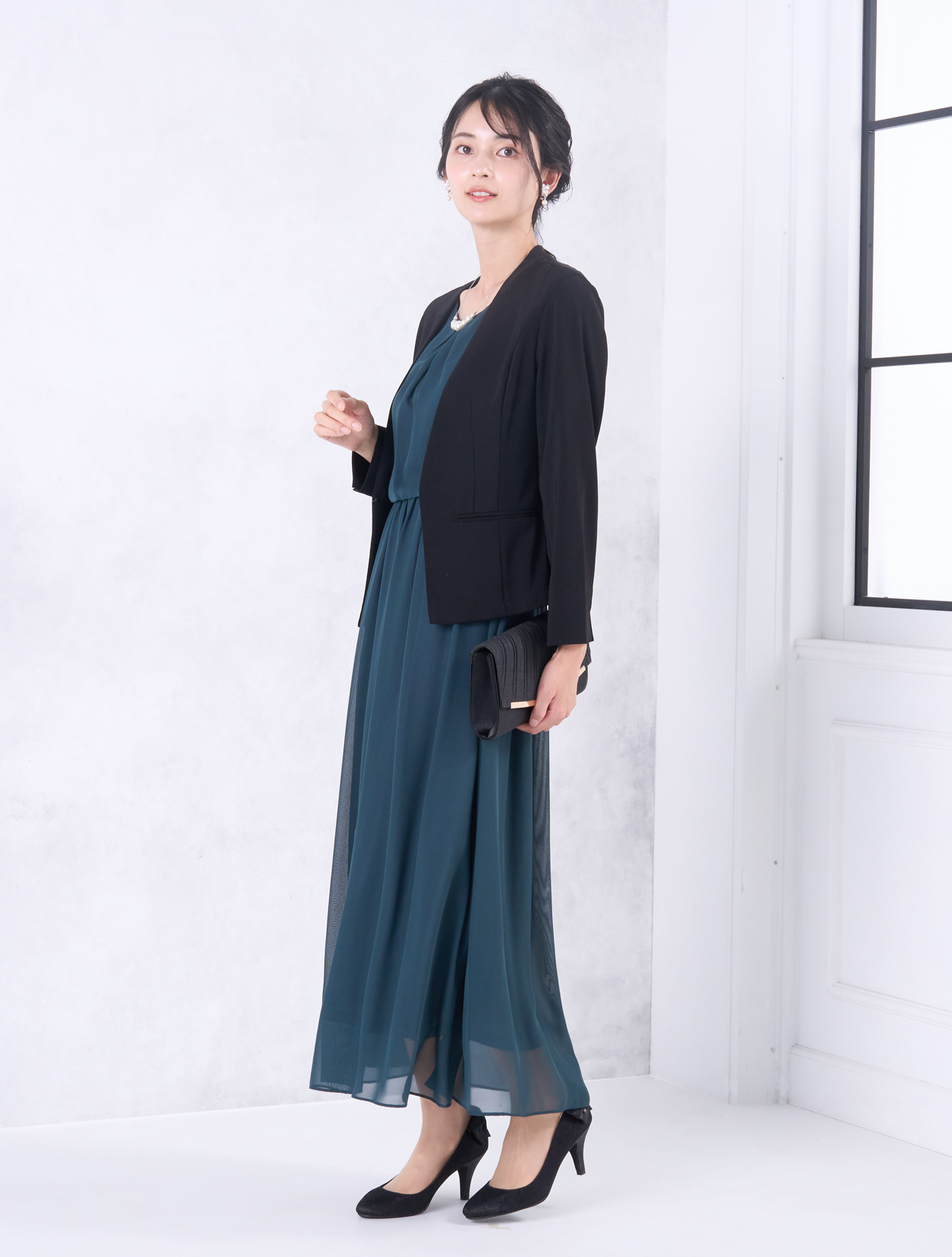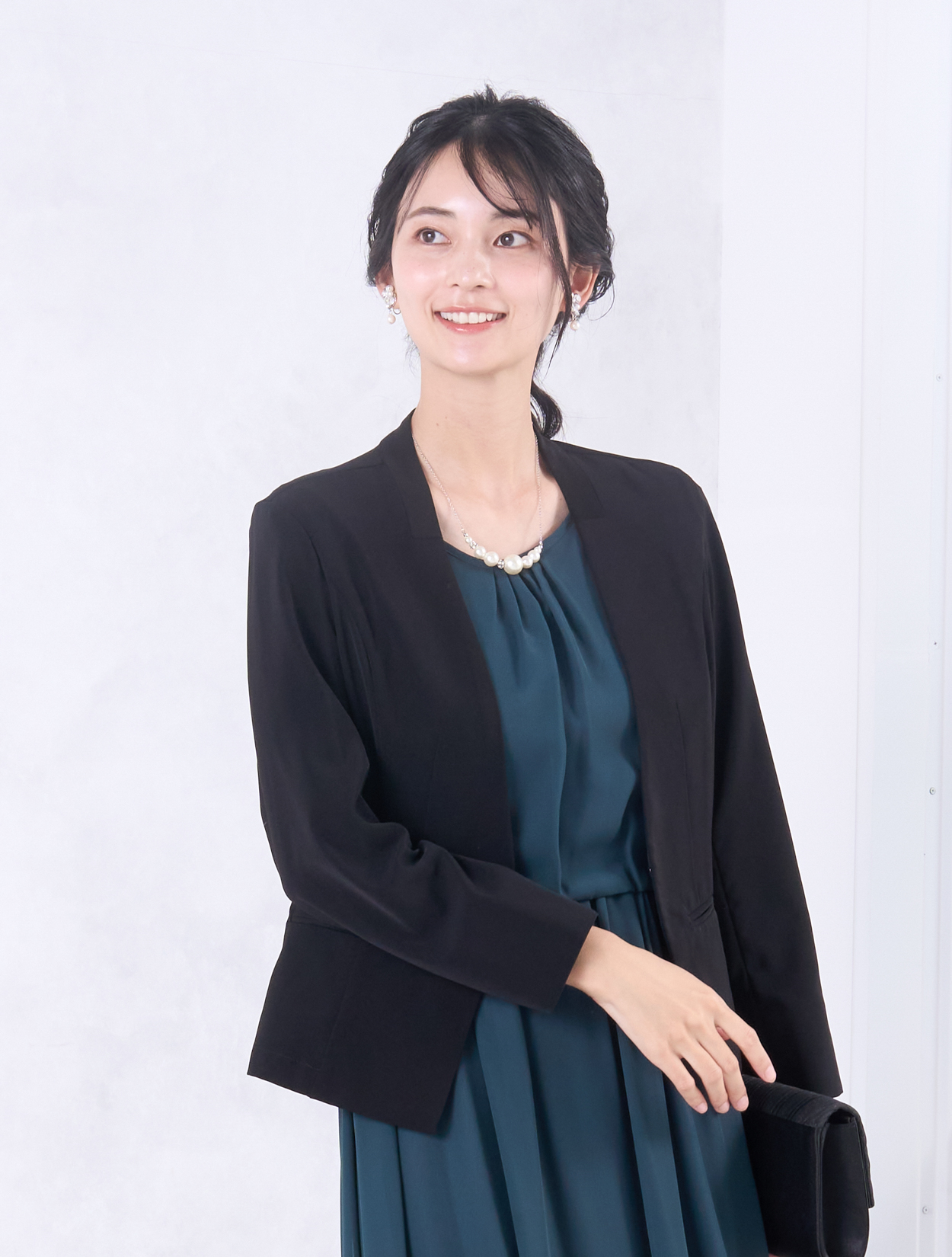 ダークグリーンのロングドレスにブラックのジャケットを合わせた親族向きのコーデ。着丈が長めのジャケットは落ち着きときちんと感があり、カラードレスを親族用ドレスにアップデートしてくれます。後姿もスッキリ見えるのもポイントです。