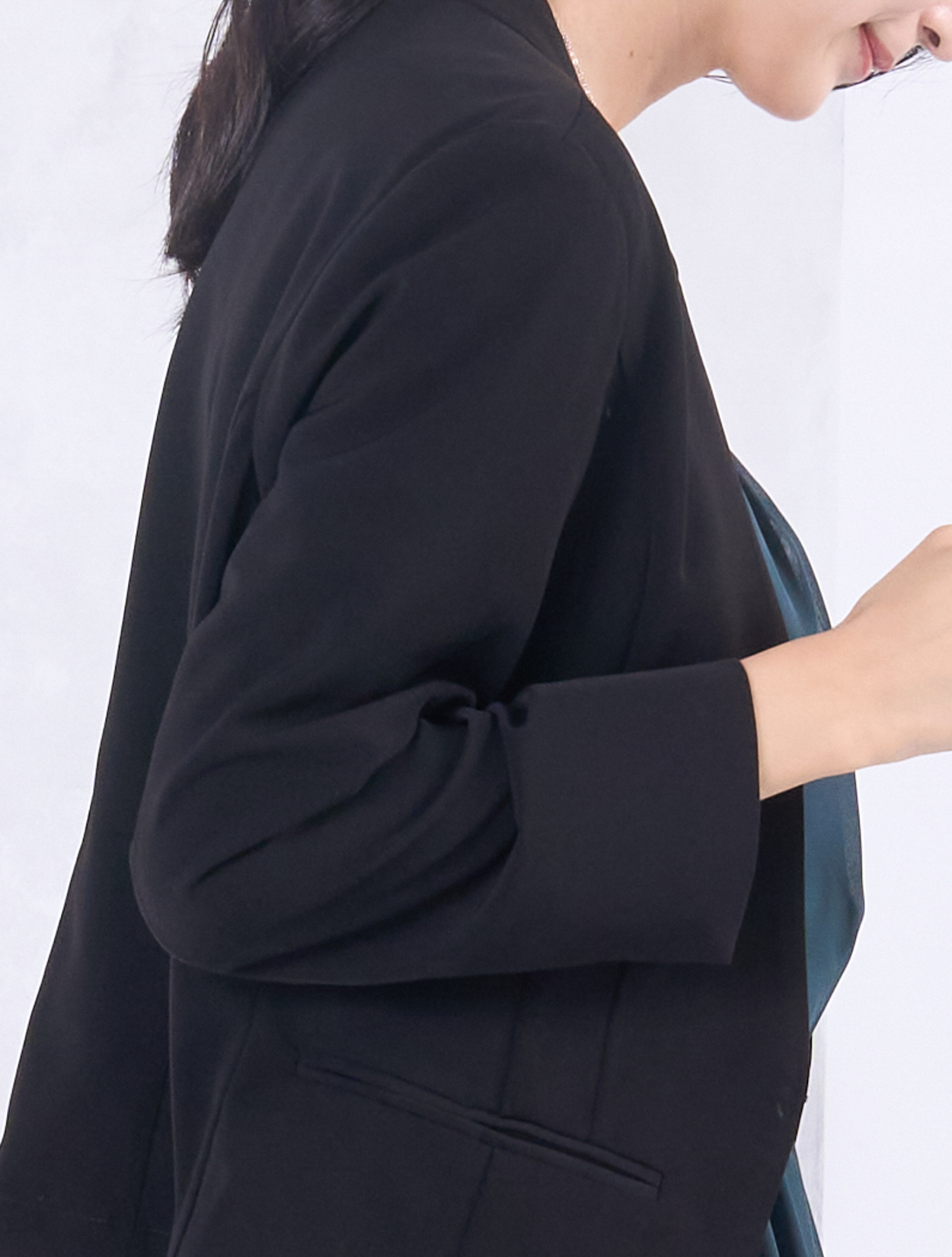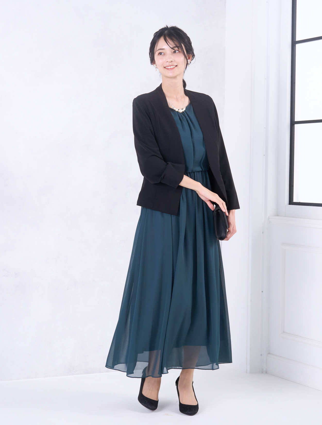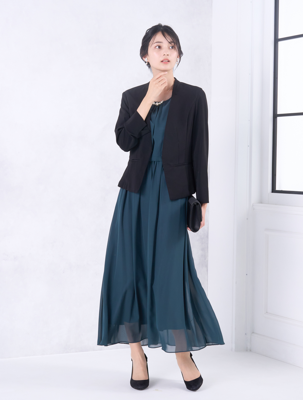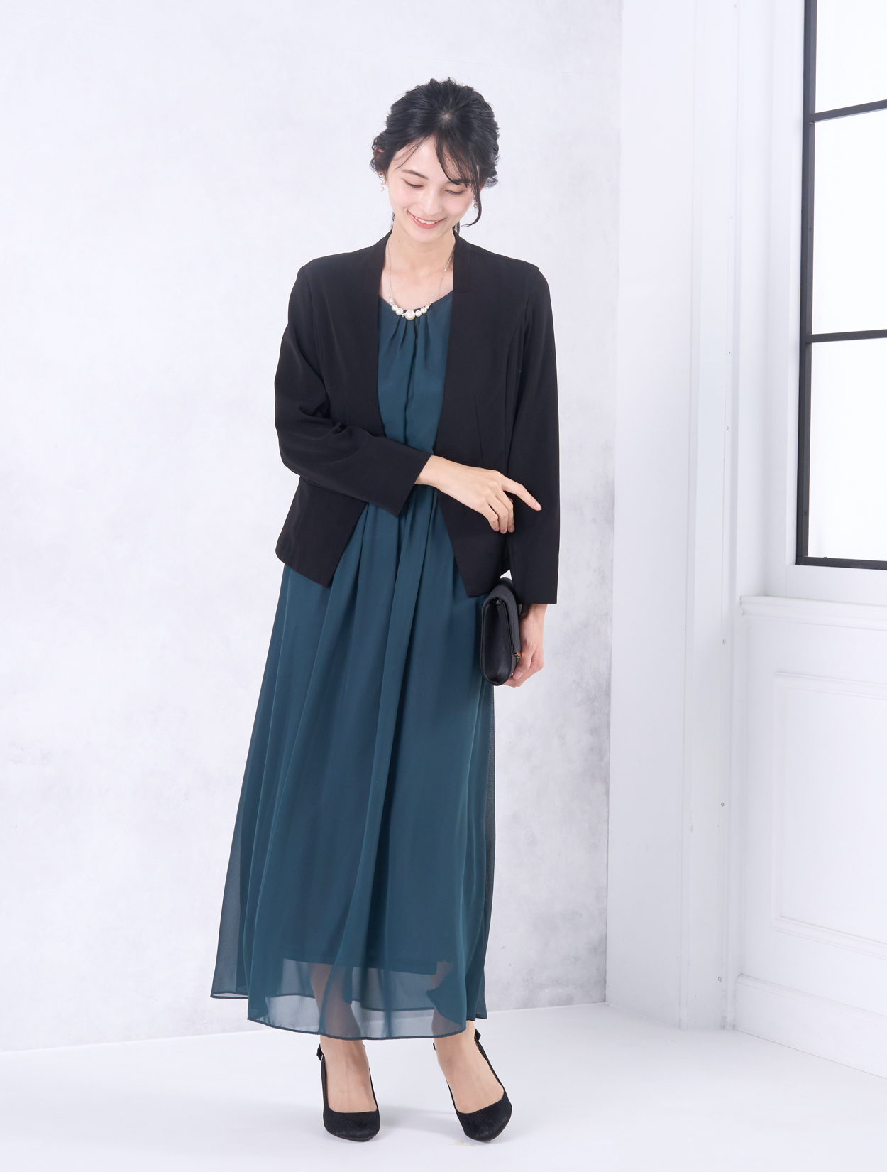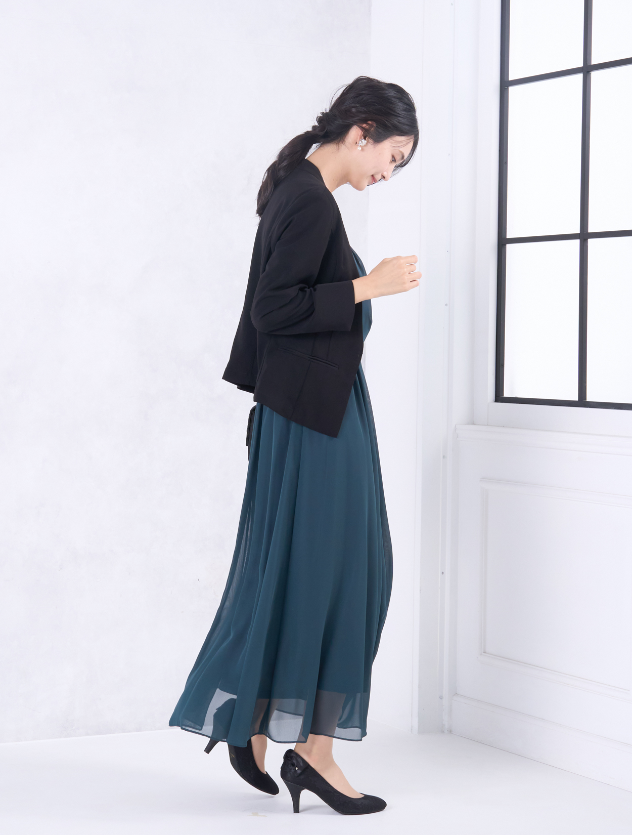ダークグリーンのロングドレスにブラックのジャケットを合わせた親族向きのコーデ。着丈が長めのジャケットは落ち着きときちんと感があり、カラードレスを親族用ドレスにアップデートしてくれます。後姿もスッキリ見えるのもポイントです。