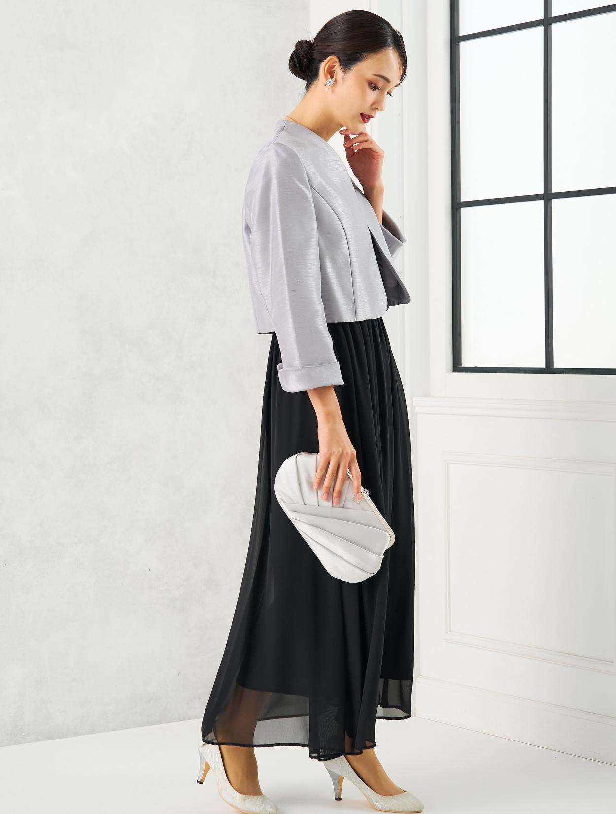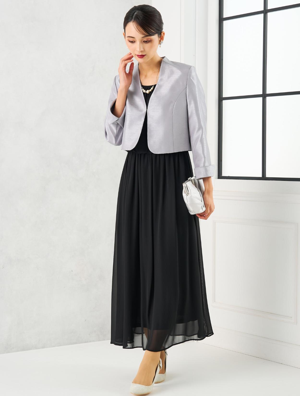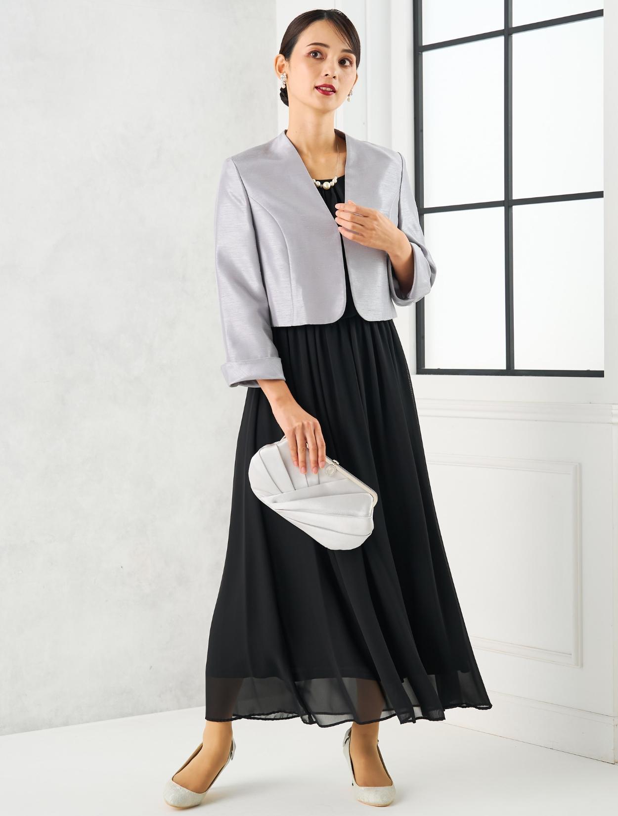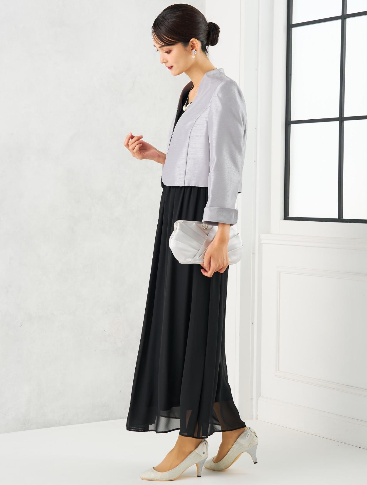 ブラックのロングドレスにグレーのシャンタンジャケットを合わせたシックなコーディネート。高級感のあるシャンタンのジャケットを合わせるだけで、格式ある会場での結婚式でも着られる親族向きのコーデになります。微光沢のあるシャンタンジャケットは、程よいお祝い感もあり◎。