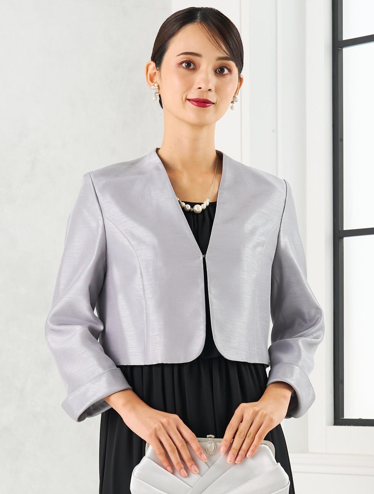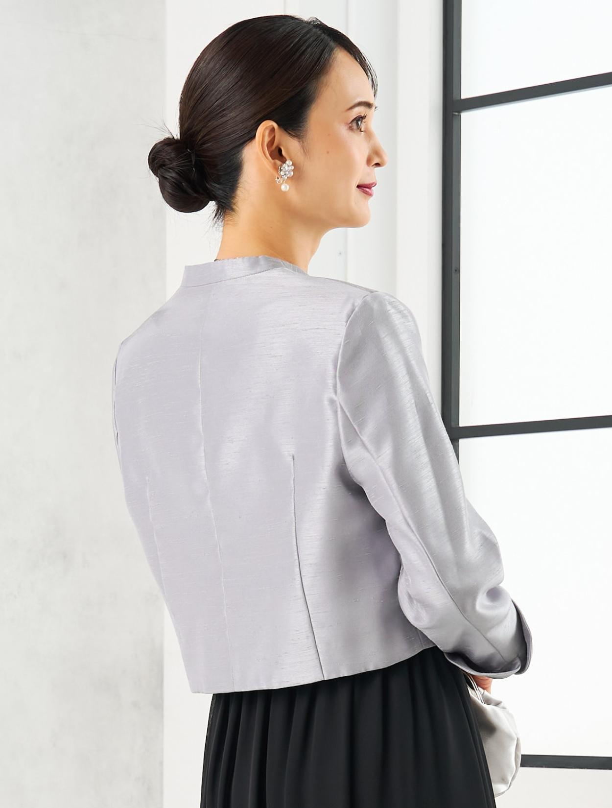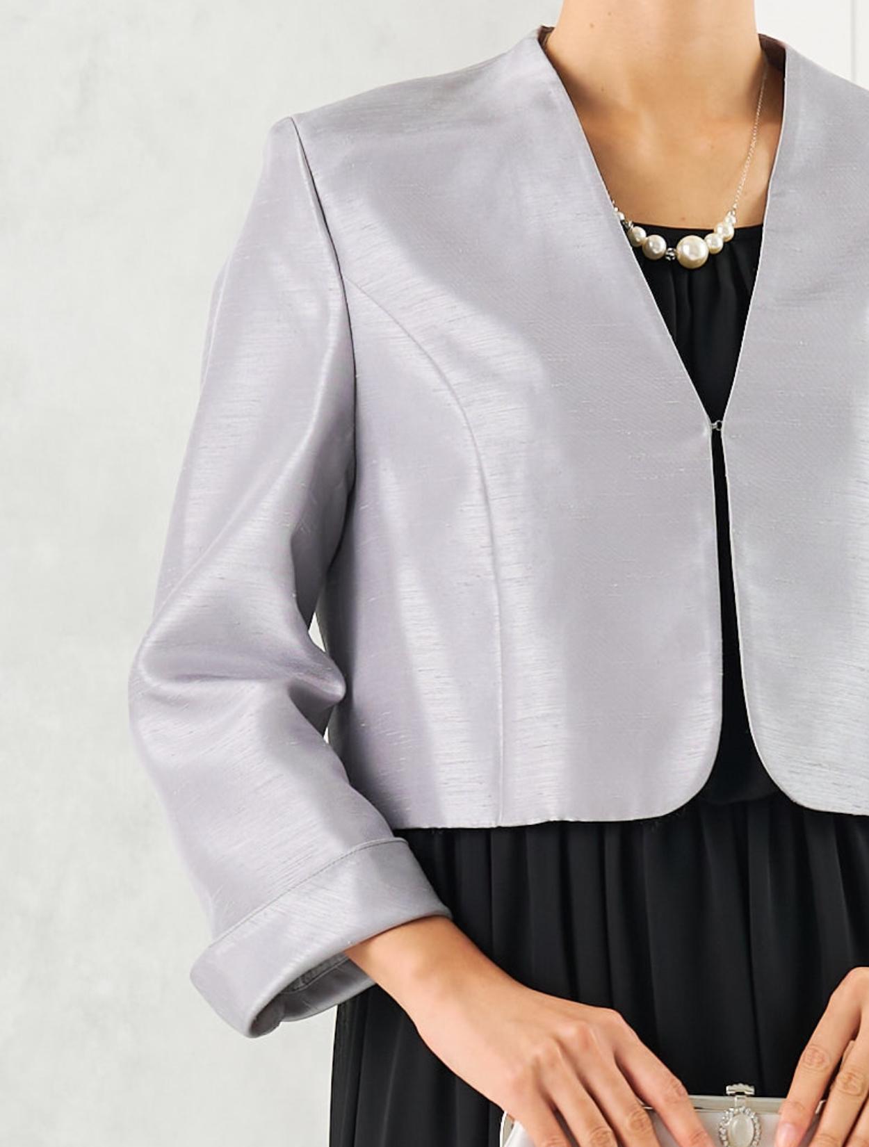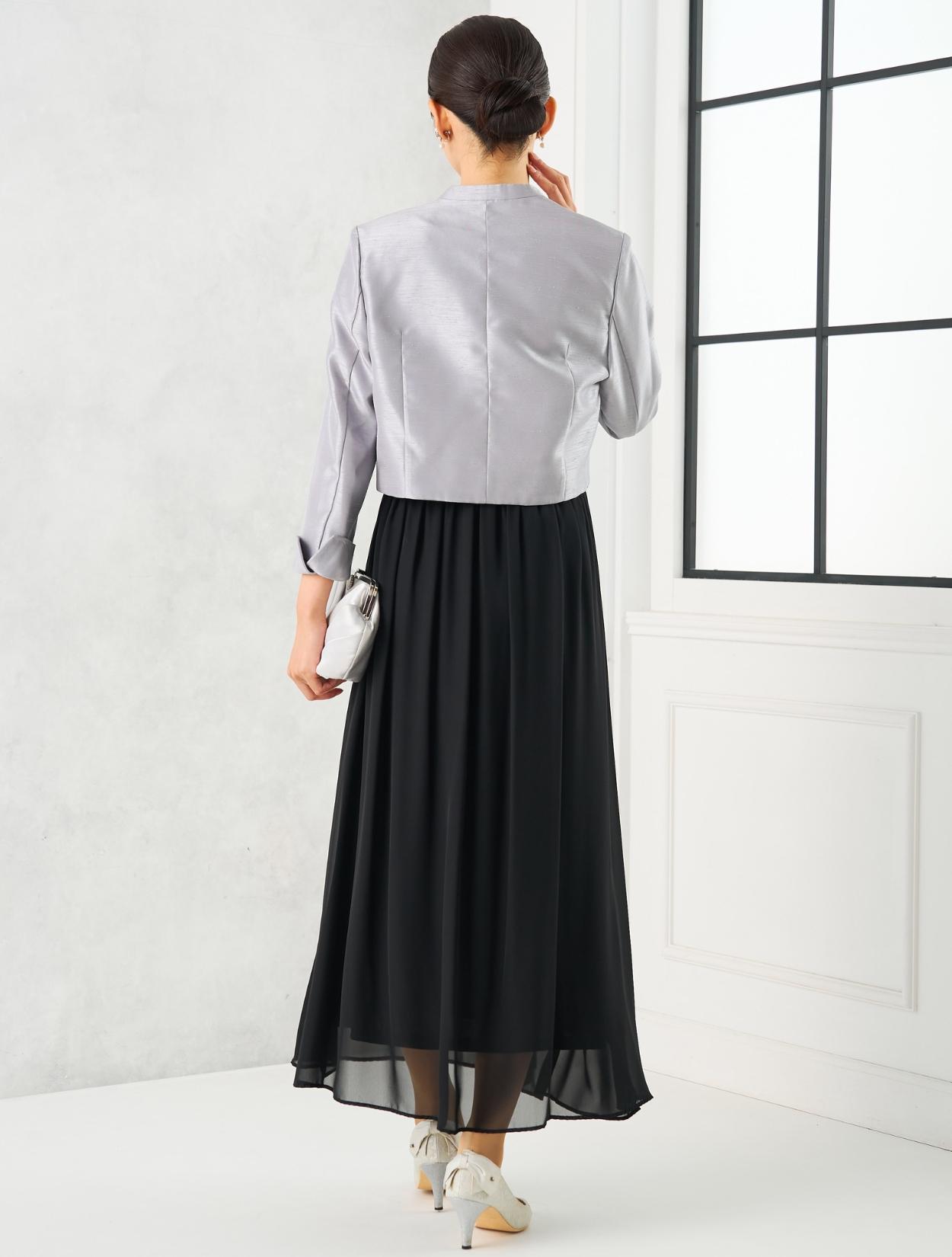 ブラックのロングドレスにグレーのシャンタンジャケットを合わせたシックなコーディネート。高級感のあるシャンタンのジャケットを合わせるだけで、格式ある会場での結婚式でも着られる親族向きのコーデになります。微光沢のあるシャンタンジャケットは、程よいお祝い感もあり◎。