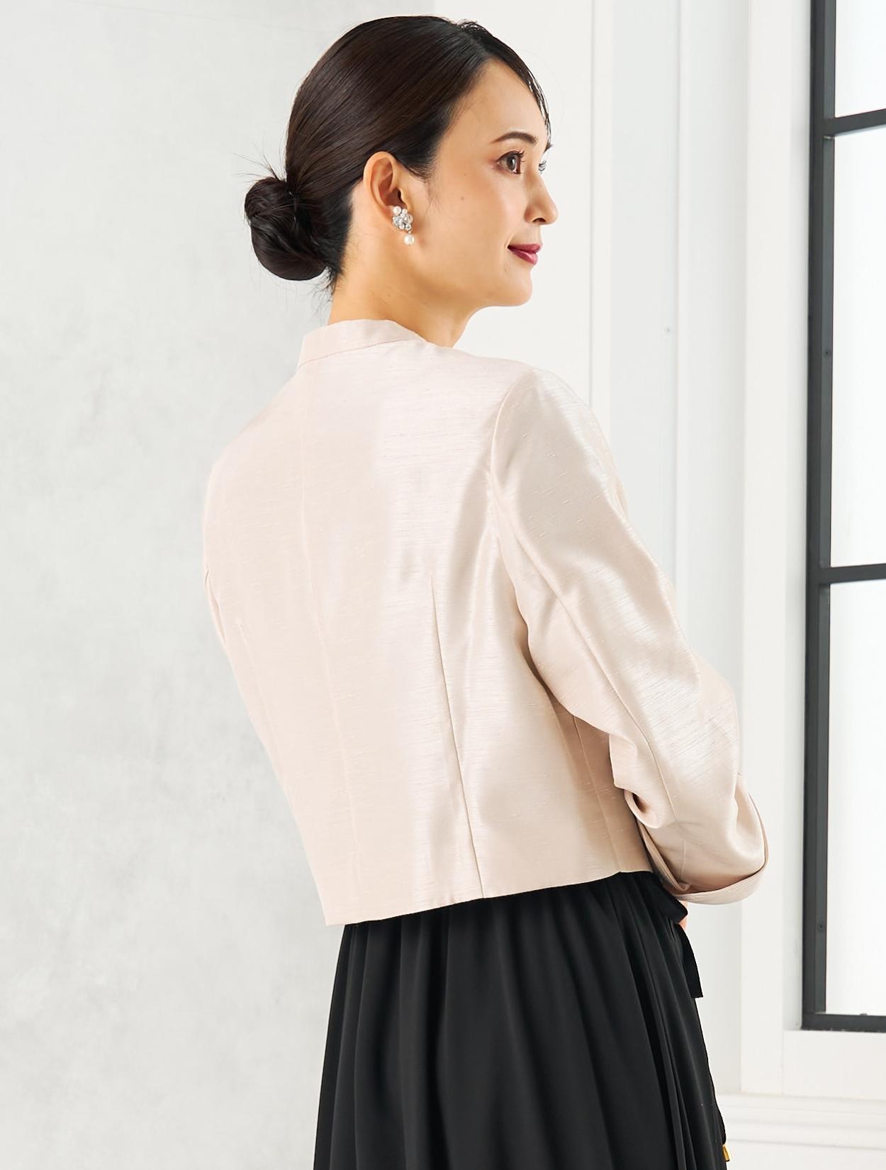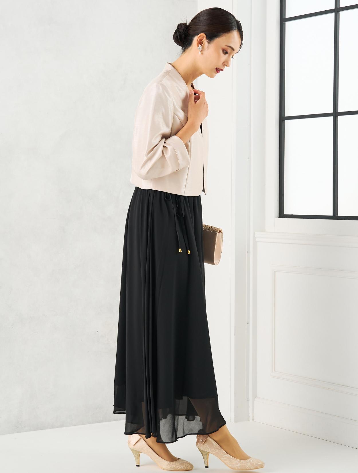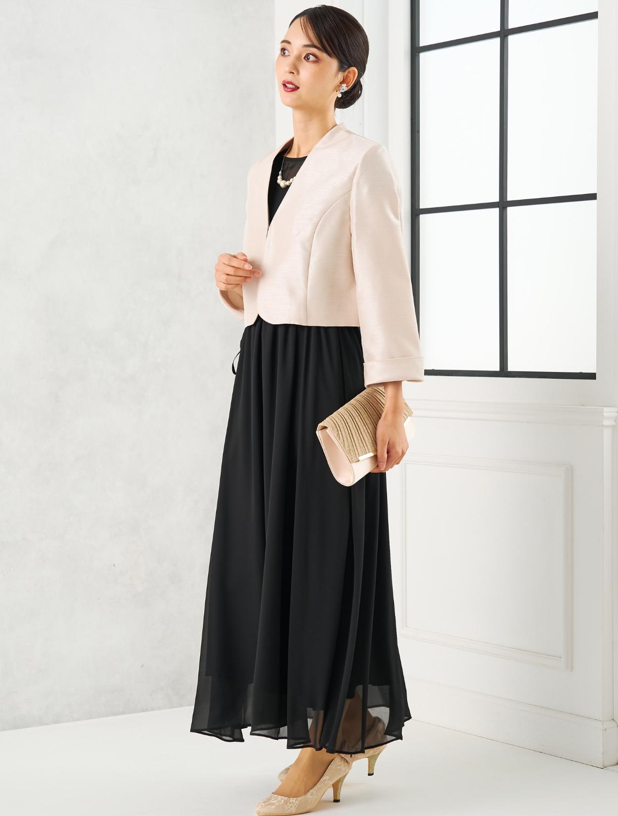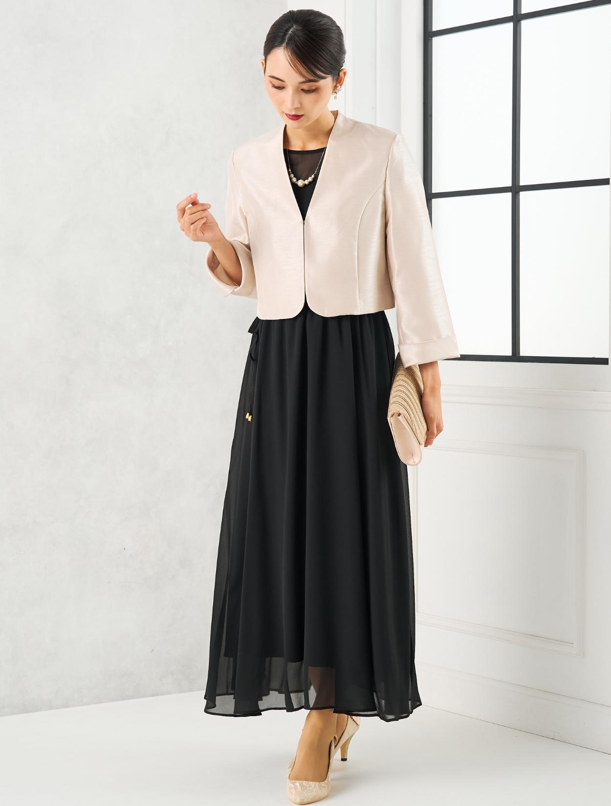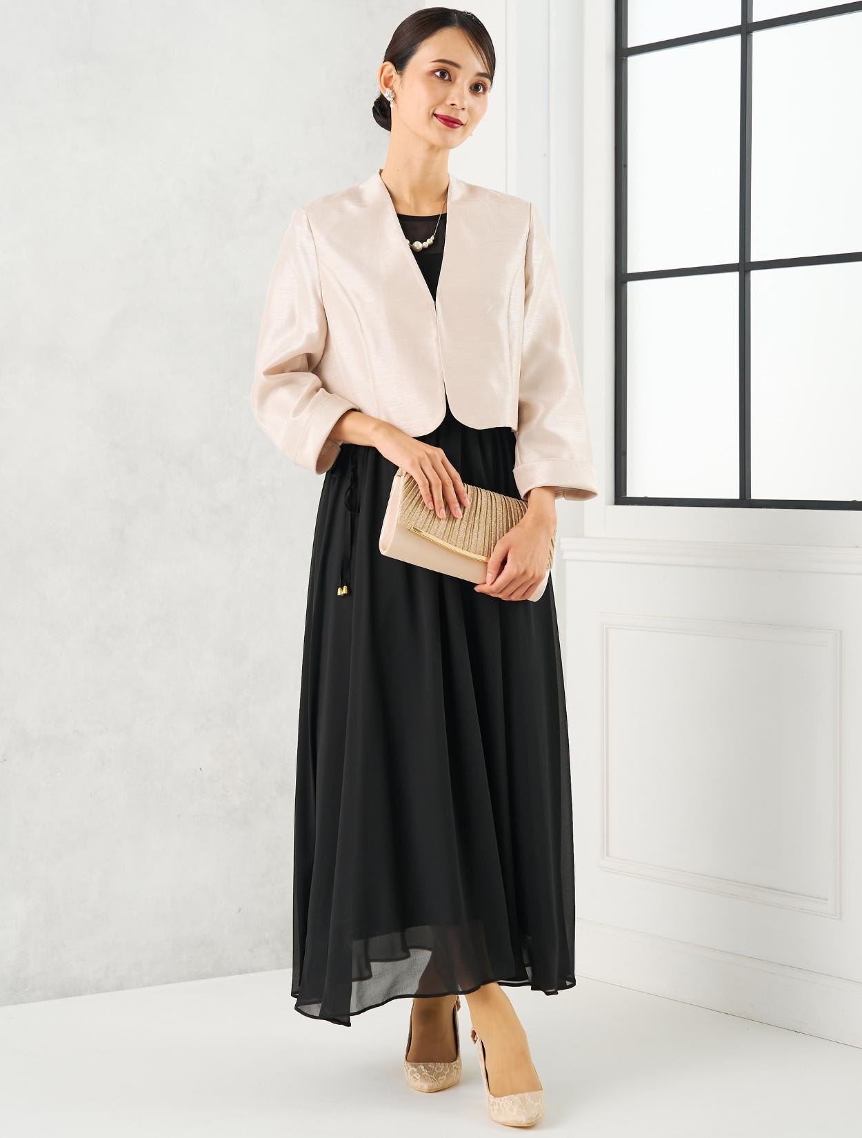 丈が長めのブラックのドレスにグレーのシャンタンジャケットを合わせた親族向きのコーディネート。シャンタン生地は、高級感ときちんと感があり親族にぴったりのアイテム。シックで落ち着いた雰囲気ですが、シャンタンの光沢や華やかなラメのバッグで地味になり過ぎないのもポイント。