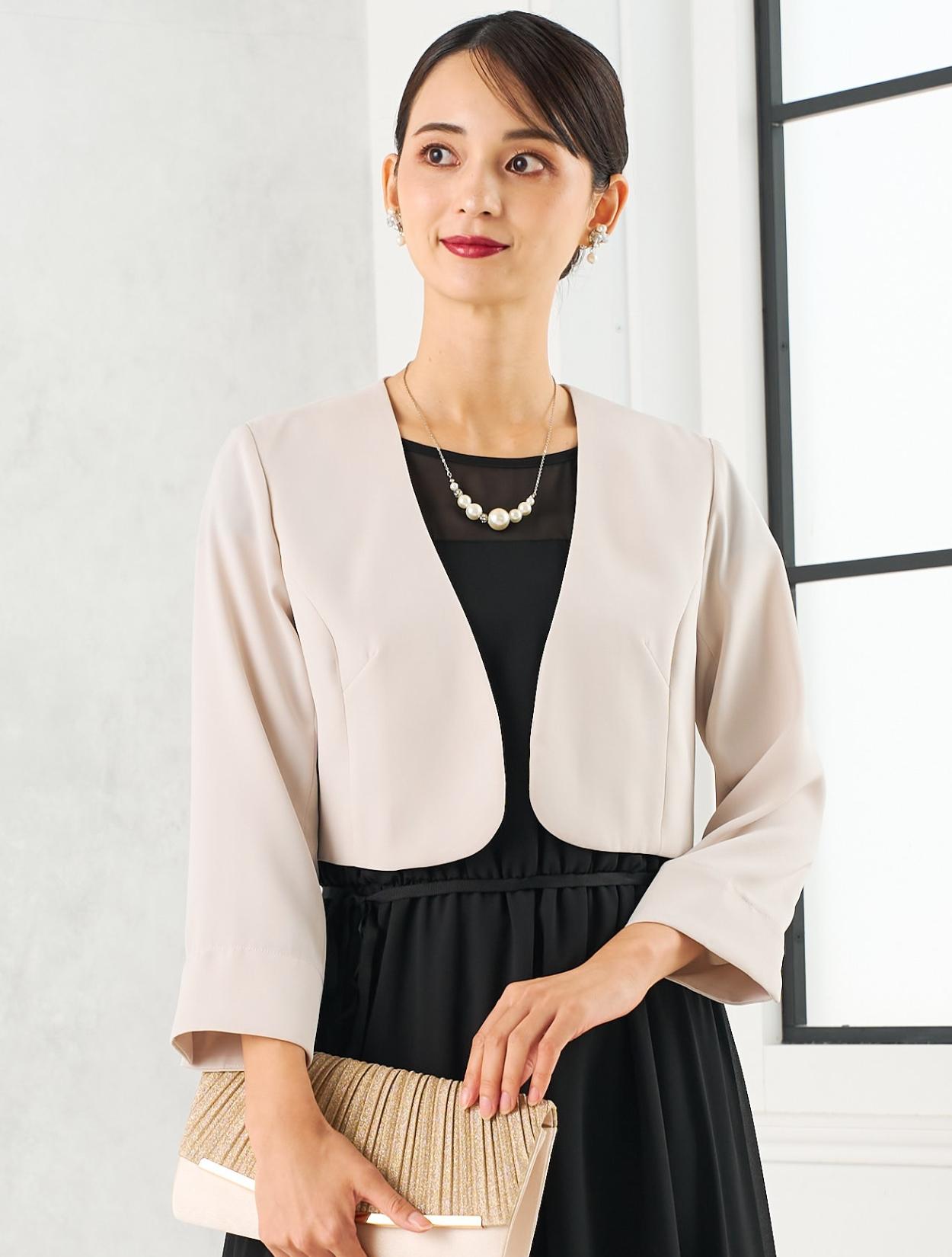 ベージュのジャケットを合わせた華やかで大人っぽい上品コーデ。親族はもちろん、年相応に大人らしい装いがしたい30代〜40代以降におすすめです。ゴールドラメのバッグが華やかで、パーティー感もあり地味になり過ぎません。