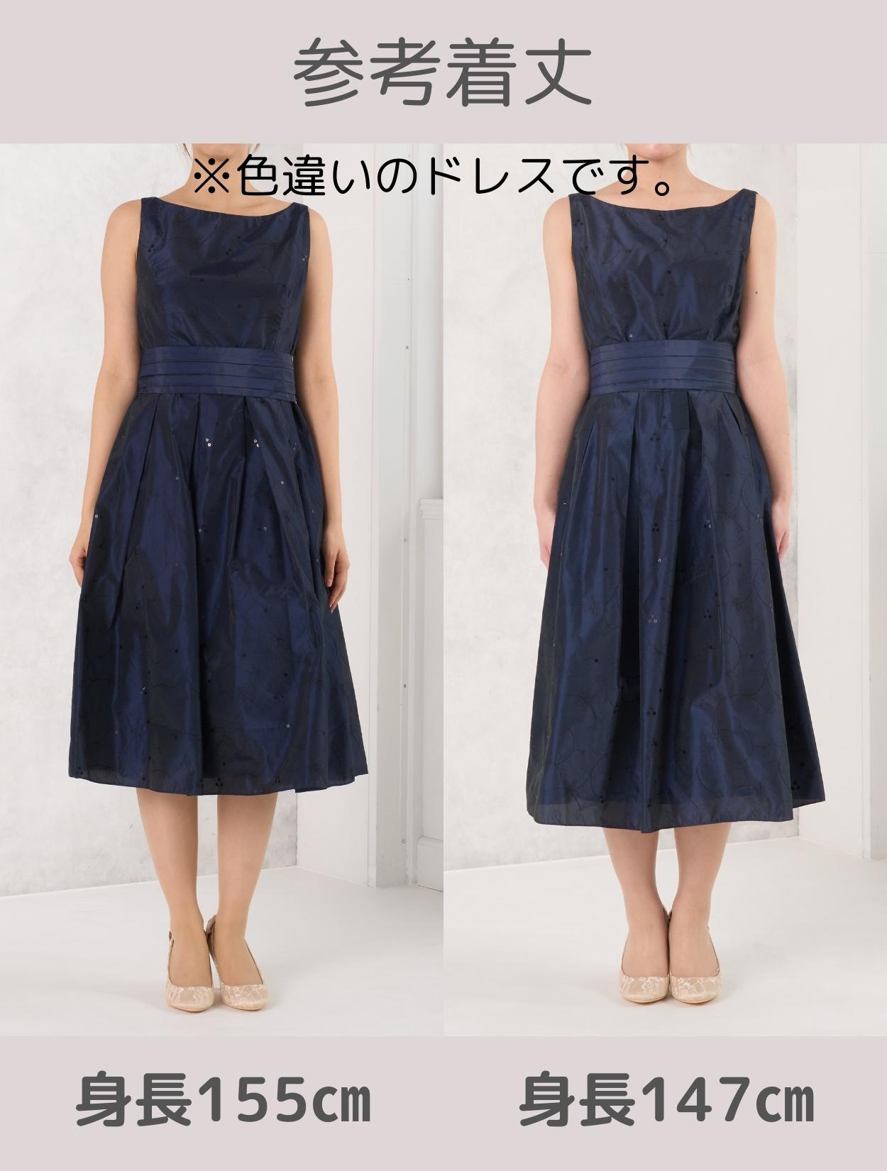 キュッと絞ったウエストからふわっと広がるスカートは、ドレスの定番「フィット&フレア」。ポイントはなんと言ってもスタイルが良く見えること。丈も長過ぎず短過ぎないので、148cm?168cmほどの方まで幅広く着用可能です。生地はハリと高級感のあるタフタ生地。フレアスカートのふんわり感をキープしてくれるので、小柄な方でも足元が重たく見えません。また、腰回りもうまくカバーしてくれるので、ヒップ周りが気になる方にもおすすめです。ウエストのリボンベルトは、前で結ぶと可愛らしく、後ろで結ぶとスッキリ見えます。ドレス全体の刺繍が華やかで、格式高い会場にも映えます。