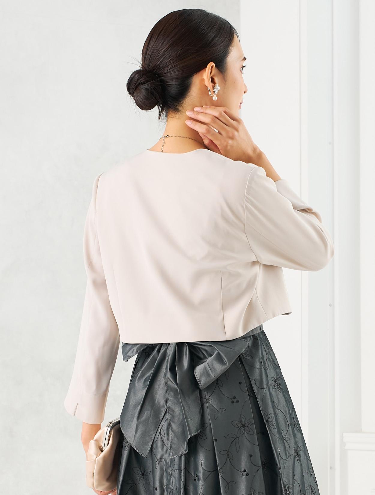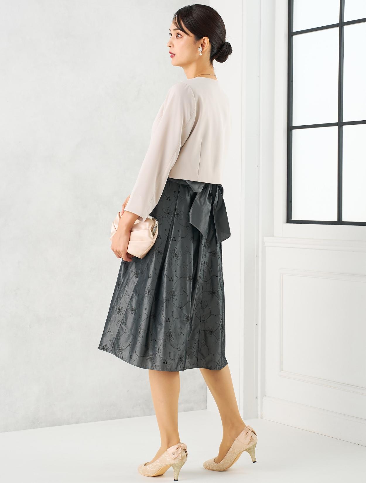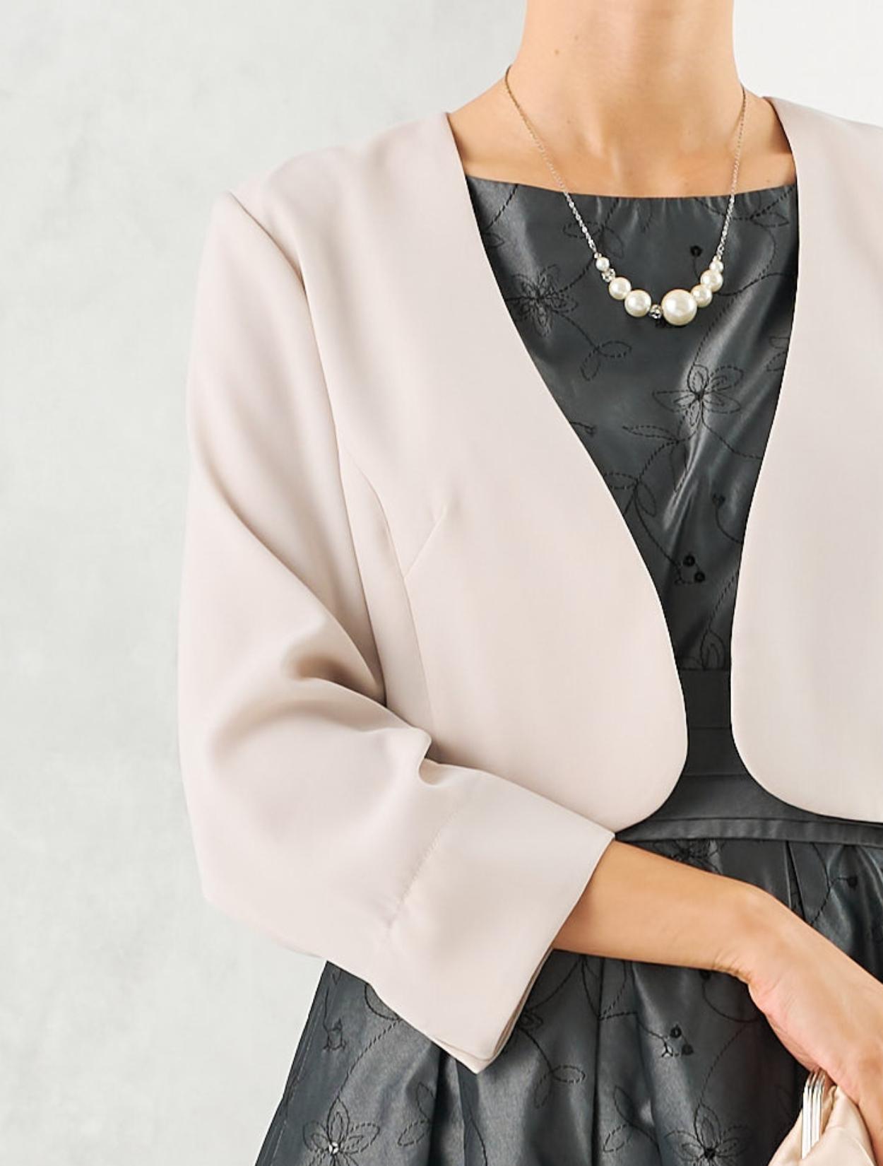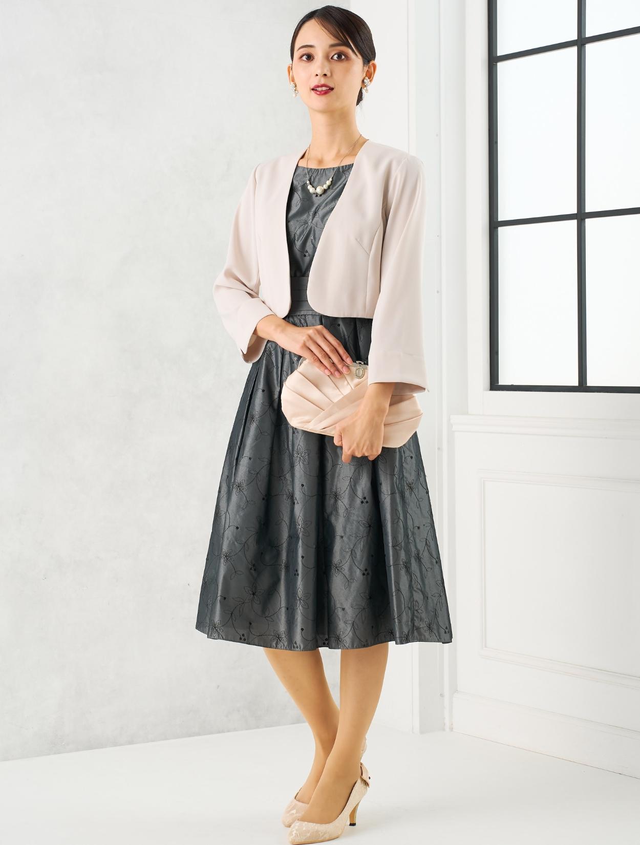 チャコールグレーのドレスにベージュのジャケット合わせた、柔らかく女性らしい雰囲気のコーディネート。ベージュのジャケットは、きちんと感がありながらも華やか。20代後半〜30代の親族や、受付やスピーチをされる方にもおすすめです。