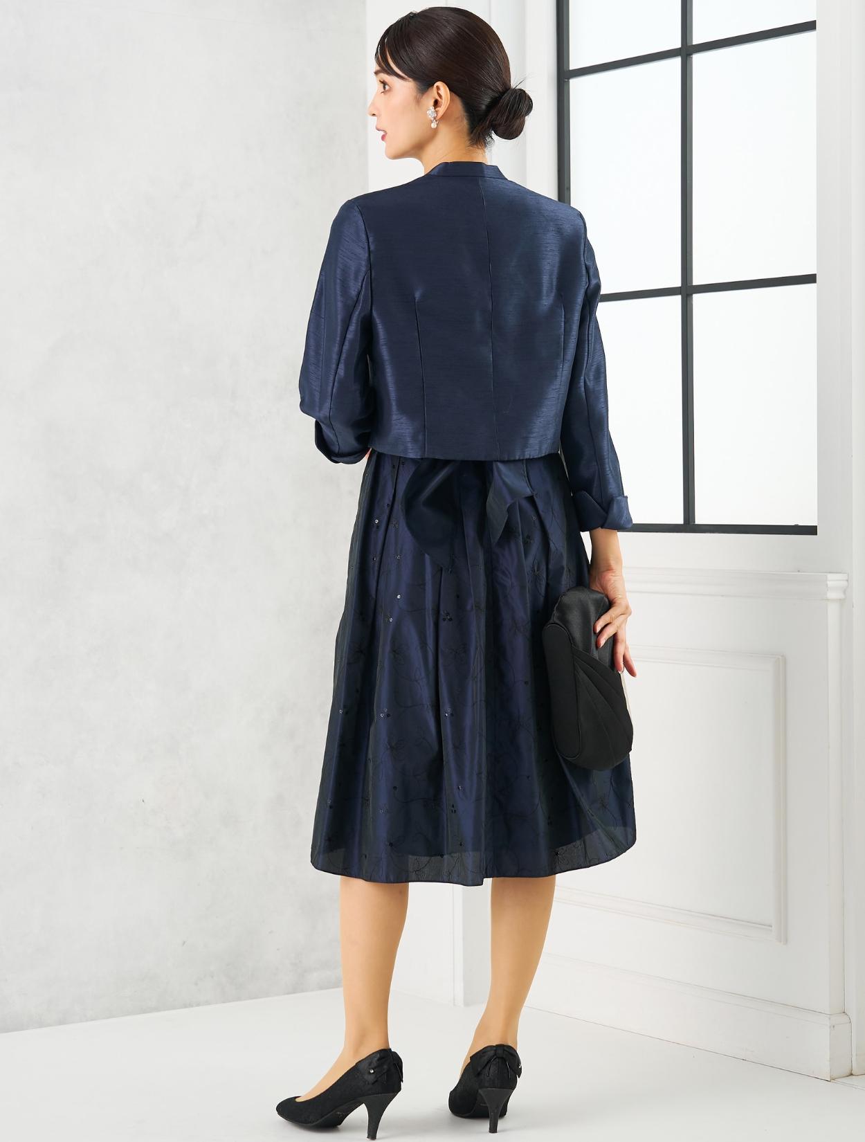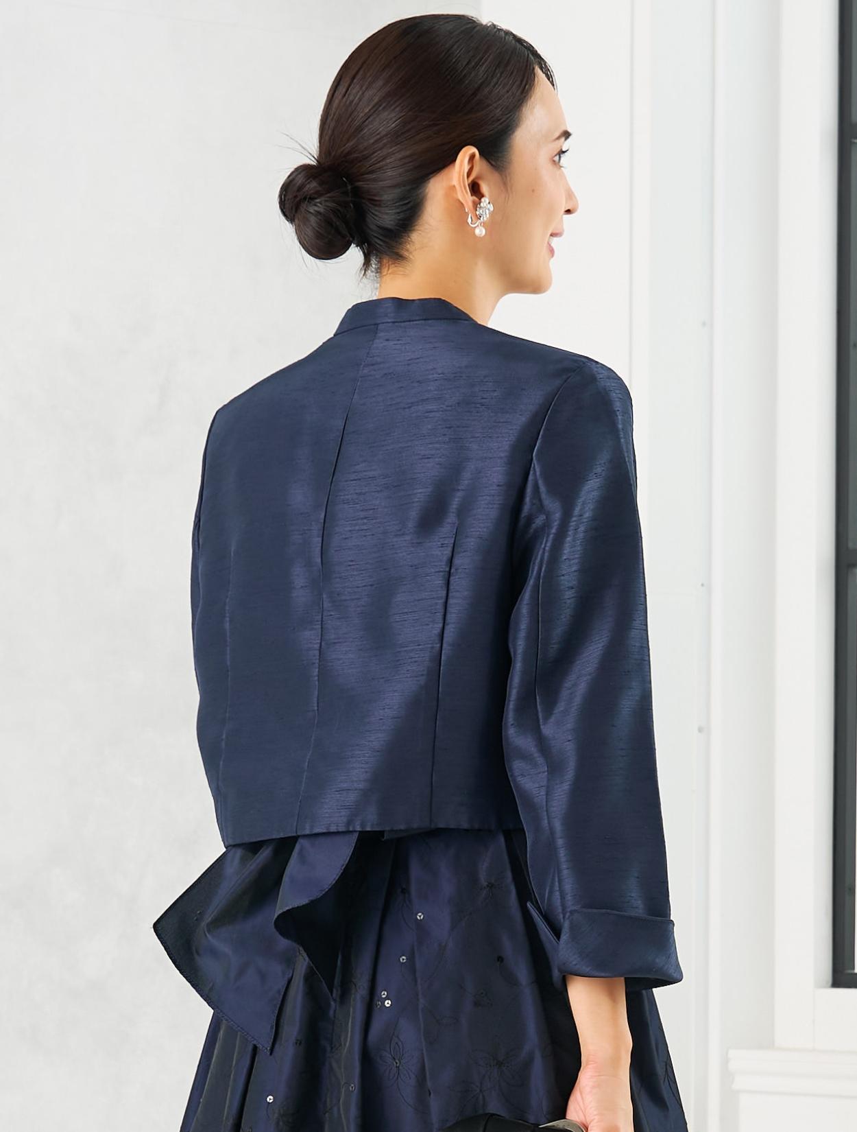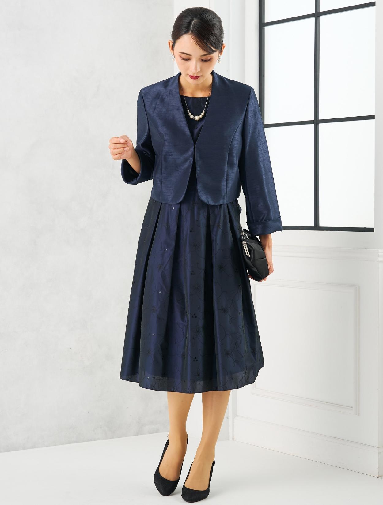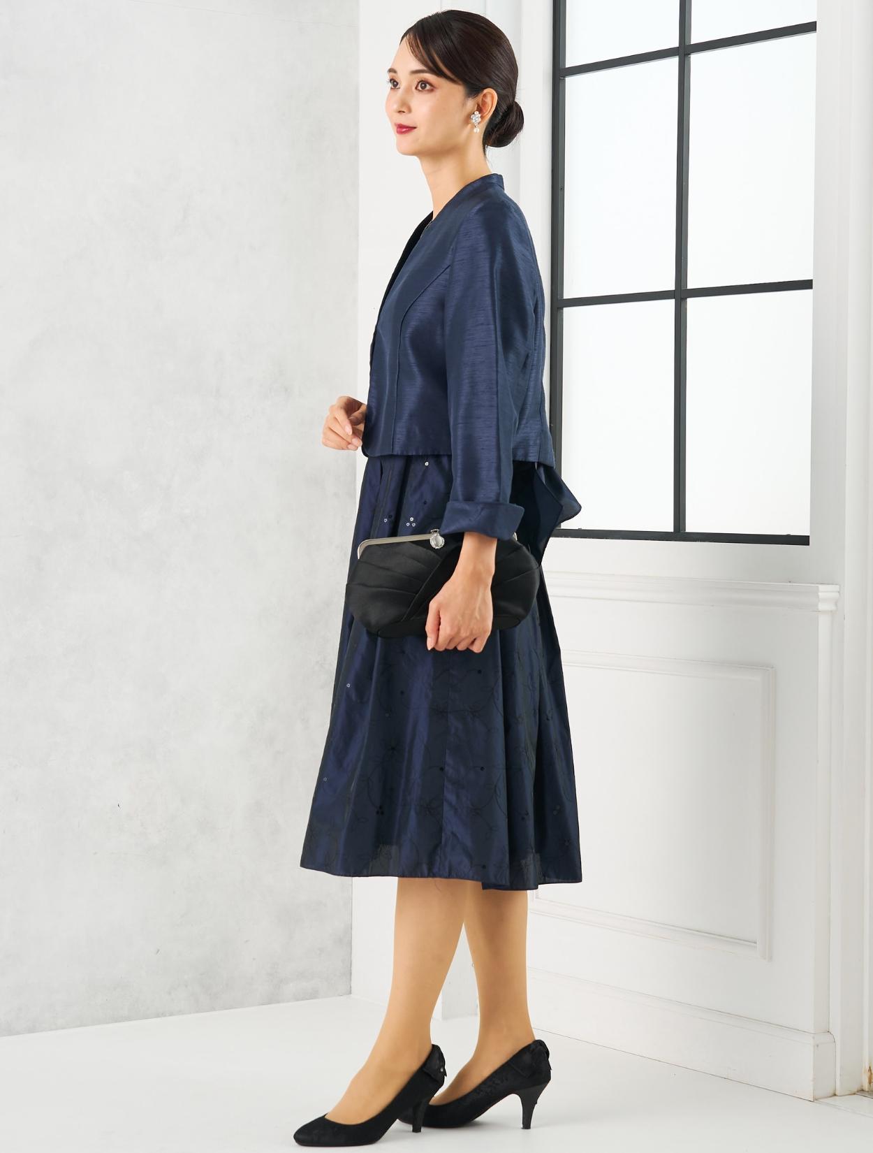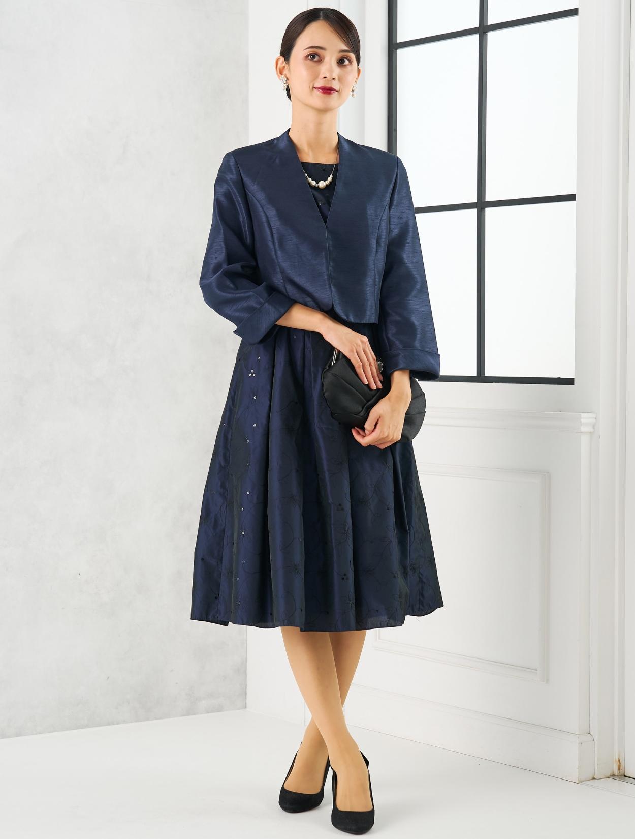 ネイビーのドレスにネイビーのジャケットを合わせた親族向きのコーディネート。単色でまとめたコーデは、フォーマル度もアップするので、特に親族におすすめです。ドレスの生地もジャケットの生地もしっかりしていて高級感があるので、格式ある会場でも心配いりません。