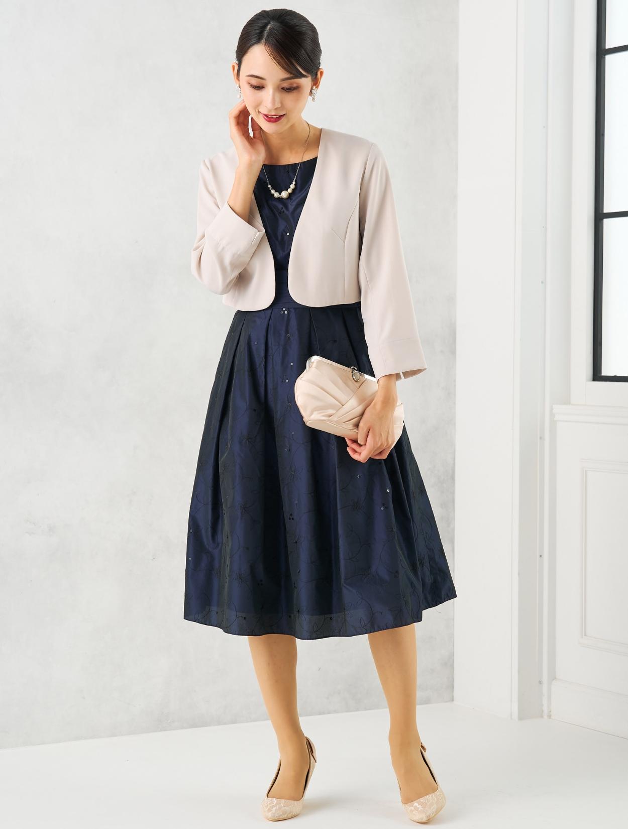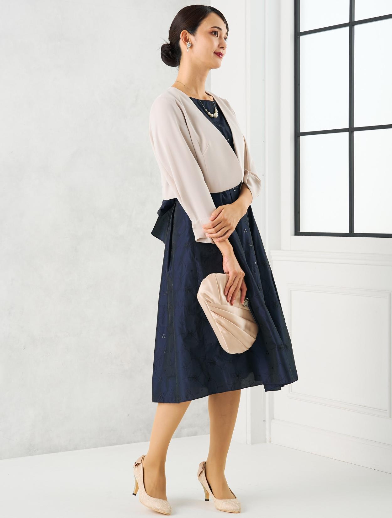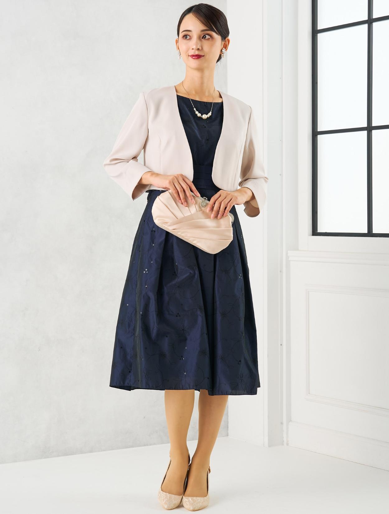 ベージュのジャケットを合わせた上品で女性らしいコーディネート。20代30代の親族や受付をされる方にはもちろん、いくつになってもフレアのスカートがお好きな女性におすすめ。ジャケットを合わせるだけでどんな年齢にも合うきちんと感が出ます。