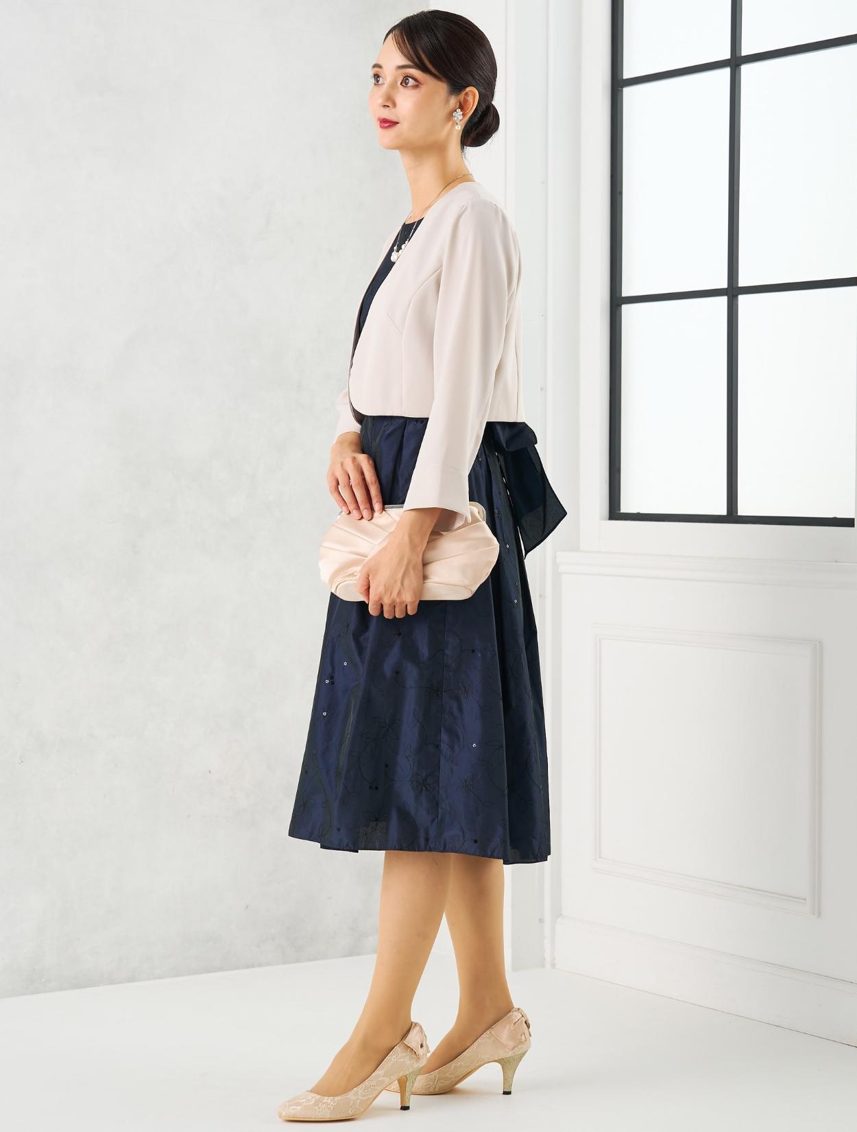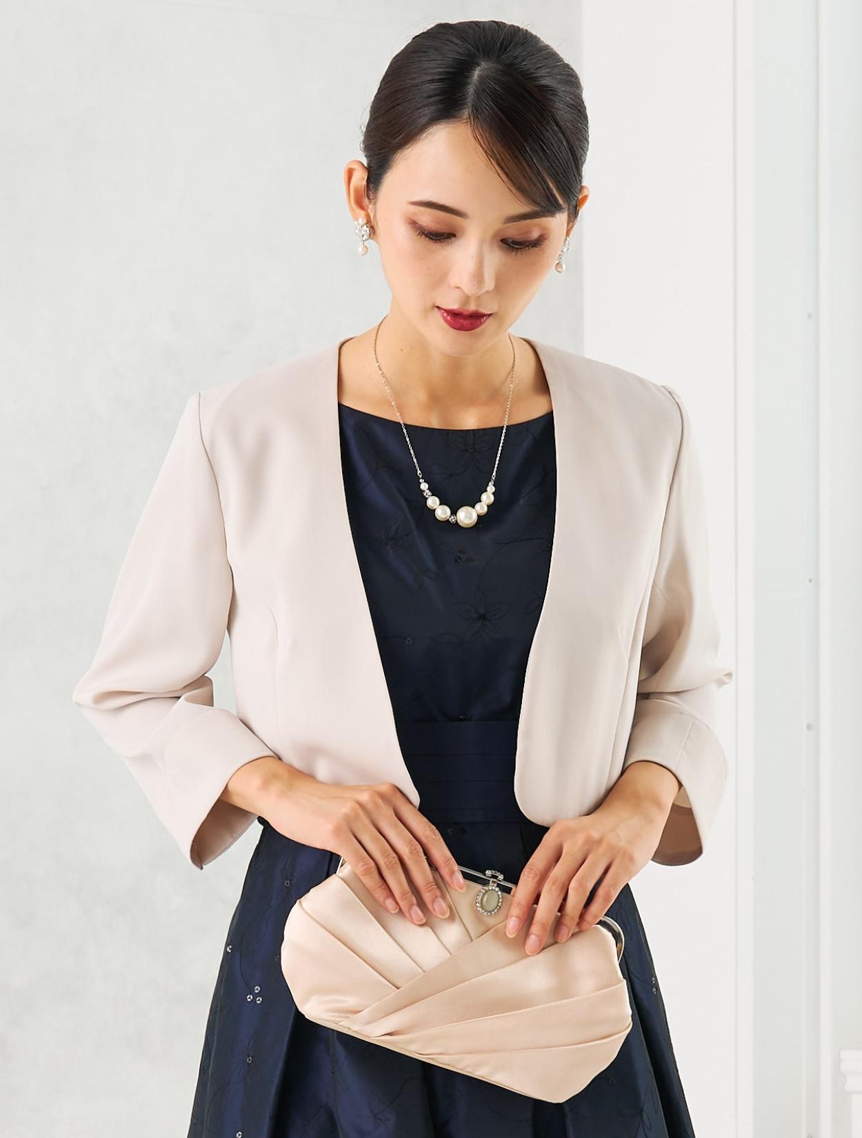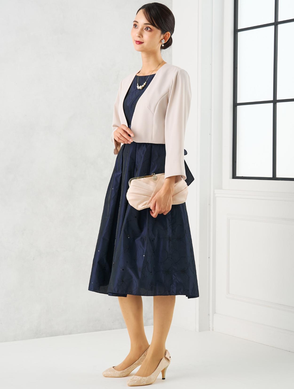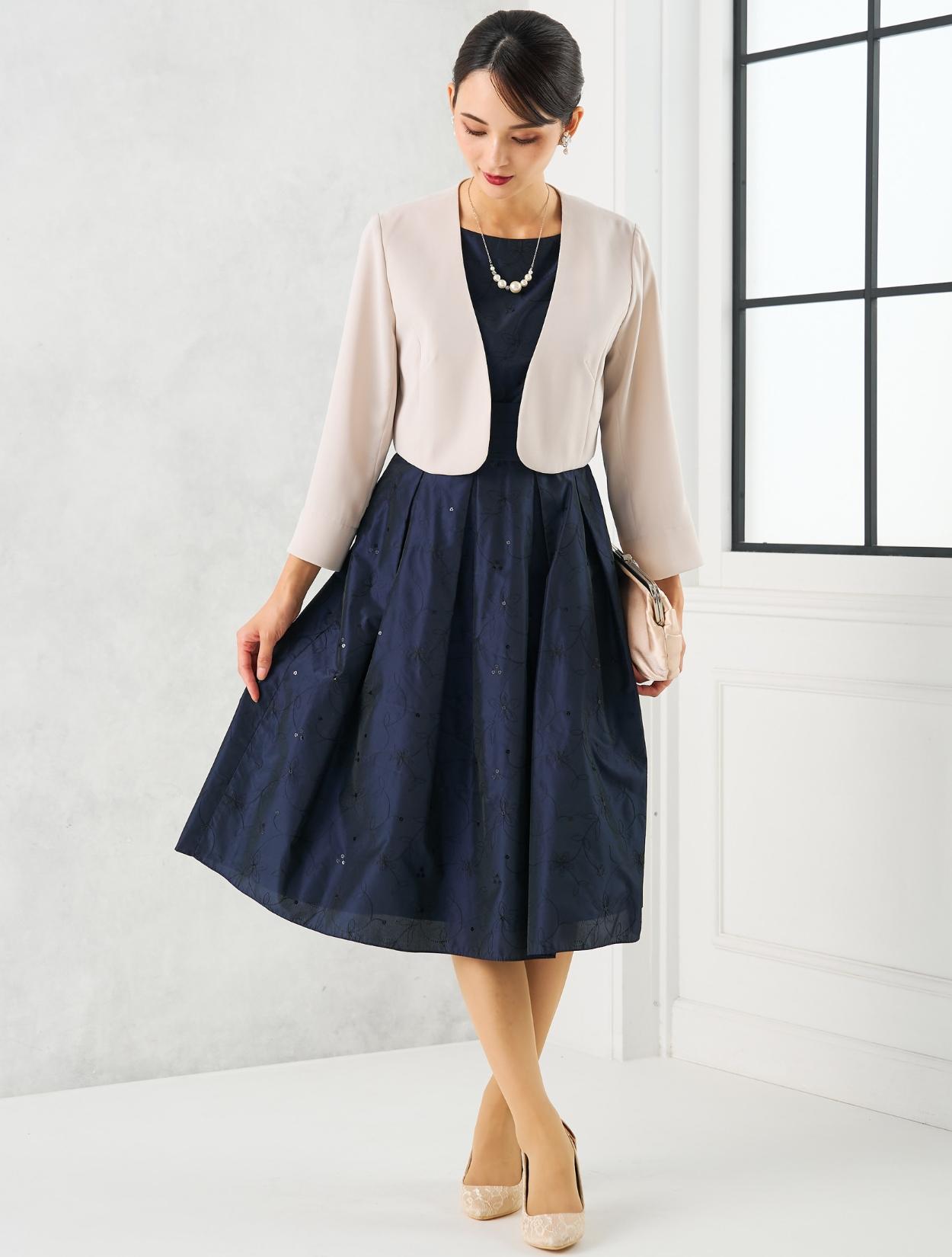 ベージュのジャケットを合わせた上品で女性らしいコーディネート。20代30代の親族や受付をされる方にはもちろん、いくつになってもフレアのスカートがお好きな女性におすすめ。ジャケットを合わせるだけでどんな年齢にも合うきちんと感が出ます。