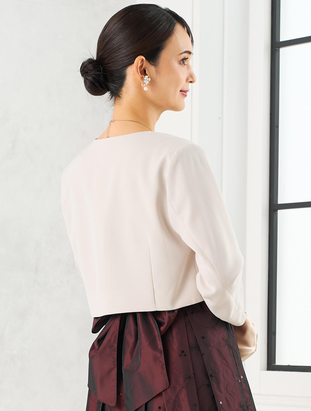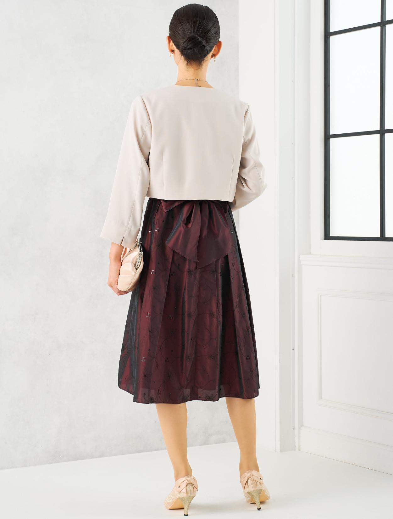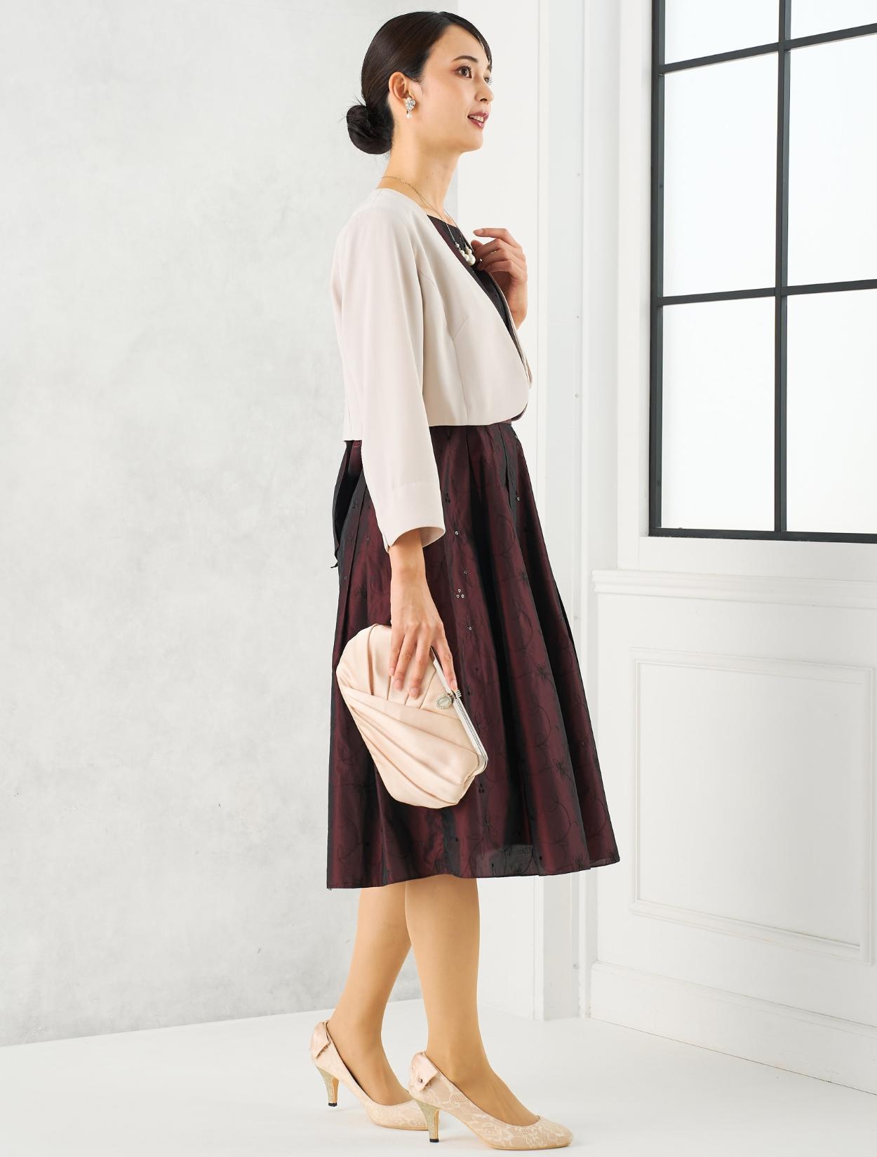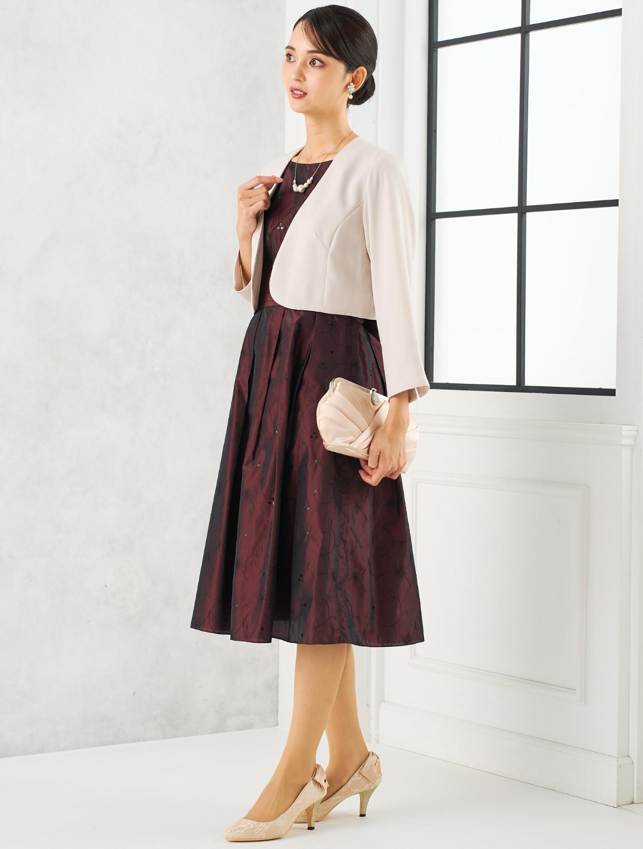 ボルドーのドレスにベージュのジャケットを合わせた若々しく上品なコーディネート。きちんと感のあるジャケットは、20代30代の親族・受付・スピーチをされる方にもおすすめのコーデです。