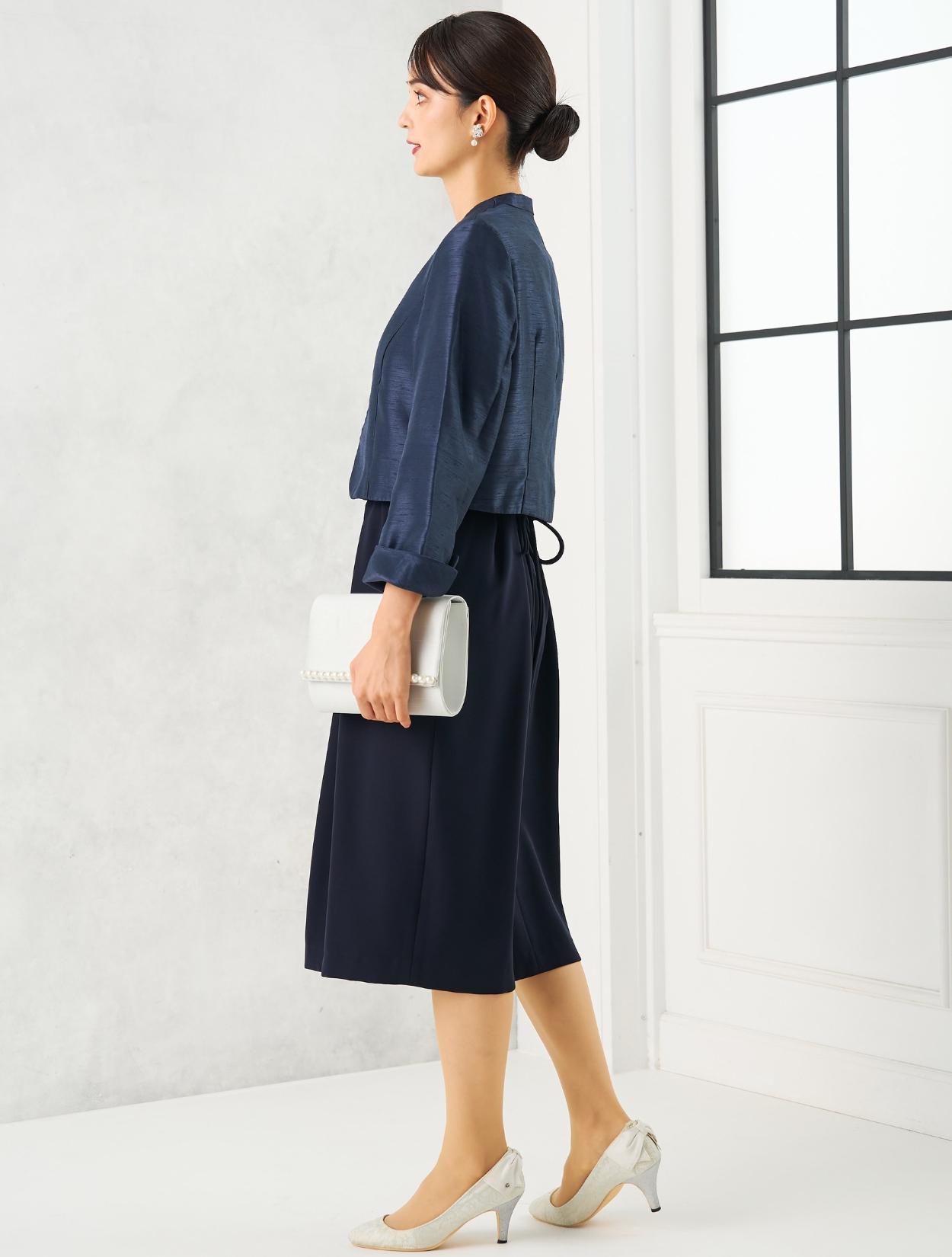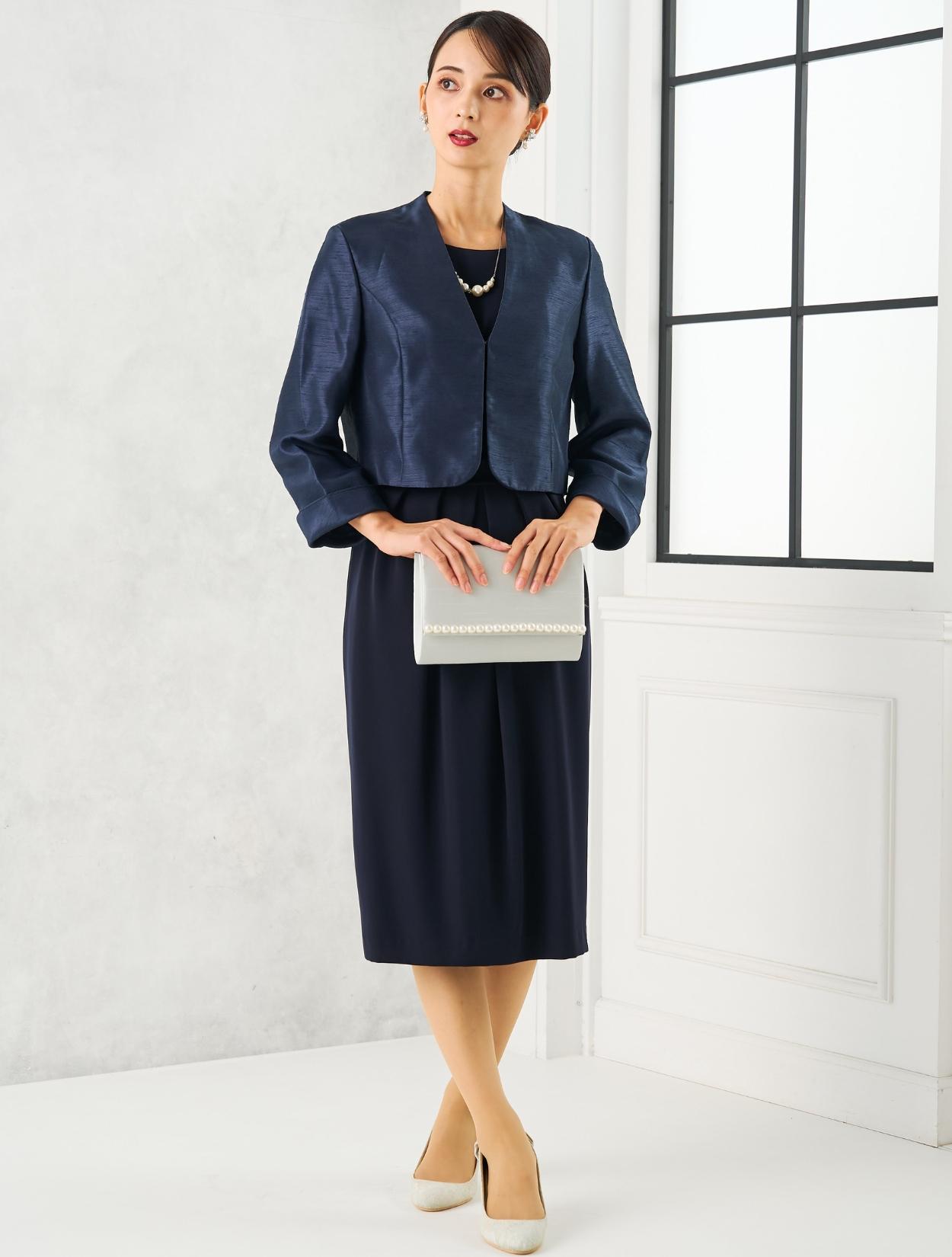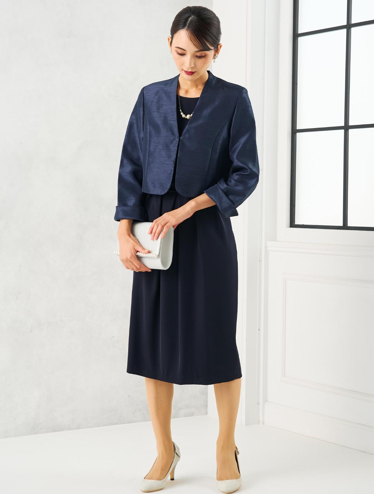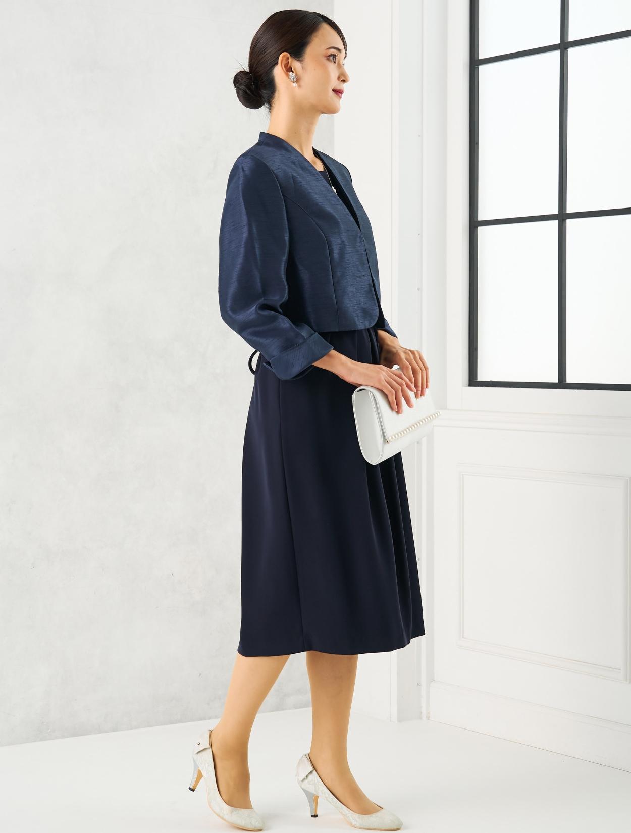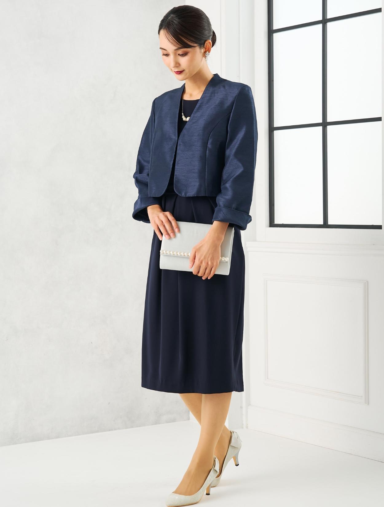 ネイビーのドレスにネイビーのシャンタンジャケットを合わせたフォーマル度の高い親族向きコーディネート。ドレスの生地もジャケットの生地も高級感があるので、格式ある会場にも馴染みます。親族はもちろん、お母様用の顔合わせ用ワンピースとしてもおすすめです。