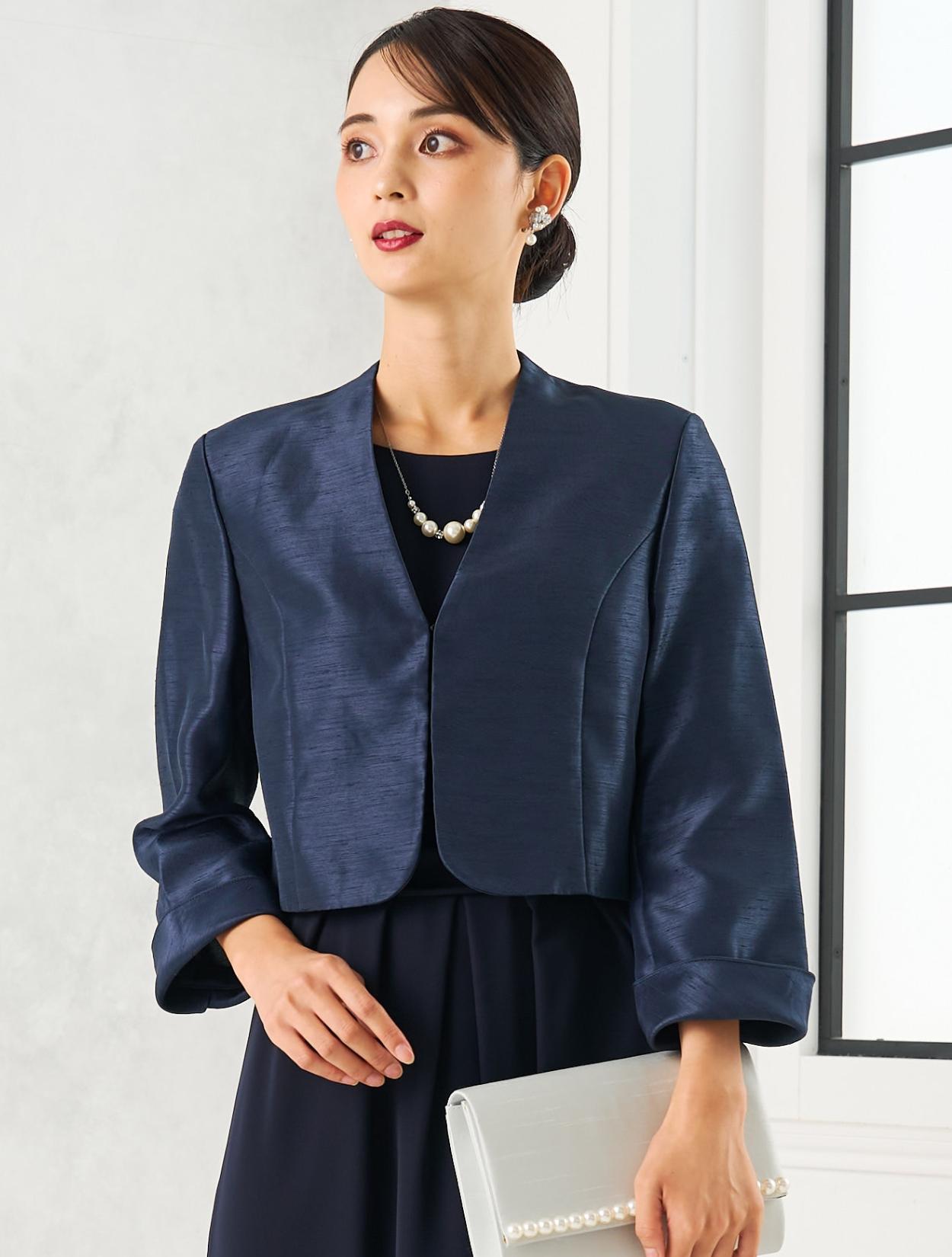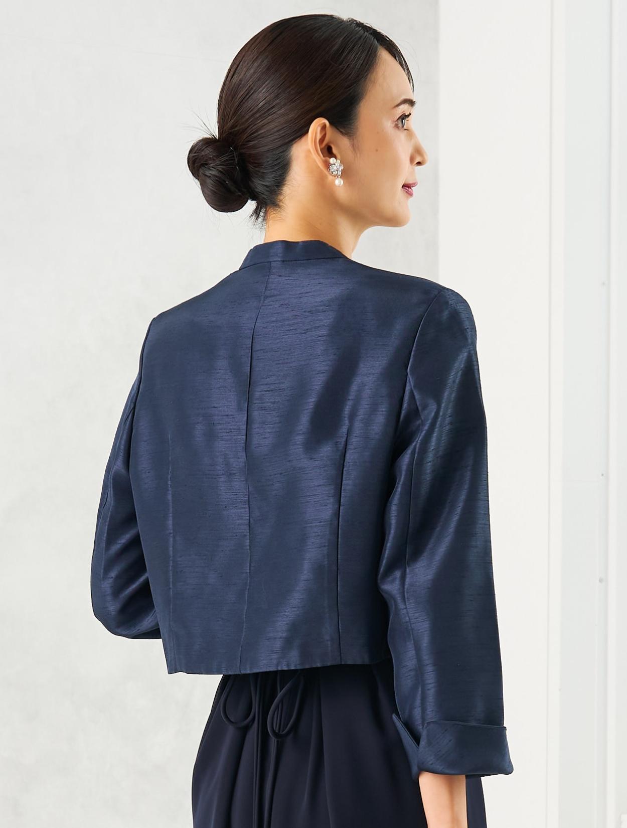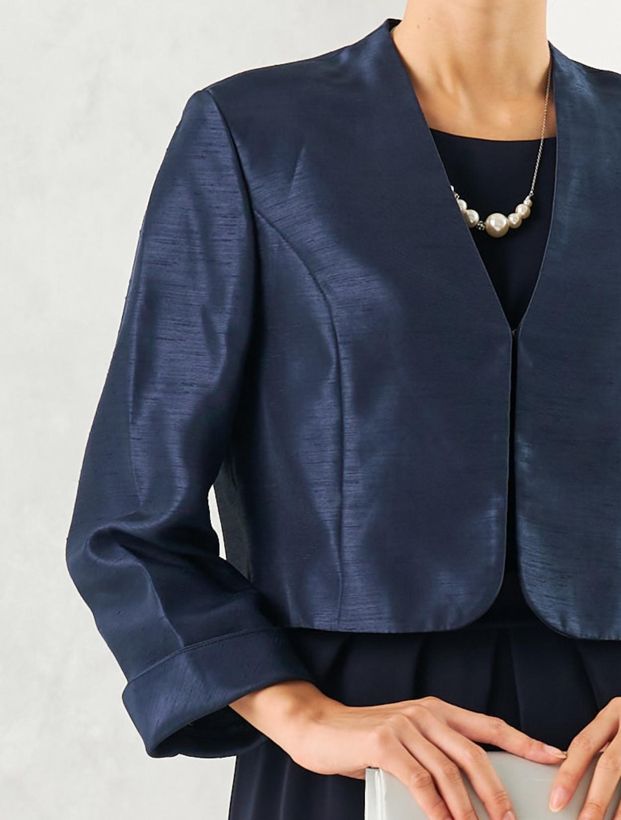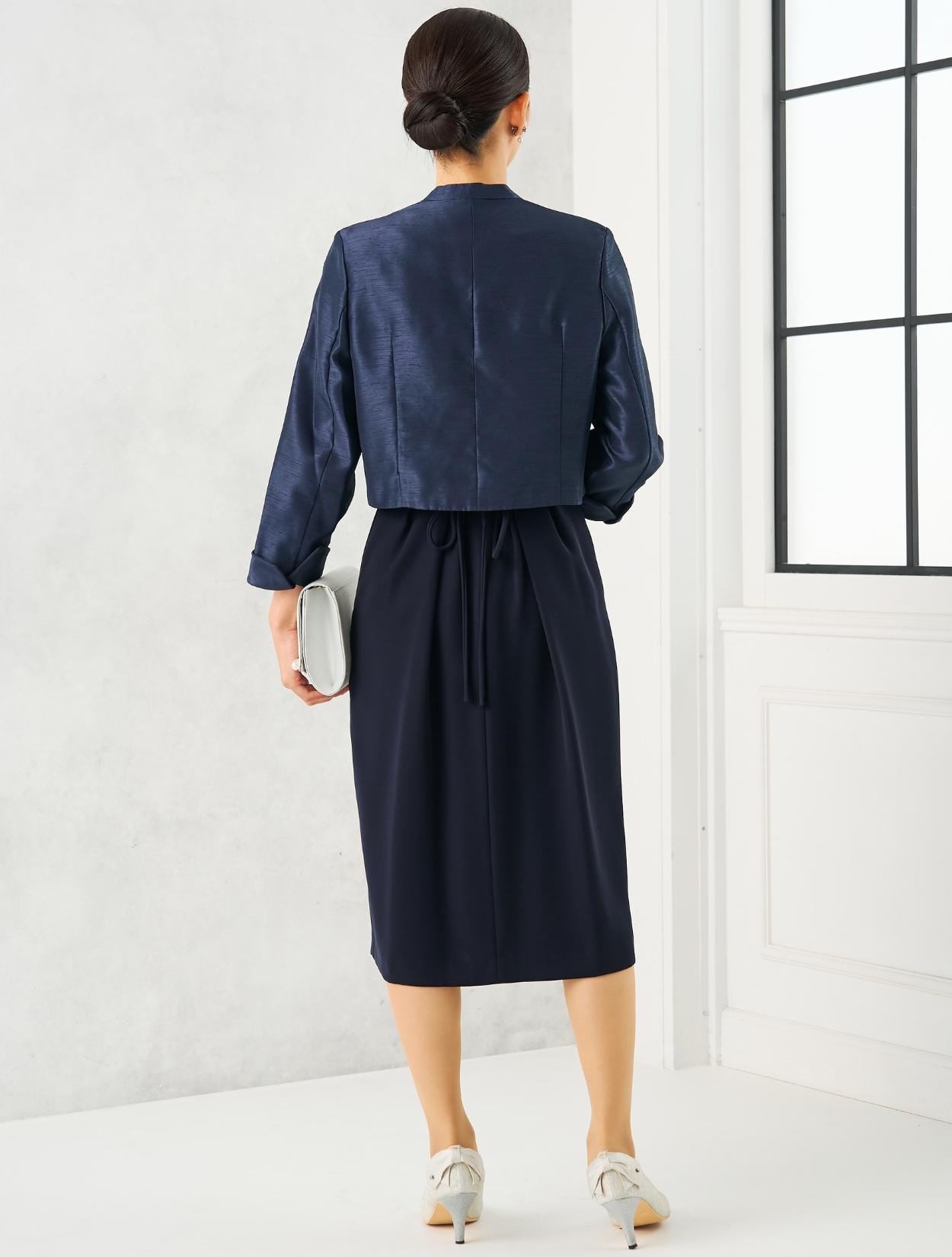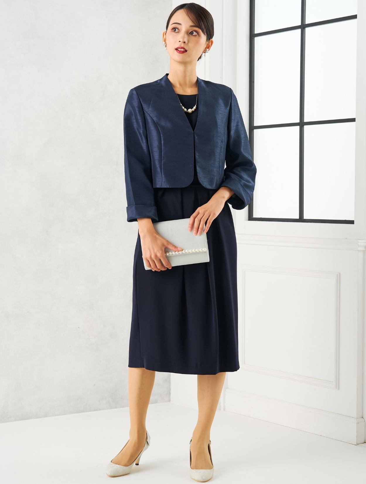 ネイビーのドレスにネイビーのシャンタンジャケットを合わせたフォーマル度の高い親族向きコーディネート。ドレスの生地もジャケットの生地も高級感があるので、格式ある会場にも馴染みます。親族はもちろん、お母様用の顔合わせ用ワンピースとしてもおすすめです。
