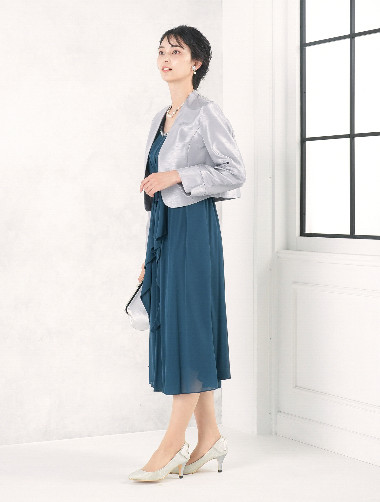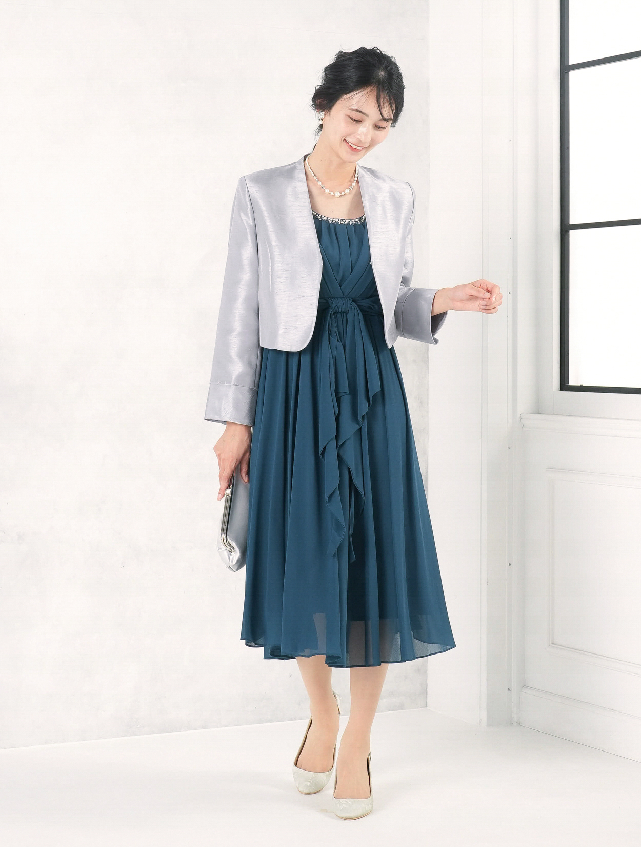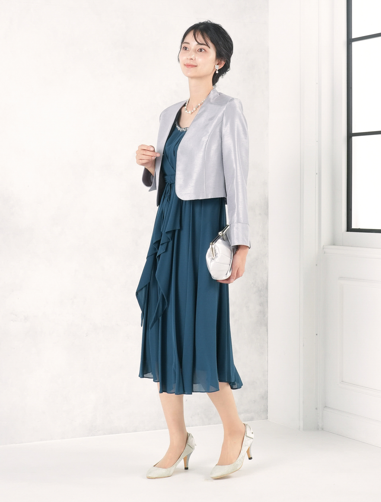 グリーンのドレスにグレーのシャンタンジャケットを合わせたコーディネート。きちんと感がありながらも地味にならないコーデなので、親族でもカラードレスが着たい方におすすめです。
