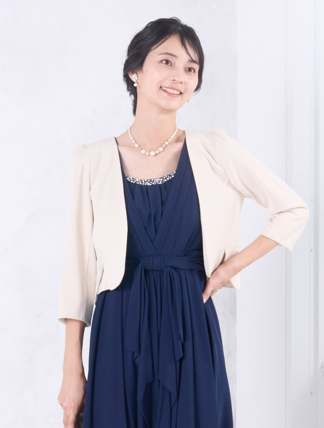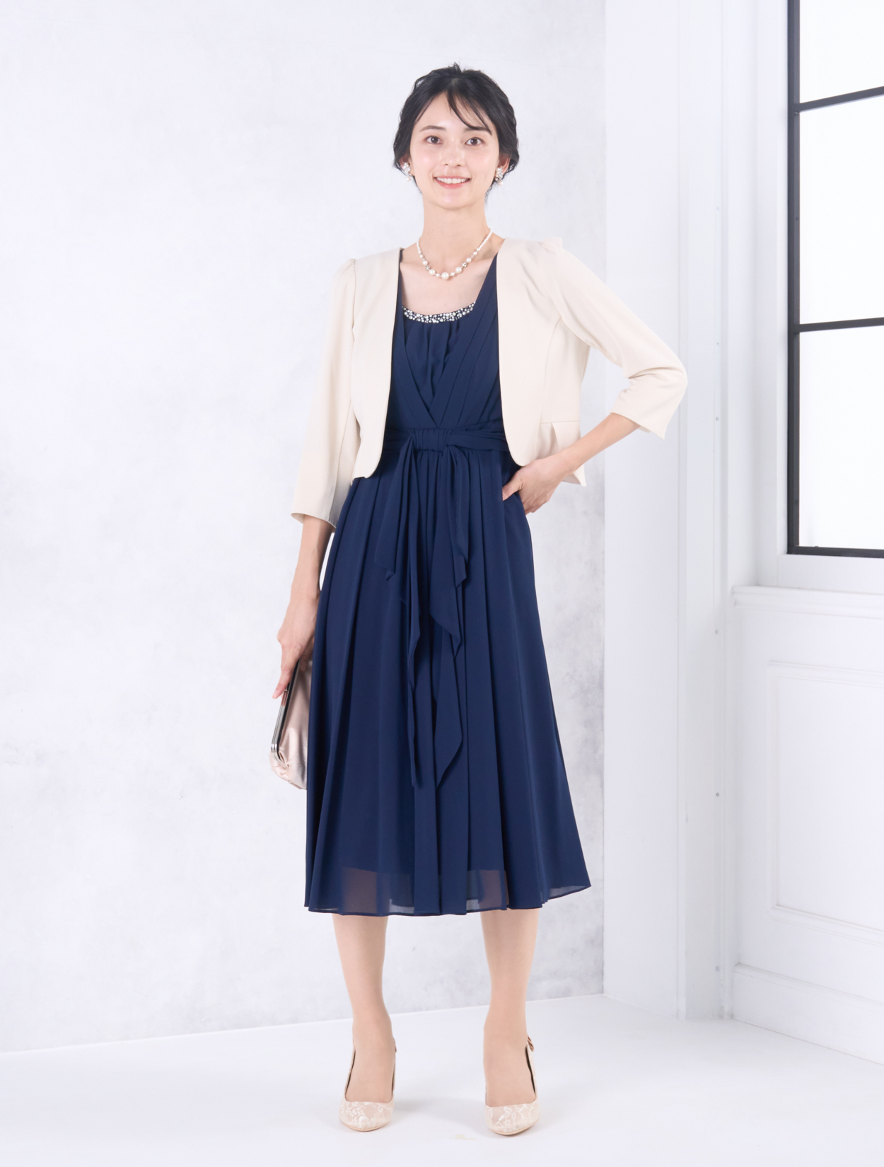 ベージュのジャケットが上品で華やかなコーディネート。きちんと感がありながらも、お顔映りも明るくしてくれます。20代後半から30代以降の親族ドレスとしてもおすすめです。また、きちんと感のあるスタイルで受付やスピーチをされたい方にも◎。