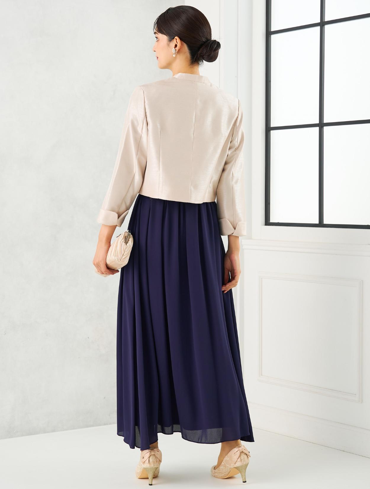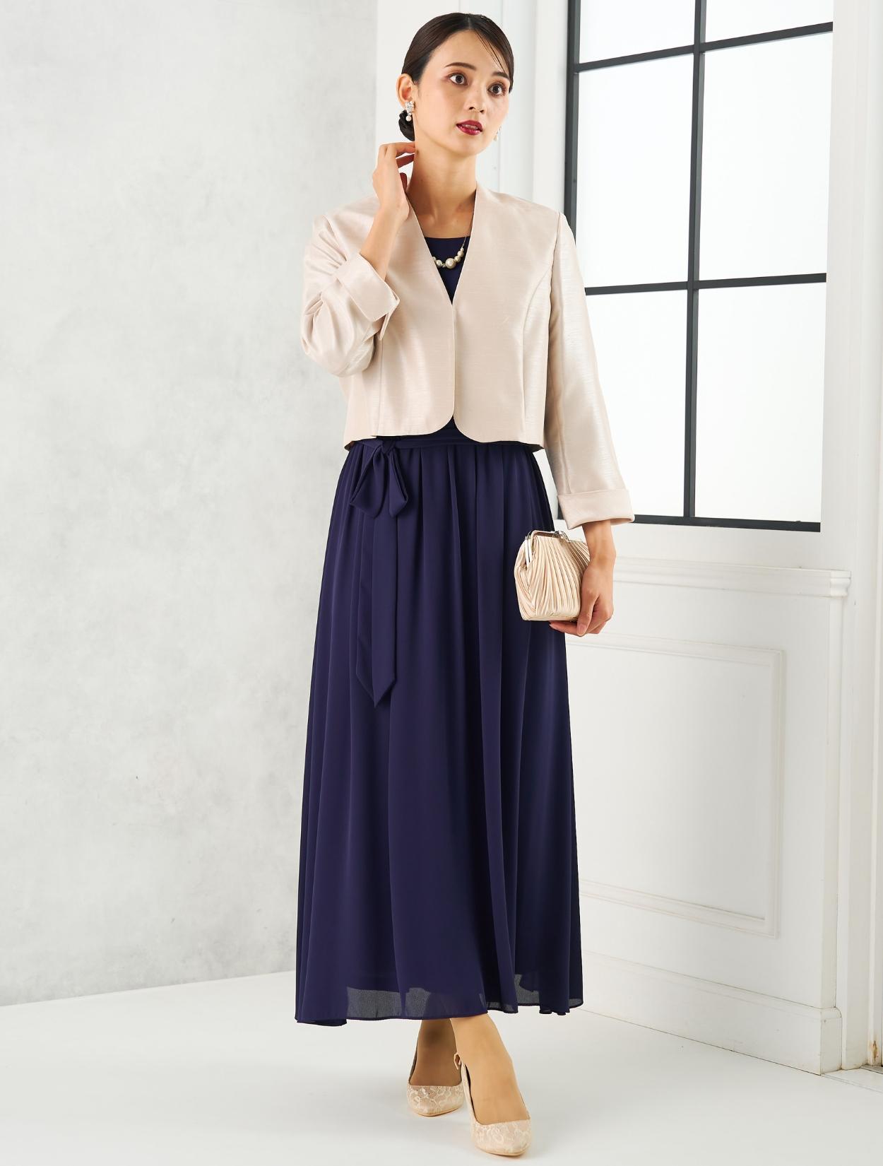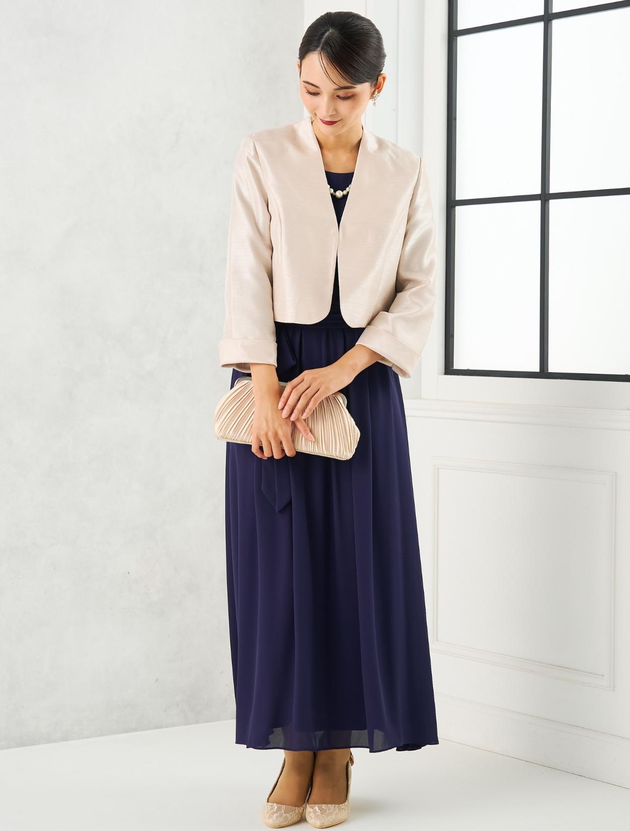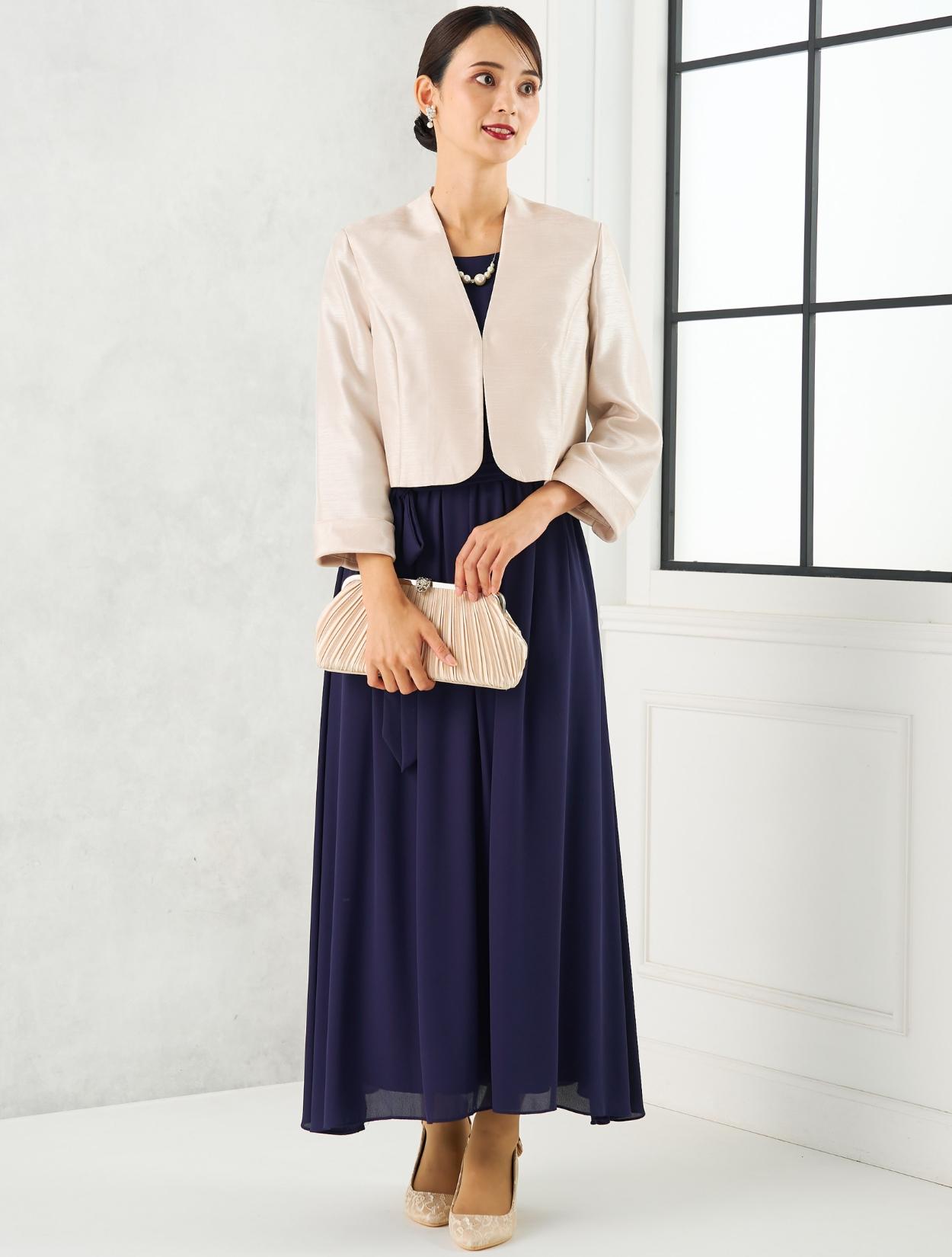 ネイビーのロングドレスに、高級感のあるシャンタンジャケットを合わせた親族向きのコーディネートセットです。きちんと感と華やかさがあるベージュのシャンタンは、母親用のドレスコーデとしてもおすすめです。