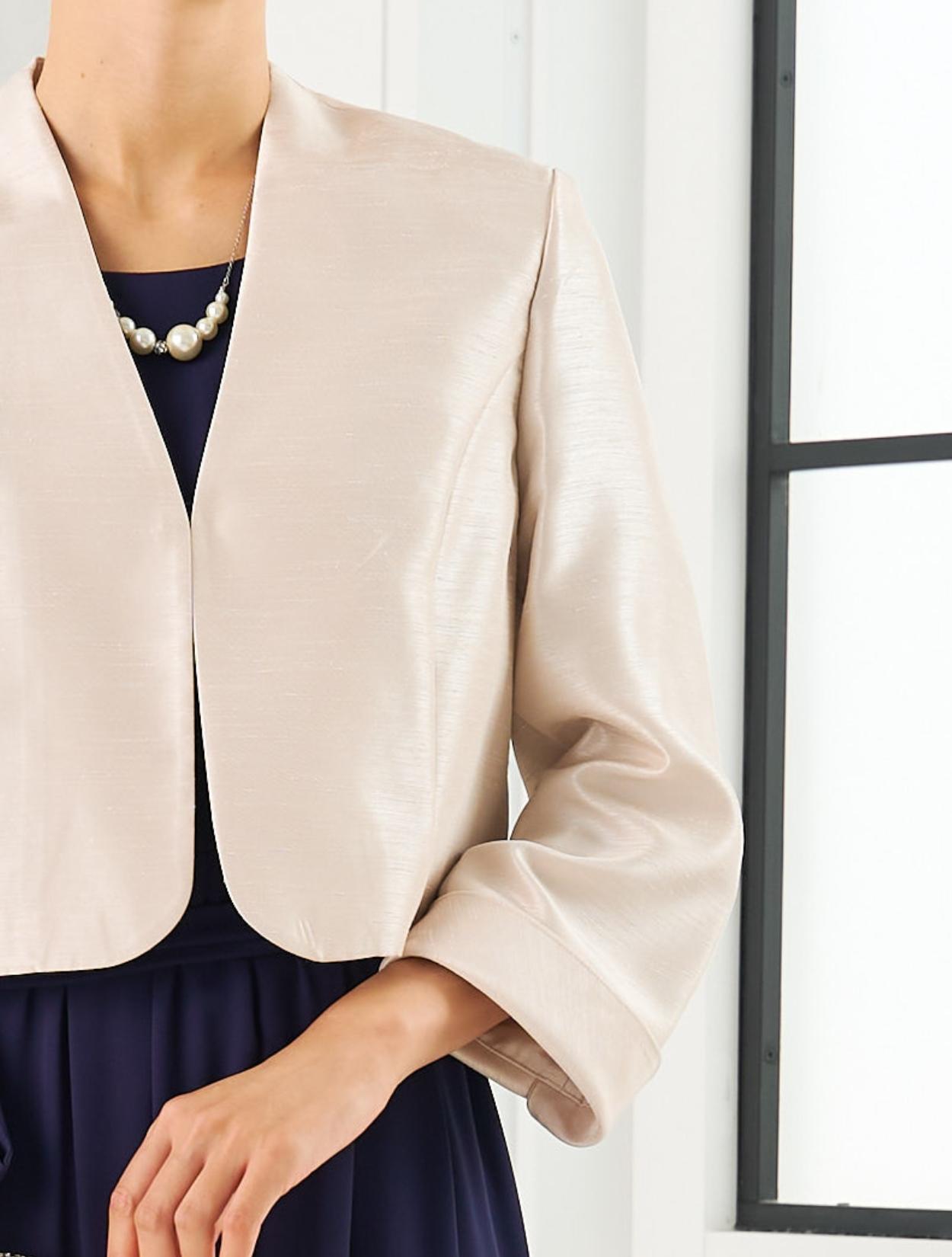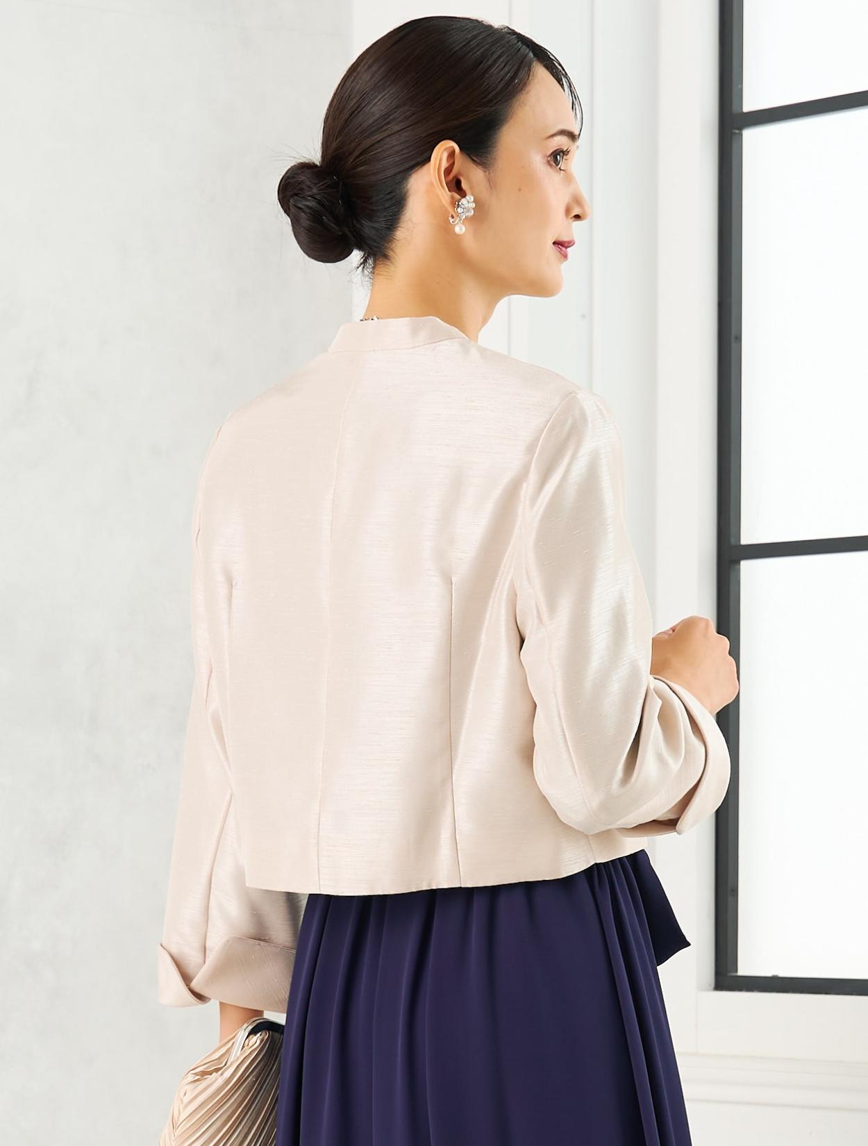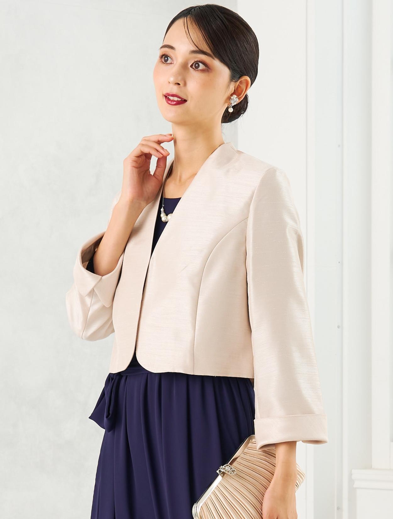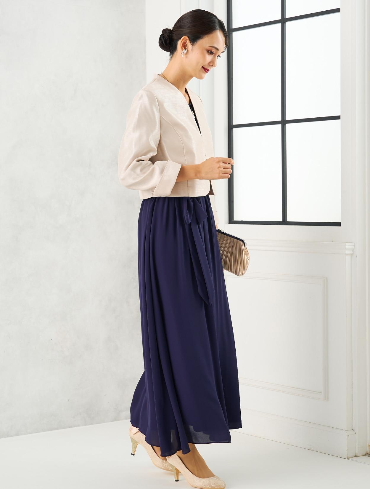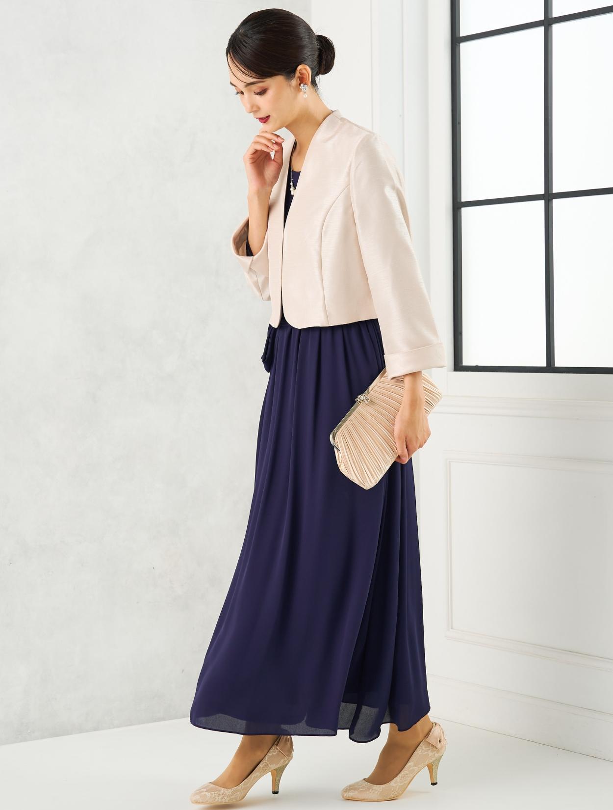 ネイビーのロングドレスに、高級感のあるシャンタンジャケットを合わせた親族向きのコーディネートセットです。きちんと感と華やかさがあるベージュのシャンタンは、母親用のドレスコーデとしてもおすすめです。