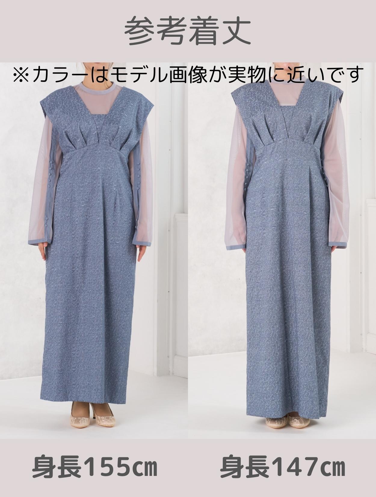 ラメ糸が織り込まれたジャガード生地は、シンプルなストレートラインのドレスに程よく華やかさをプラスしてくれます。スカートがヒラヒラしないデザインは、シャープで現代的な着こなしが楽しめるアイテム。大きくVに開いたワンピースのデザインは、上半身やお顔回りをスッキリ見せてくれます。Vのネックラインには、取り外し可能な胸当てが付いています。(モデル画像は胸当て付きです。)夜のパーティーシーン等で露出を増やしたい場合は、胸当てを取って着用するのも◎。ワンピースの背中部分のウエストは、一部ゴム仕様。正面からはすっきり見えますが、少しゆとりのあるデザインで着心地の面でも安心です。セットになっているシアーブラウスは、パイピングがほどこされており程よいアクセントに。おしゃれなくるみボタンは、お袖だけでなくブラウスにも。バックスタイルが凝ったデザインなのも嬉しいポイントです。長袖なのも、上品で結婚式のご利用にぴったりです。お袖のくるみボタンは外して着るとケープ風にもなるので、様々な着こなしが楽しめます。**a***インナーガイド