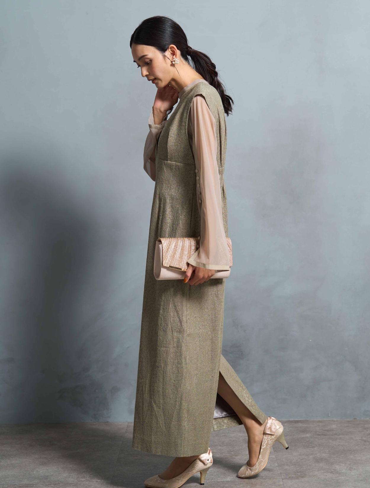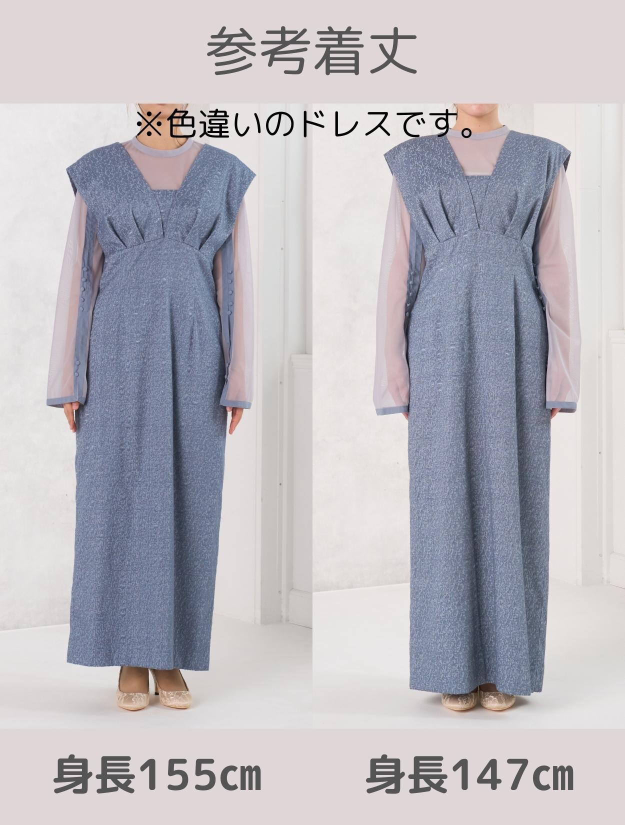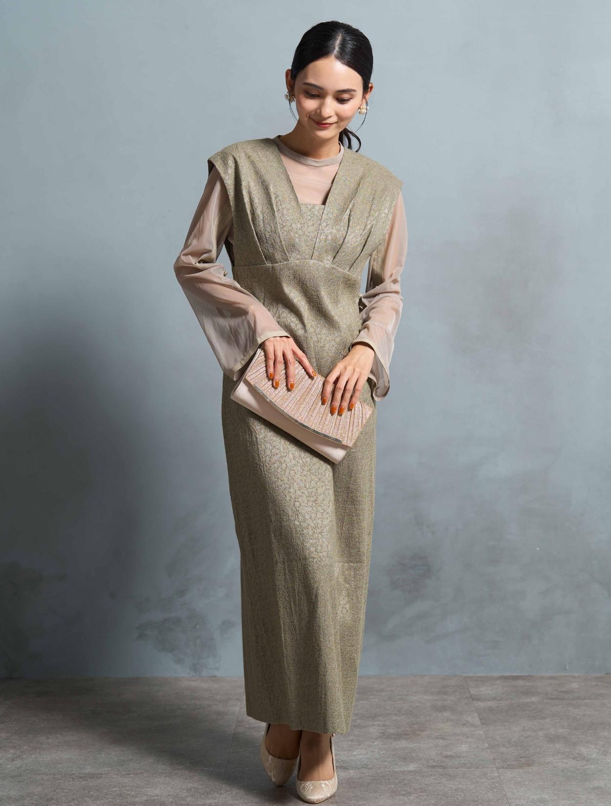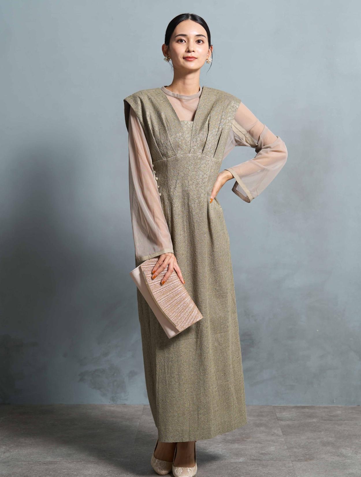 ラメ糸が織り込まれたジャガード生地は、シンプルなストレートラインのドレスに程よく華やかさをプラスしてくれます。スカートがヒラヒラしないデザインは、シャープで現代的な着こなしが楽しめるアイテム。大きくVに開いたワンピースのデザインは、上半身やお顔回りをスッキリ見せてくれます。Vのネックラインには、取り外し可能な胸当てが付いています。(モデル画像は胸当て付きです。)夜のパーティーシーン等で露出を増やしたい場合は、胸当てを取って着用するのも◎。ワンピースの背中部分のウエストは、一部ゴム仕様。正面からはすっきり見えますが、少しゆとりのあるデザインで着心地の面でも安心です。セットになっているシアーブラウスは、パイピングがほどこされており程よいアクセントに。おしゃれなくるみボタンは、お袖だけでなくブラウスにも。バックスタイルが凝ったデザインなのも嬉しいポイントです。長袖なのも、上品で結婚式のご利用にぴったりです。お袖のくるみボタンは外して着るとケープ風にもなるので、様々な着こなしが楽しめます。**a***インナーガイド