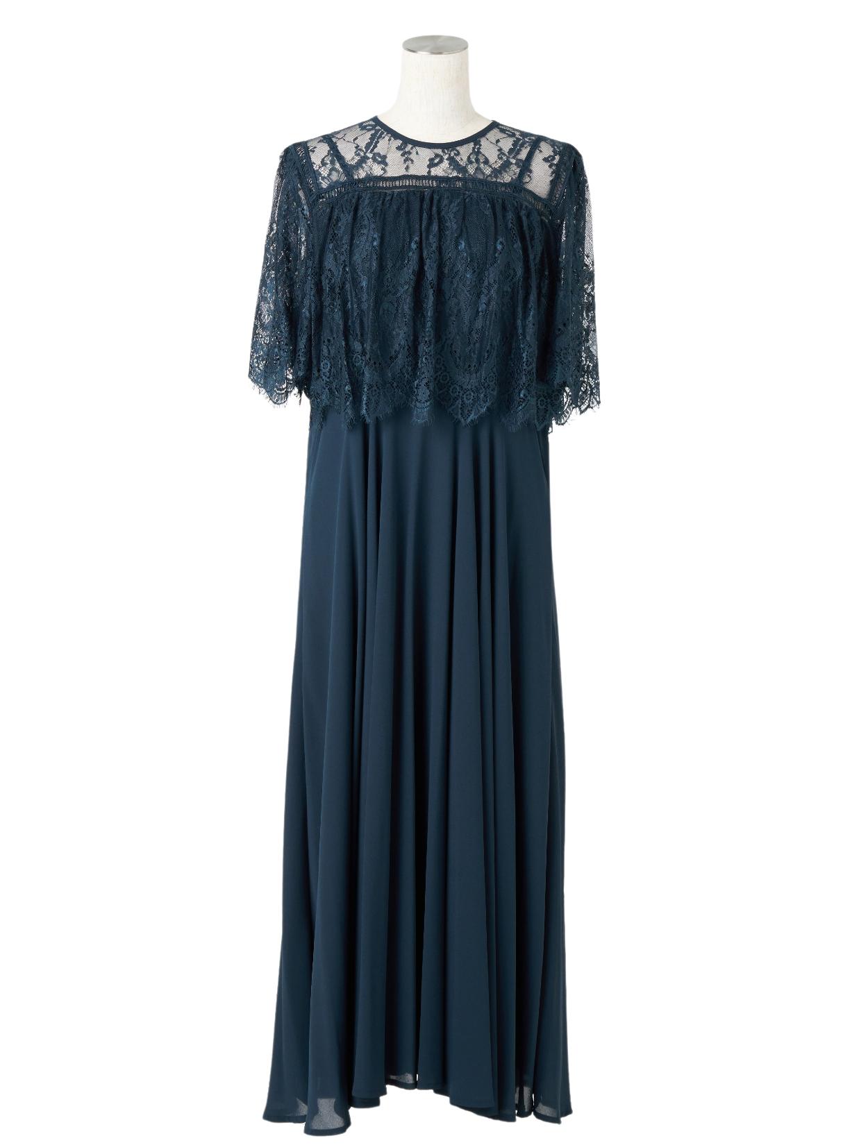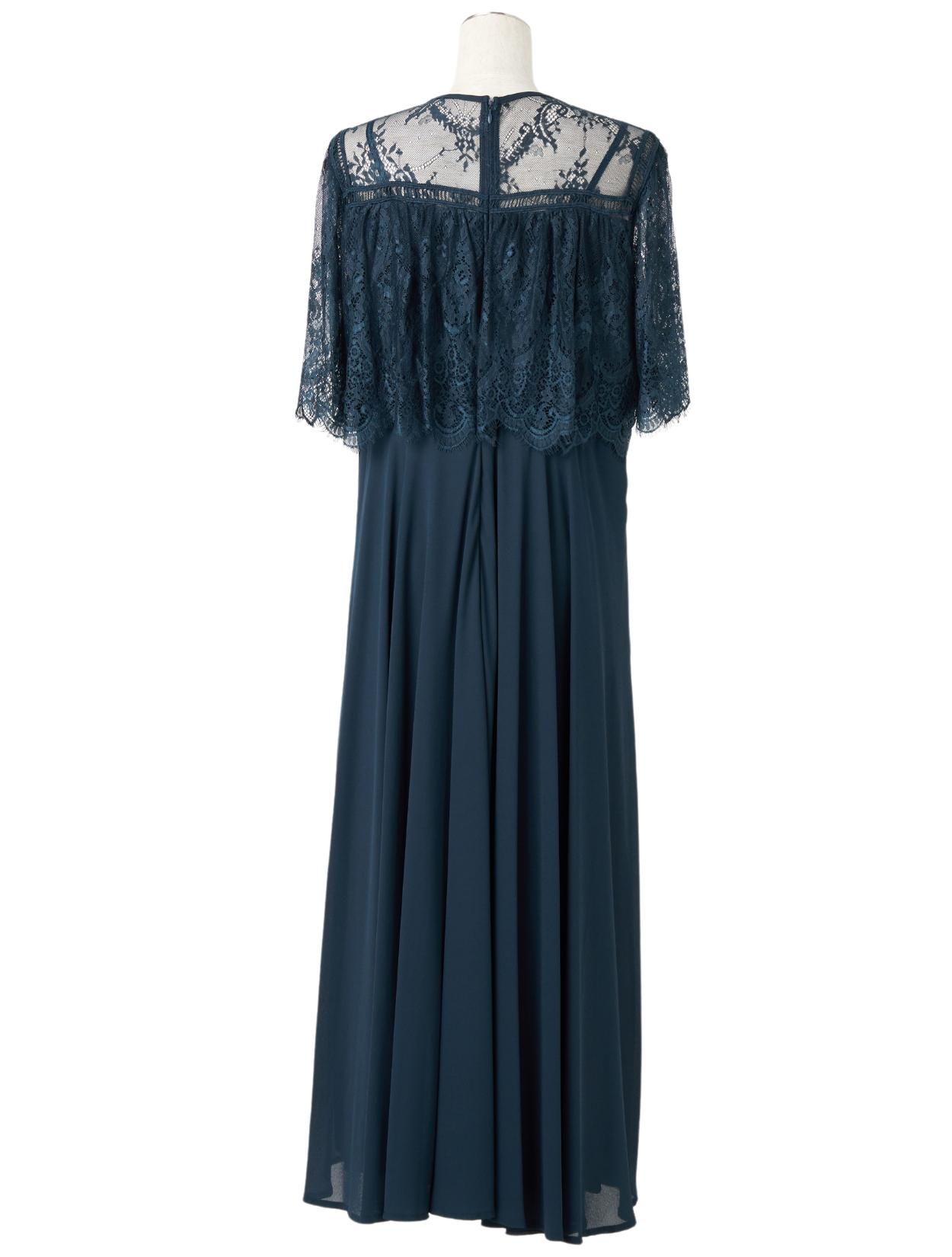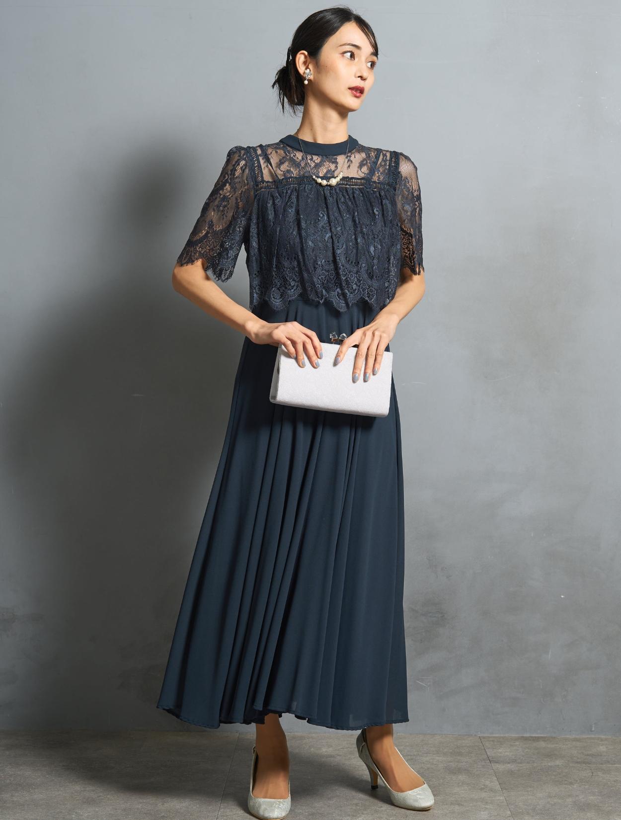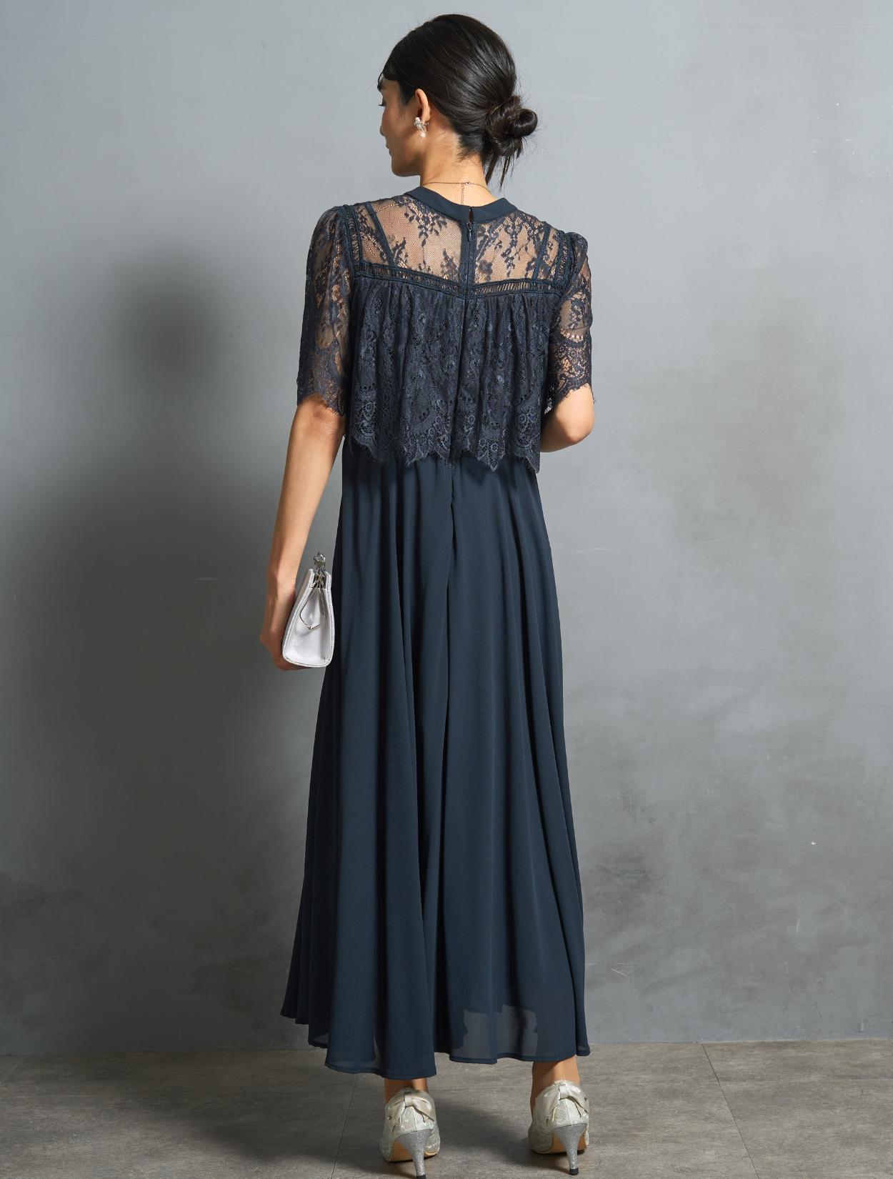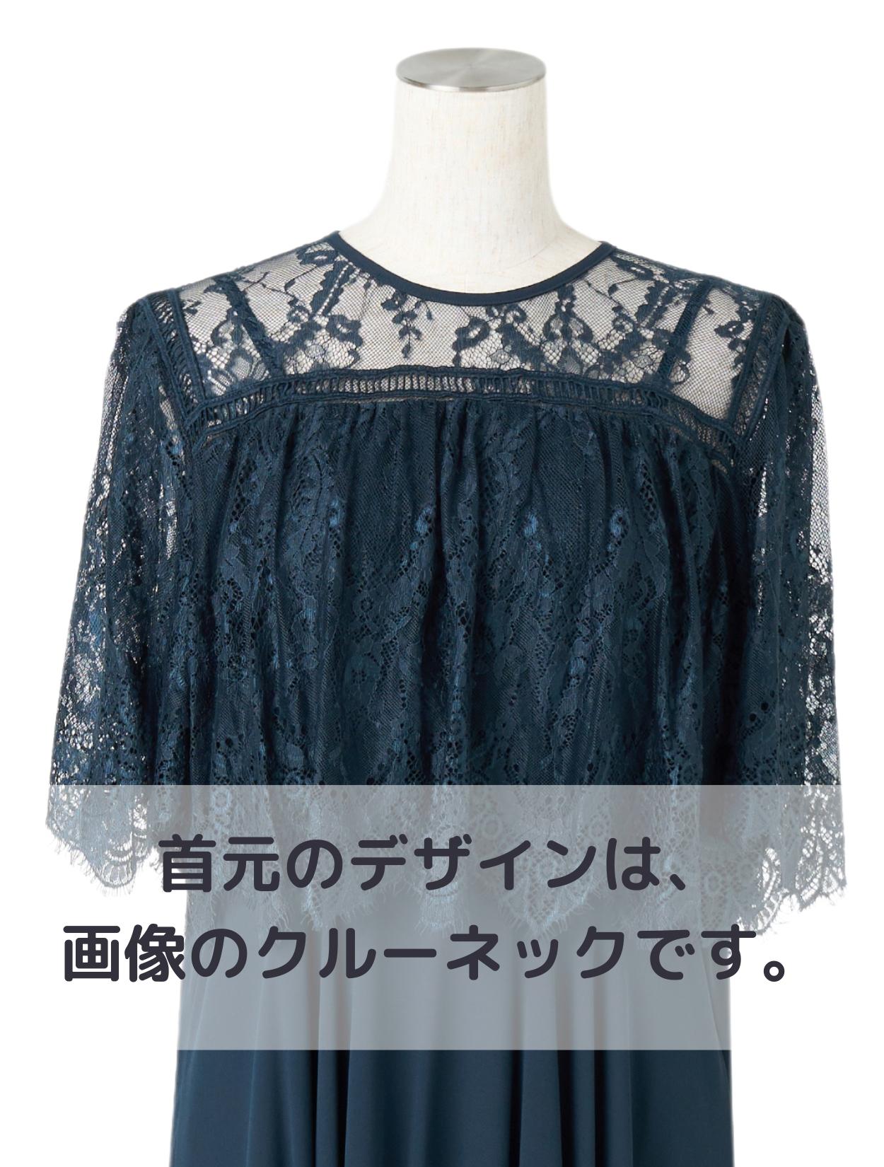 オーバーブラウス風のレースが華やかな印象のドレス。ふんわりとしたラインは、バストをきれいにカバーしてくれます。レースのお袖は長すぎないハーフスリーブ。肘下をしっかり出すことで抜け感が出て、ロング丈ドレスでも重たく見えません。レース部分の着丈は短めにデザインされているので、足長効果もありスタイルアップが叶います。お顔回りがすっきり見えるように、LL以上のおサイズはクルーネックのデザインを採用しています。レースの透け感のあり、首元が詰まって見えにくいです。