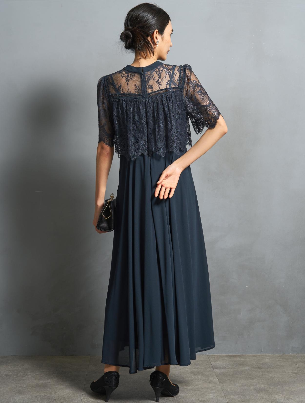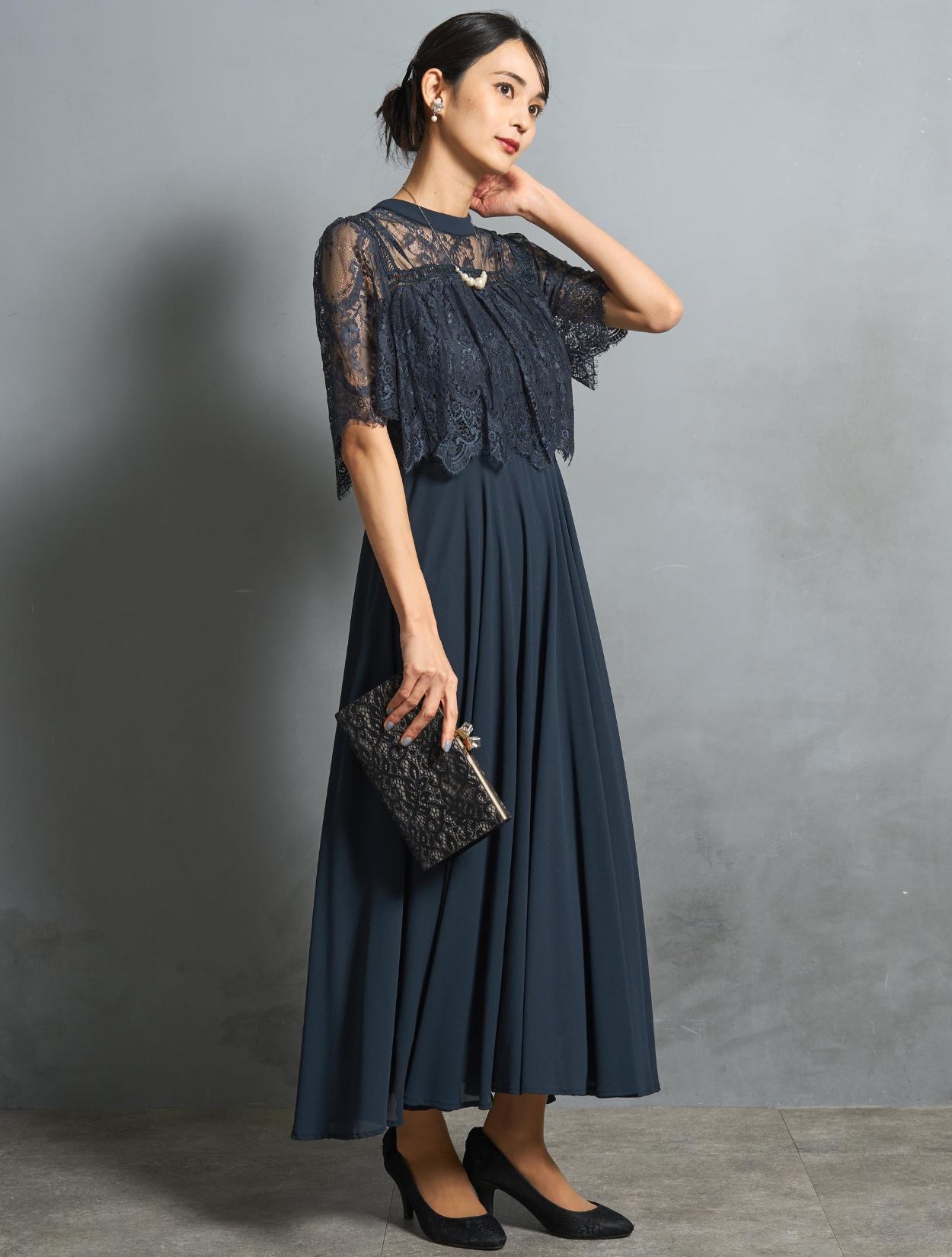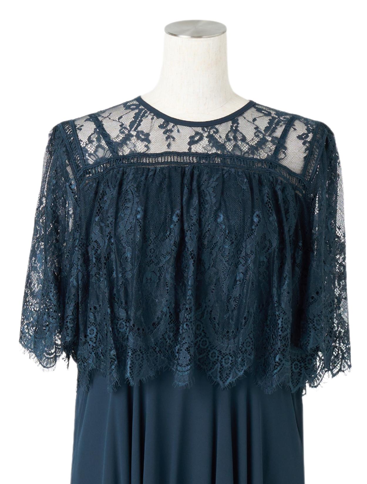 オーバーブラウス風のレースが華やかな印象のドレス。ふんわりとしたラインは、バストをきれいにカバーしてくれます。レースのお袖は長すぎないハーフスリーブ。肘下をしっかり出すことで抜け感が出て、ロング丈ドレスでも重たく見えません。レース部分の着丈は短めにデザインされているので、足長効果もありスタイルアップが叶います。お顔回りがすっきり見えるように、LL以上のおサイズはクルーネックのデザインを採用しています。レースの透け感のあり、首元が詰まって見えにくいです。