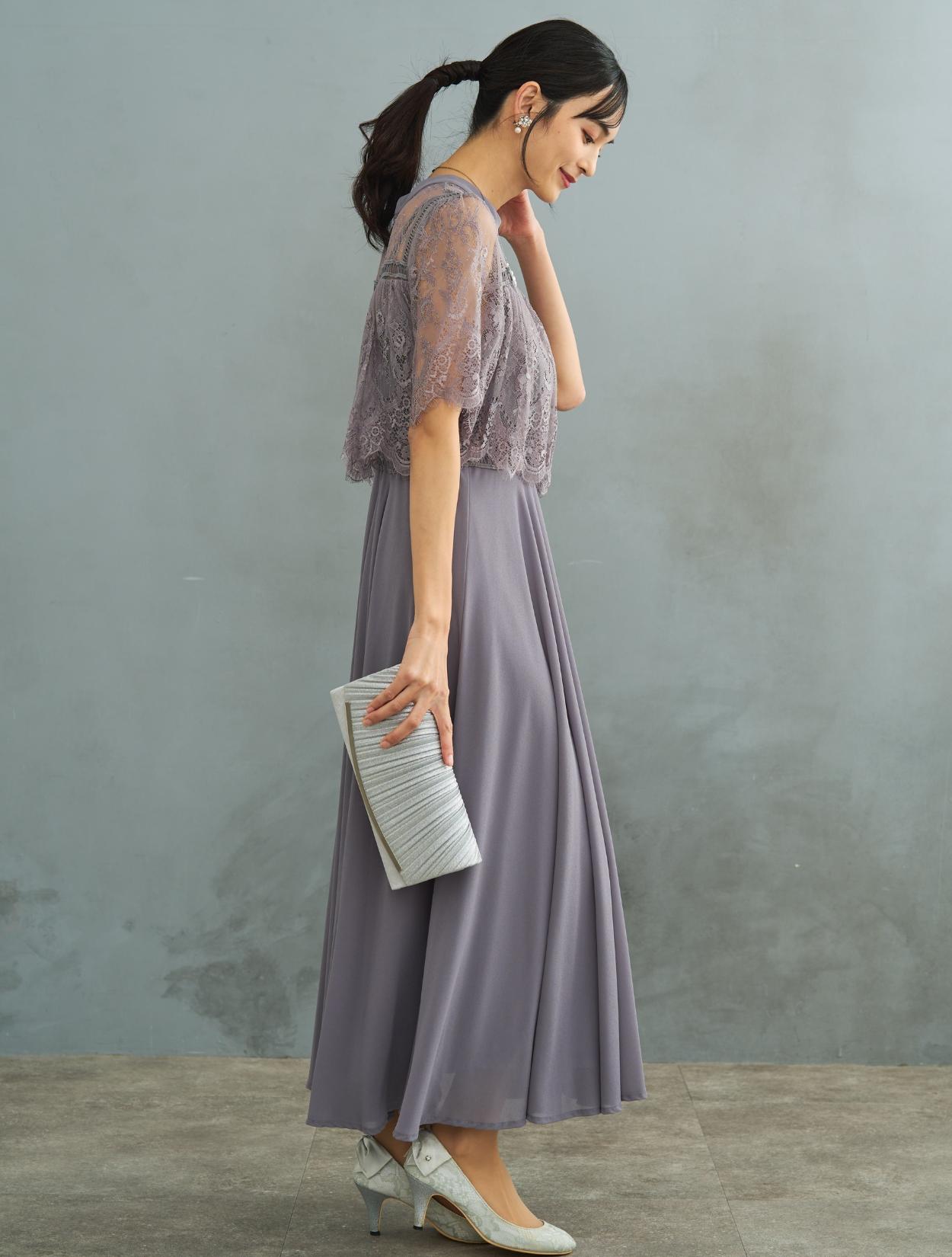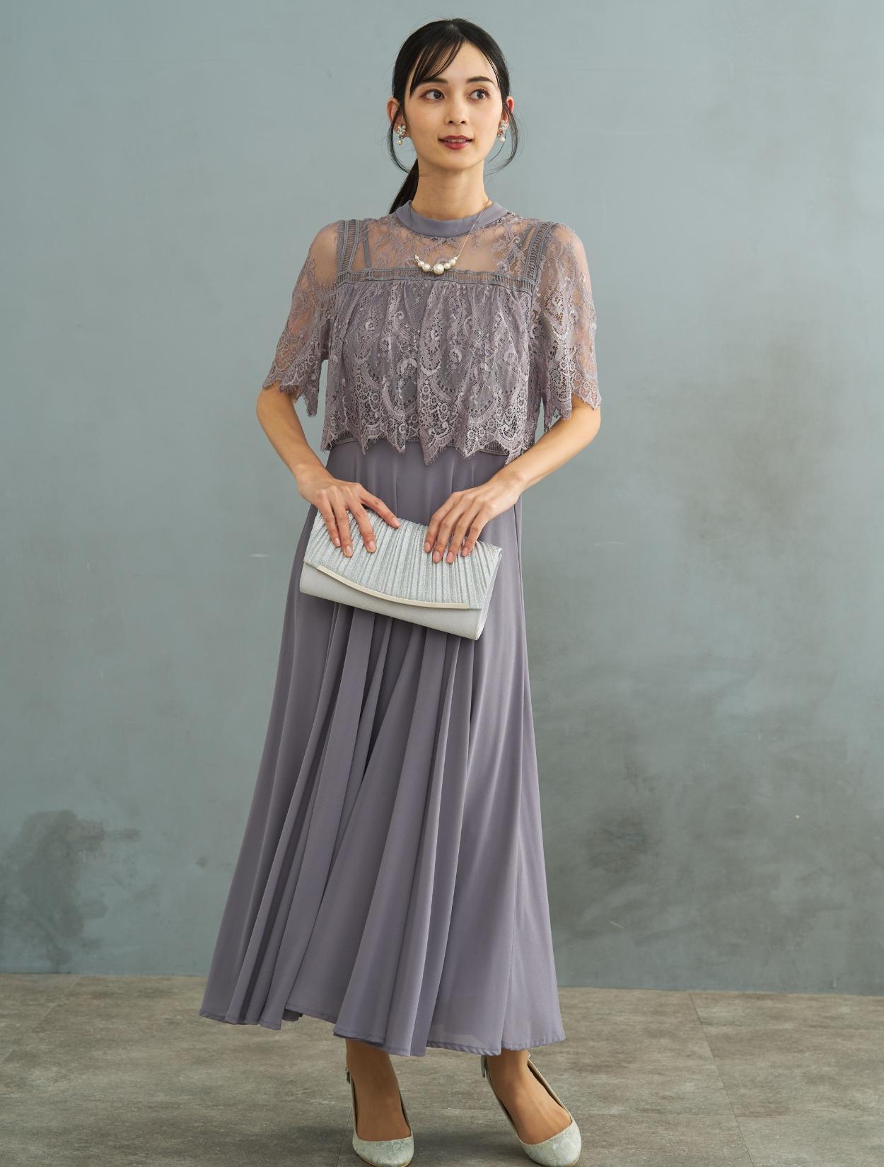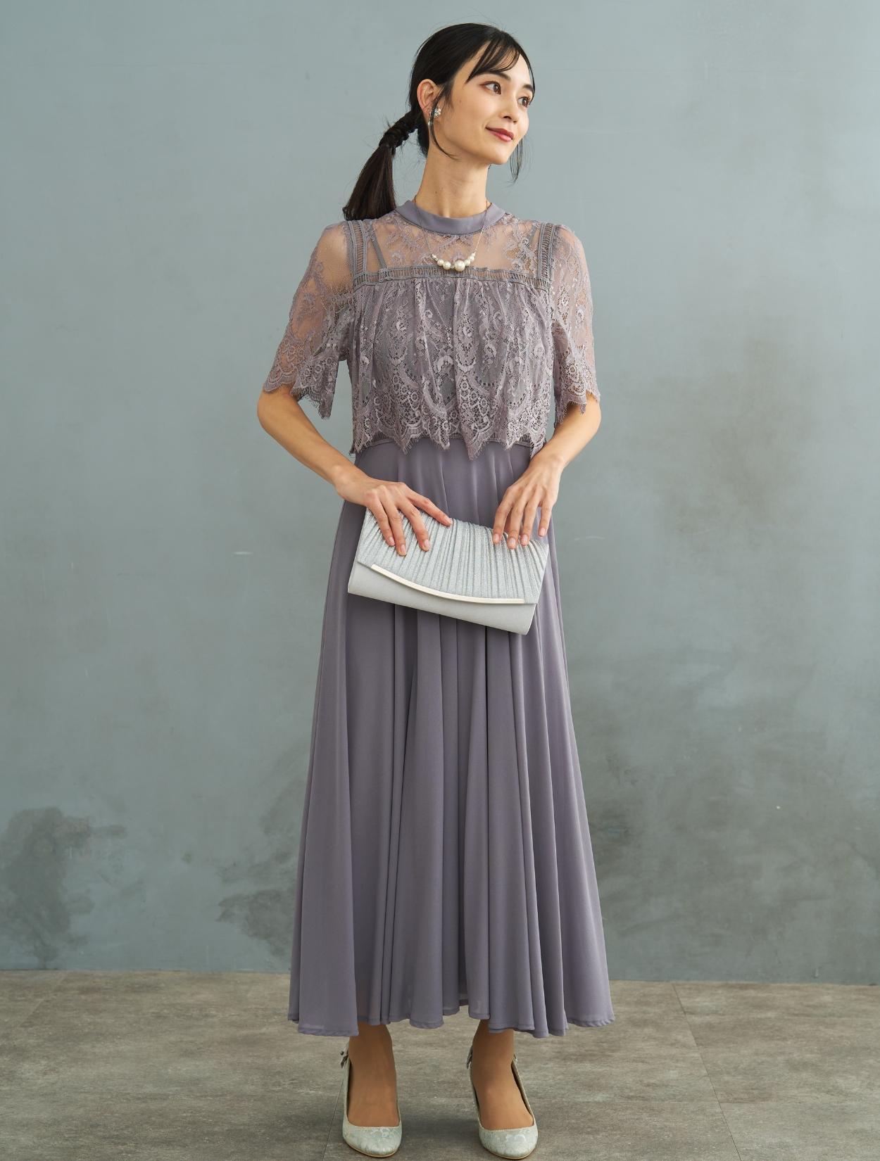 オーバーブラウス風のレースが華やかな印象のドレス。ふんわりとしたラインは、バストをきれいにカバーしてくれます。レースのお袖は長すぎないハーフスリーブ。肘下をしっかり出すことで抜け感が出て、ロング丈ドレスでも重たく見えません。レース部分の着丈は短めにデザインされているので、足長効果もありスタイルアップが叶います。お顔回りがすっきり見えるように、LL以上のおサイズはクルーネックのデザインを採用しています。レースの透け感のあり、首元が詰まって見えにくいです。