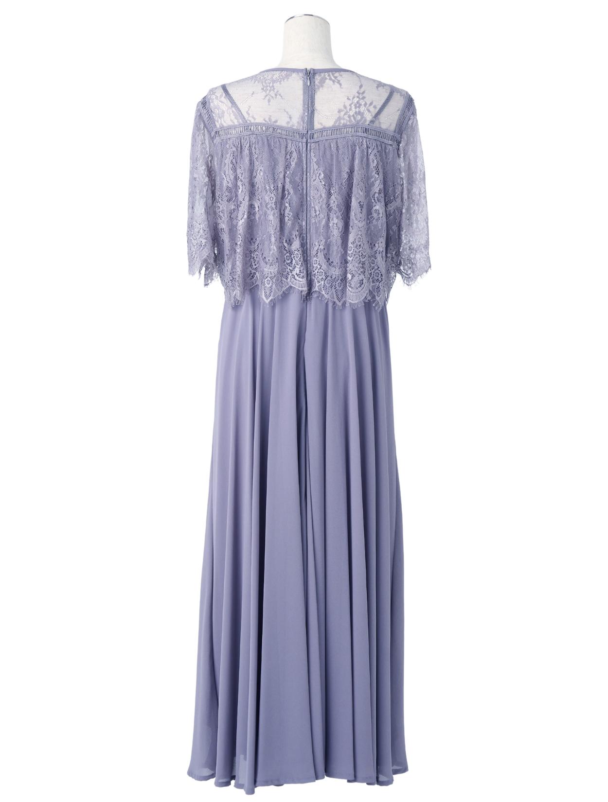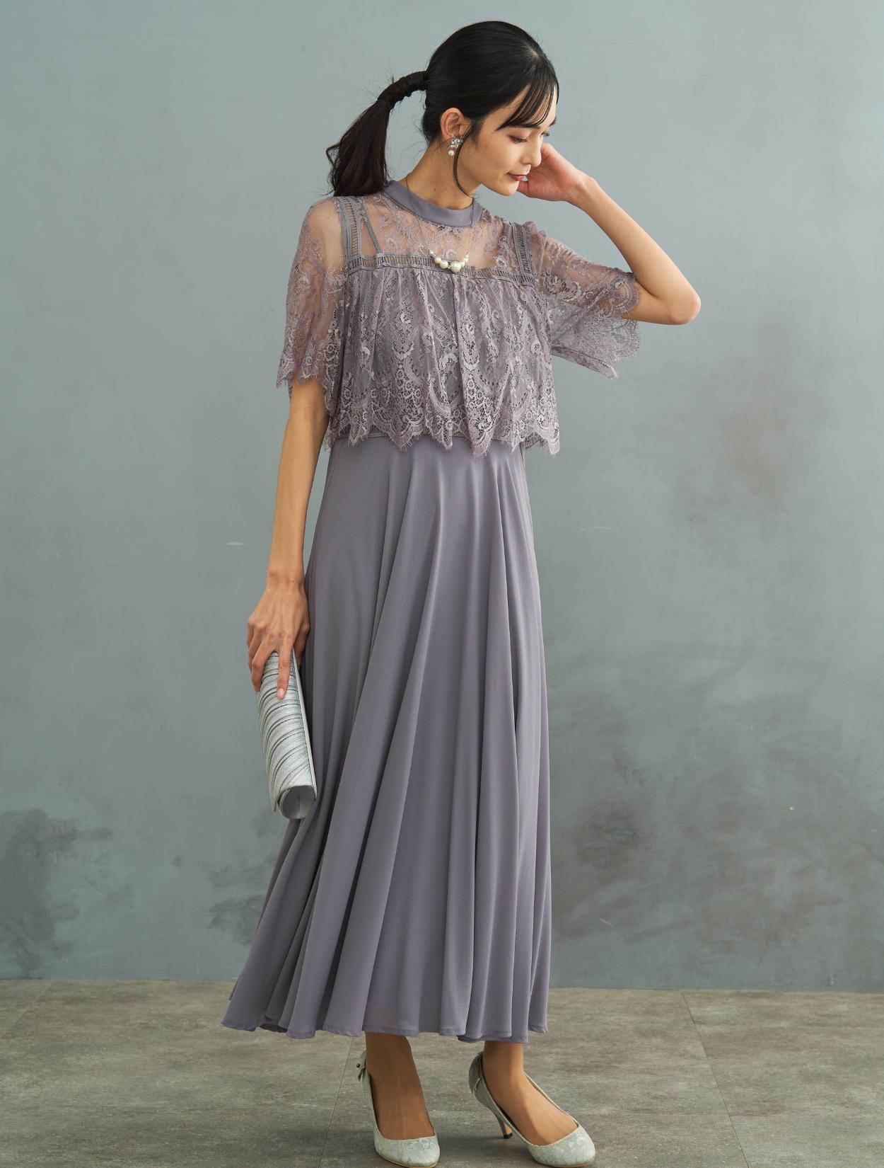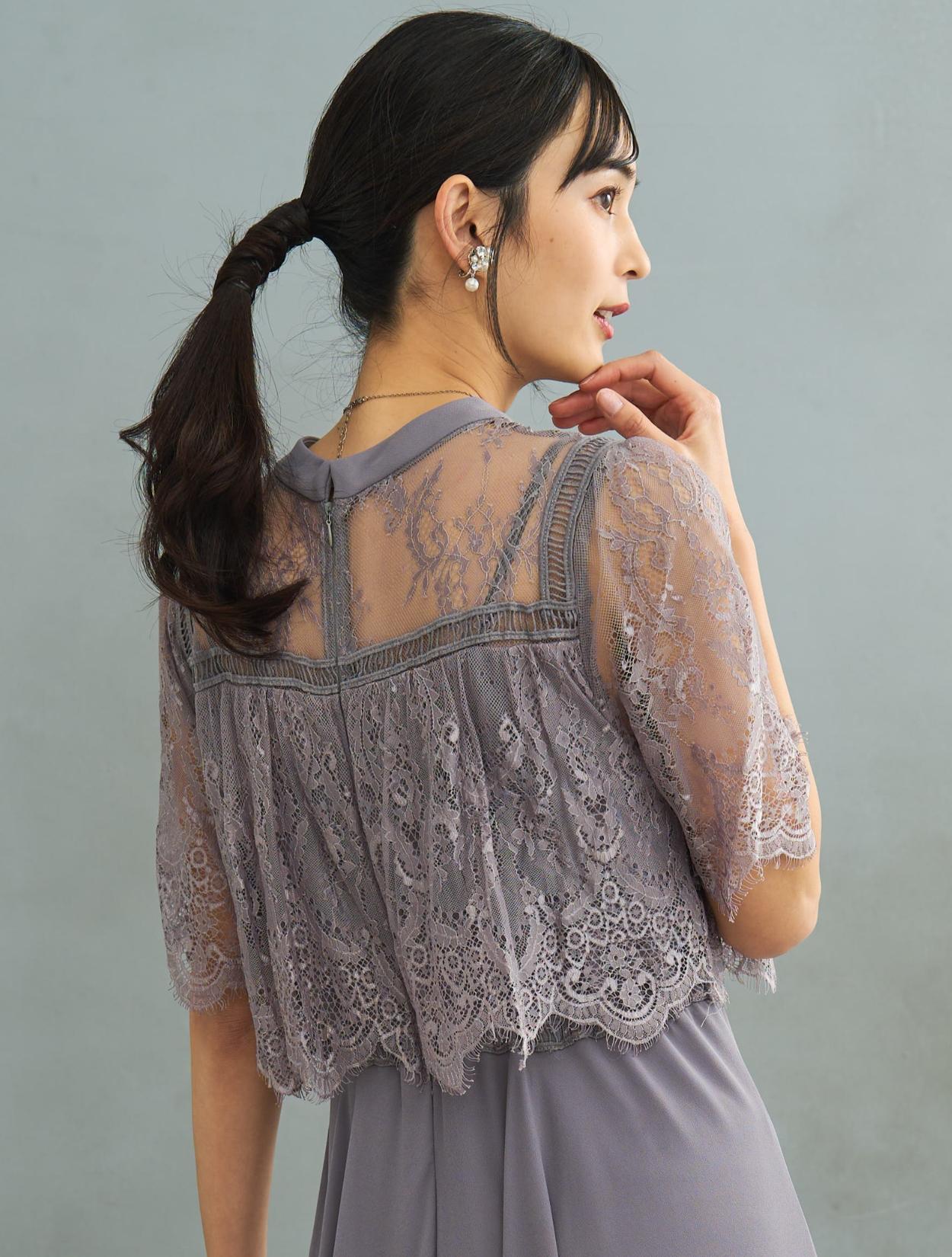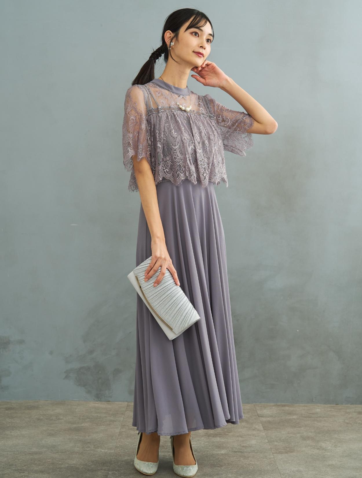 オーバーブラウス風のレースが華やかな印象のドレス。ふんわりとしたラインは、バストをきれいにカバーしてくれます。レースのお袖は長すぎないハーフスリーブ。肘下をしっかり出すことで抜け感が出て、ロング丈ドレスでも重たく見えません。レース部分の着丈は短めにデザインされているので、足長効果もありスタイルアップが叶います。お顔回りがすっきり見えるように、LL以上のおサイズはクルーネックのデザインを採用しています。レースの透け感のあり、首元が詰まって見えにくいです。