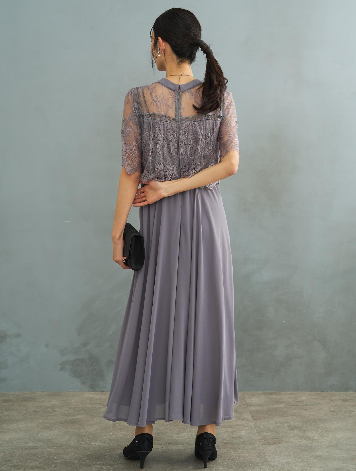 オーバーブラウス風のレースが華やかな印象のドレス。ふんわりとしたラインは、バストをきれいにカバーしてくれます。レースのお袖は長すぎないハーフスリーブ。肘下をしっかり出すことで抜け感が出て、ロング丈ドレスでも重たく見えません。レース部分の着丈は短めにデザインされているので、足長効果もありスタイルアップが叶います。お顔回りがすっきり見えるように、LL以上のおサイズはクルーネックのデザインを採用しています。レースの透け感のあり、首元が詰まって見えにくいです。