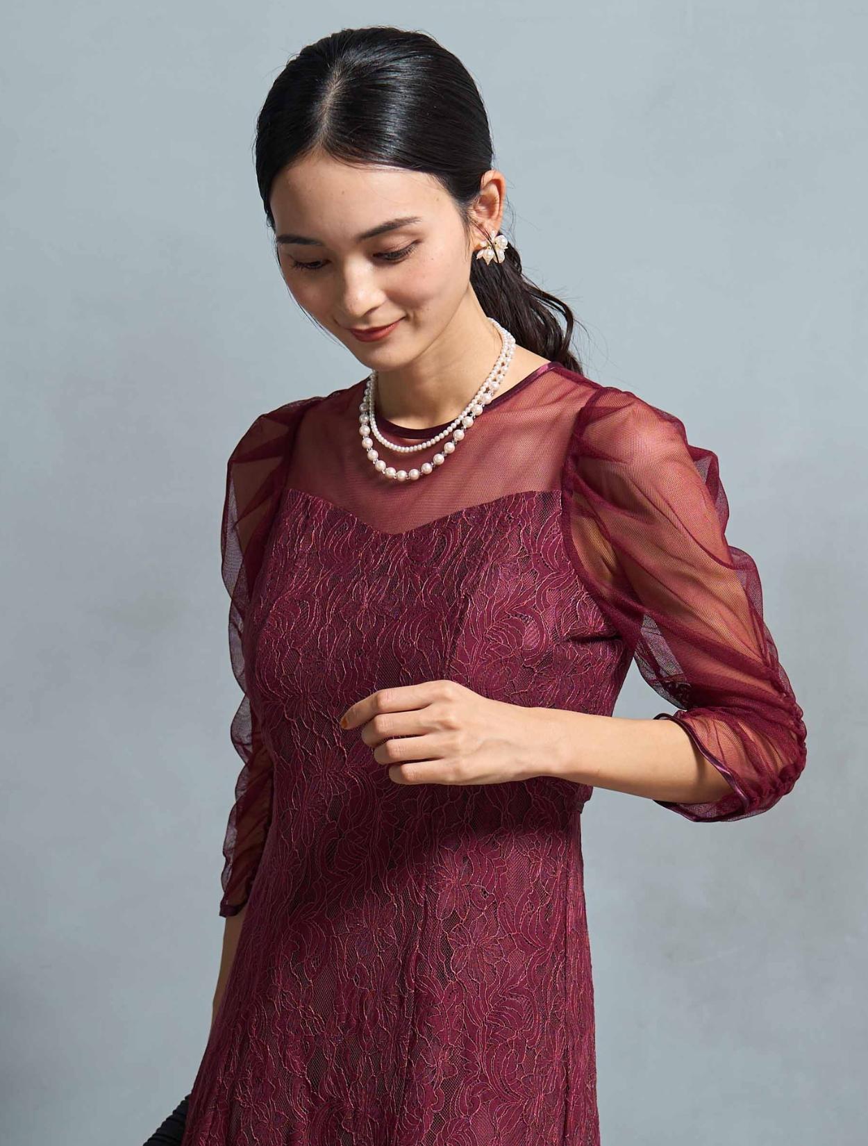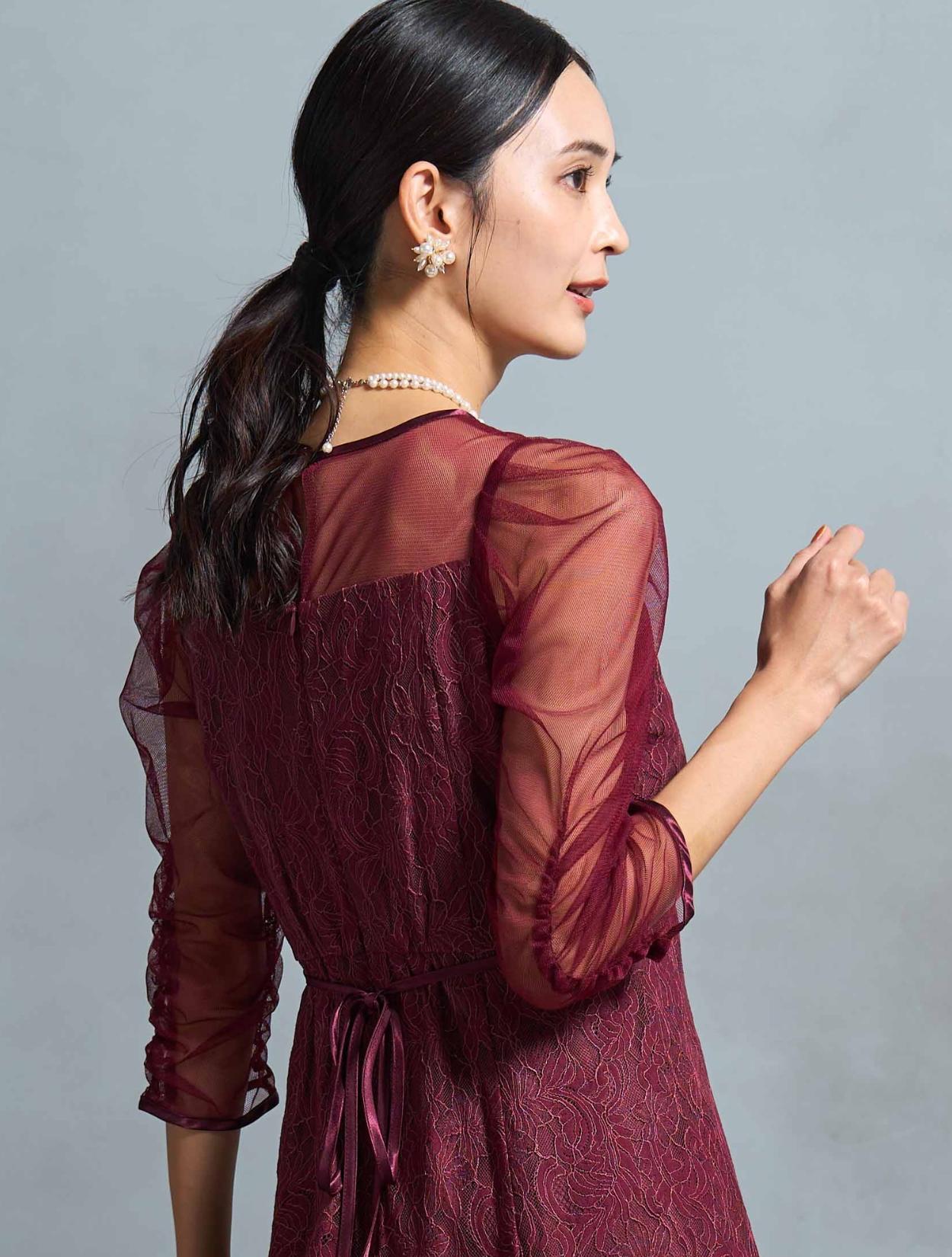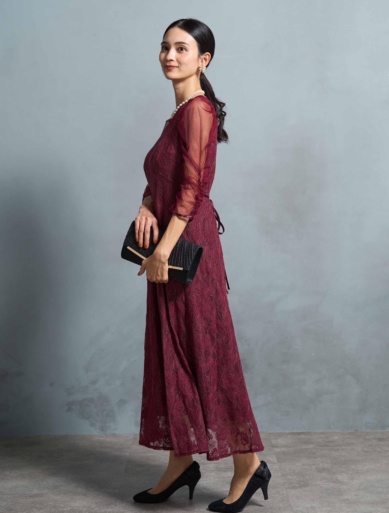 高級感のある上品なレースが目を惹くドレス。デコルテからお袖にかけてはシンプルなシアーチュールが使われているので、レースドレスでも甘くなり過ぎず幅広い年代におすすめです。ギャザーを寄せたお袖のデザインはお顔周りを華やかに見せてくれて、写真写りも良くSNS映えします◎。肩幅が気になる方でも着こなしやすい、控えめなボリューム感なのも嬉しいポイントです。ウエストには華奢なリボン紐が付いているので、キュッと絞って細身の方でもキレイに着こなせます。さりげなくウエストマークできるのでスタイルアップ効果もあり。首元も開きすぎないデザインなので、Sサイズや低身長の方でも着こなしやすいドレスです。ボリュームを落としたフレアスカートは、全体のバランスをすっきり大人っぽく見せてくれます。