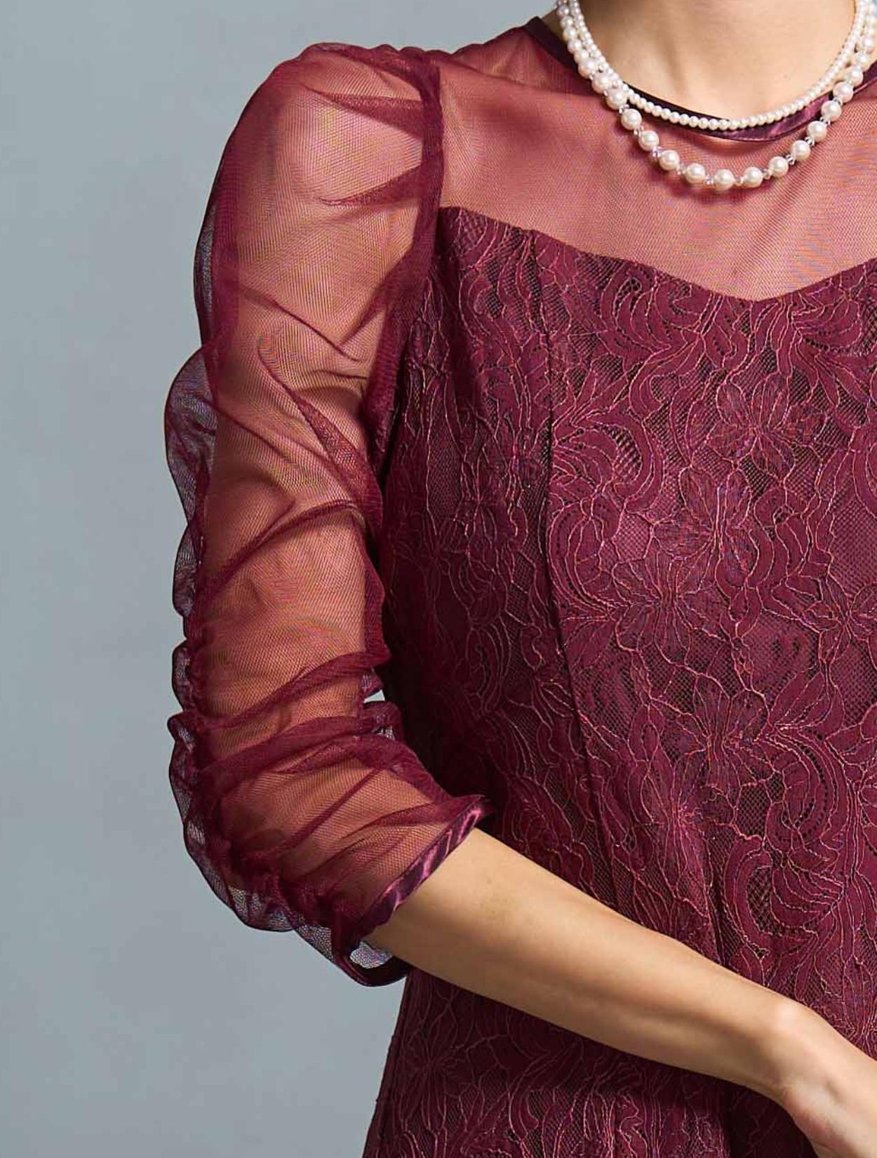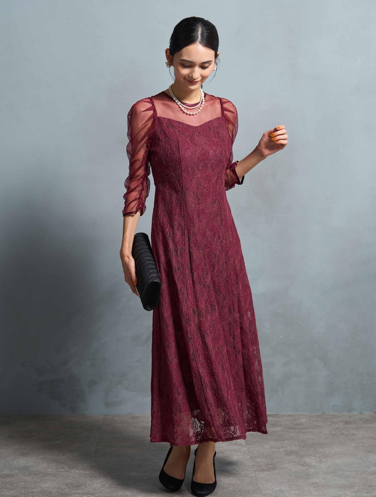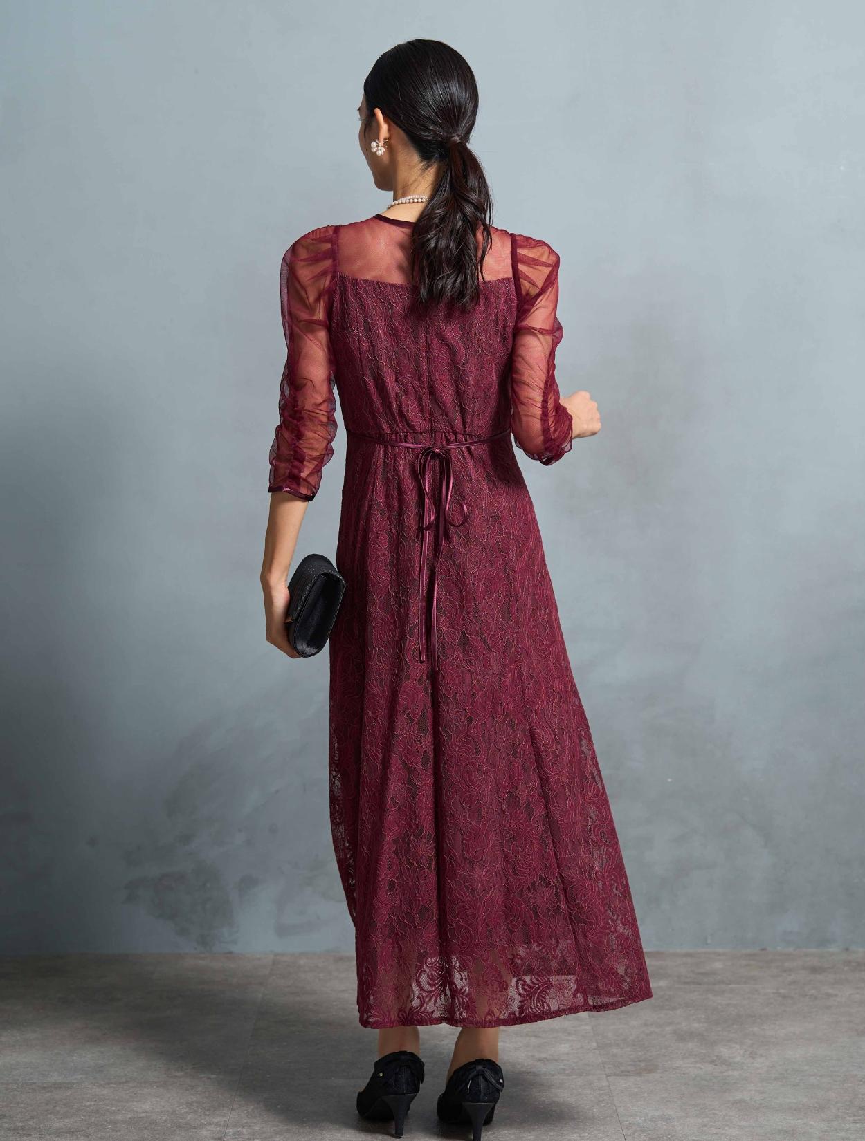 高級感のある上品なレースが目を惹くドレス。デコルテからお袖にかけてはシンプルなシアーチュールが使われているので、レースドレスでも甘くなり過ぎず幅広い年代におすすめです。ギャザーを寄せたお袖のデザインはお顔周りを華やかに見せてくれて、写真写りも良くSNS映えします◎。肩幅が気になる方でも着こなしやすい、控えめなボリューム感なのも嬉しいポイントです。ウエストには華奢なリボン紐が付いているので、キュッと絞って細身の方でもキレイに着こなせます。さりげなくウエストマークできるのでスタイルアップ効果もあり。首元も開きすぎないデザインなので、Sサイズや低身長の方でも着こなしやすいドレスです。ボリュームを落としたフレアスカートは、全体のバランスをすっきり大人っぽく見せてくれます。