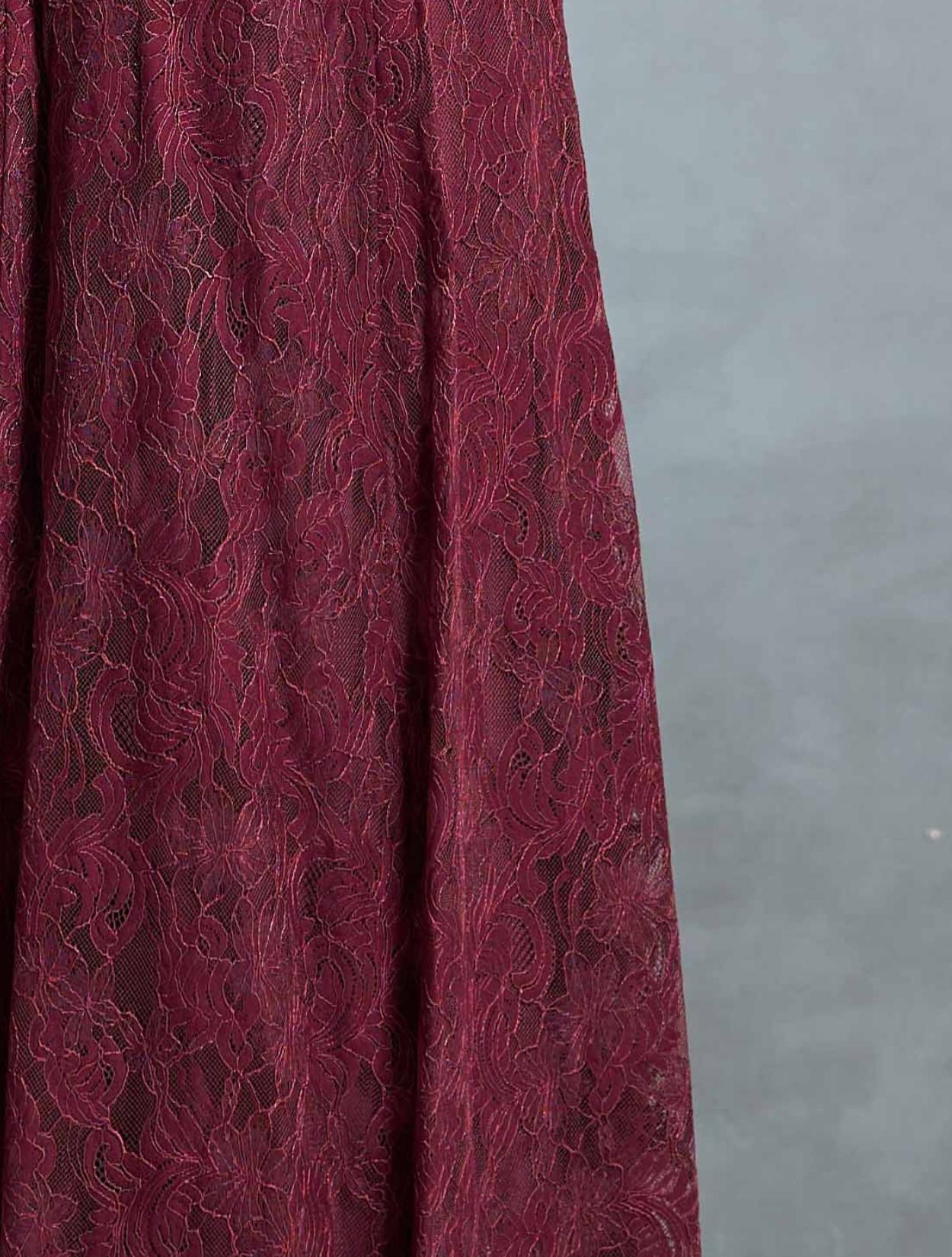 きれいなワインレッドのようなカラー。派手過ぎない、上品で華やかな印象がポイントです。20代30代はもちろん、40代の方でも着こなしやすい大人のカラードレスです。くすみが控えめなので、お顔映りもくすみにくいです。