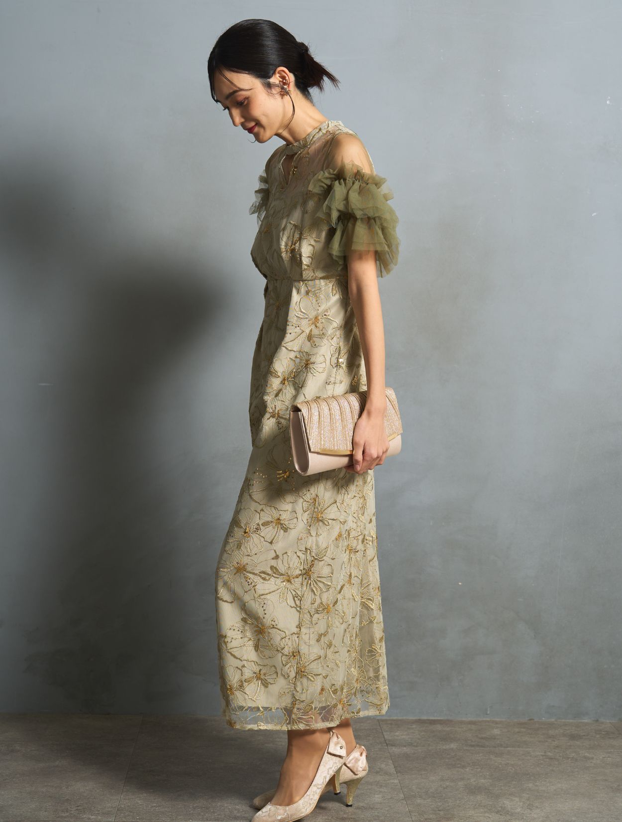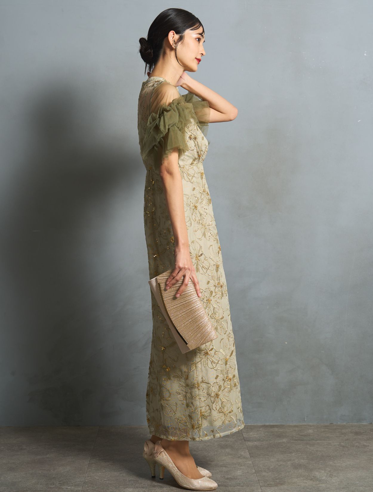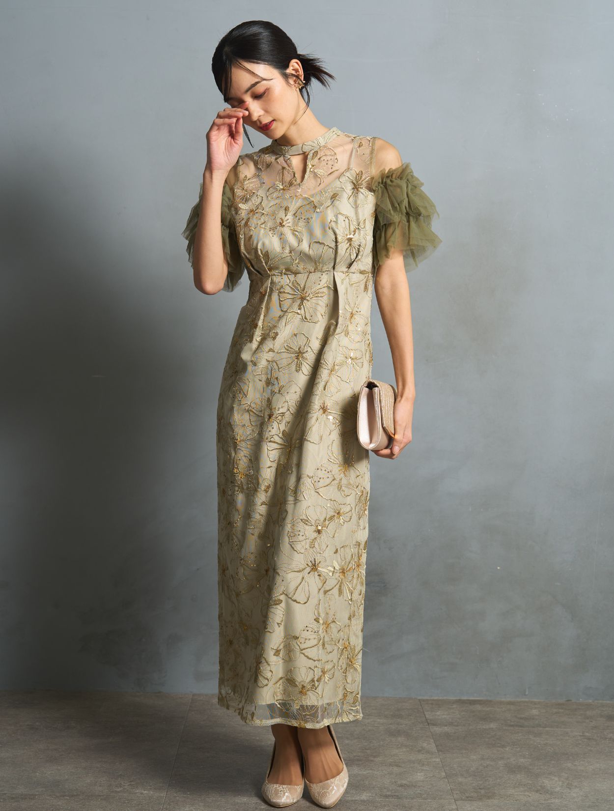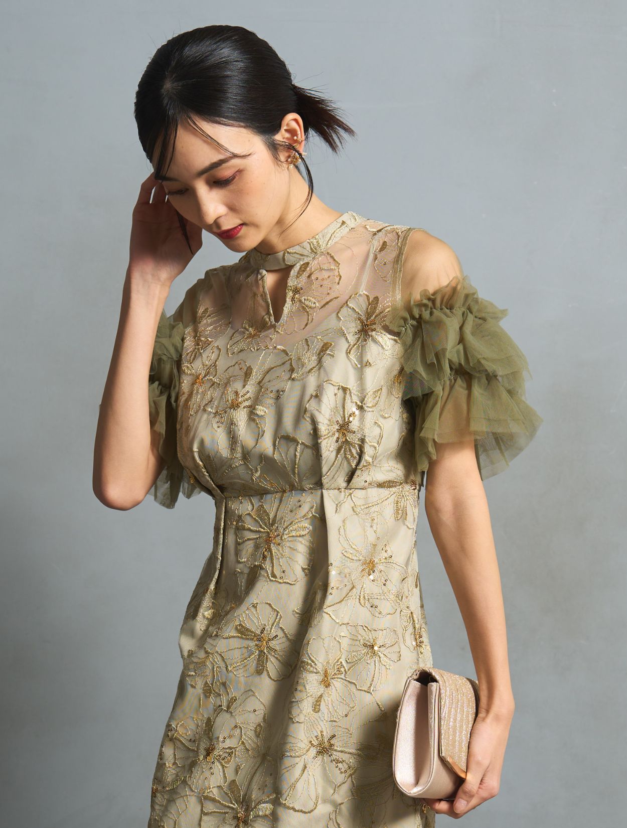 スモークがかったライトグリーンは、カラードレスでも大人っぽく上品な雰囲気に。程よく光沢のある同色の刺繍に細かいゴールドのスパンコールは、イエローベースのお肌に良くマッチします。カーキグリーンのチュールスリーブが、全体の引き締めカラーに。