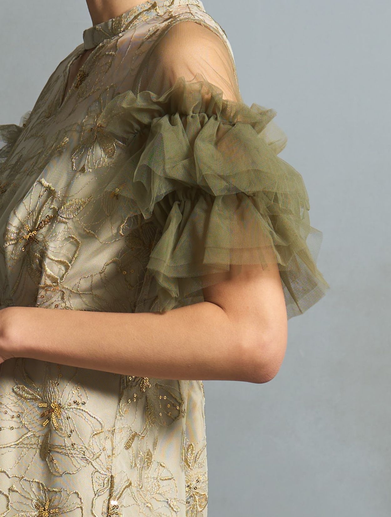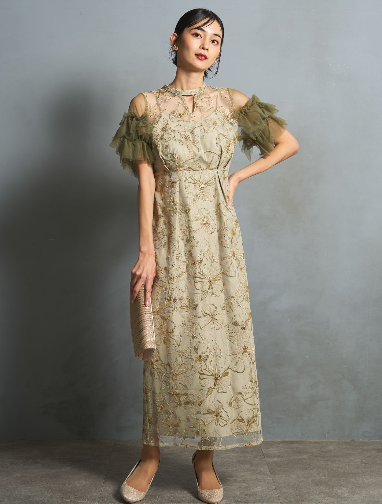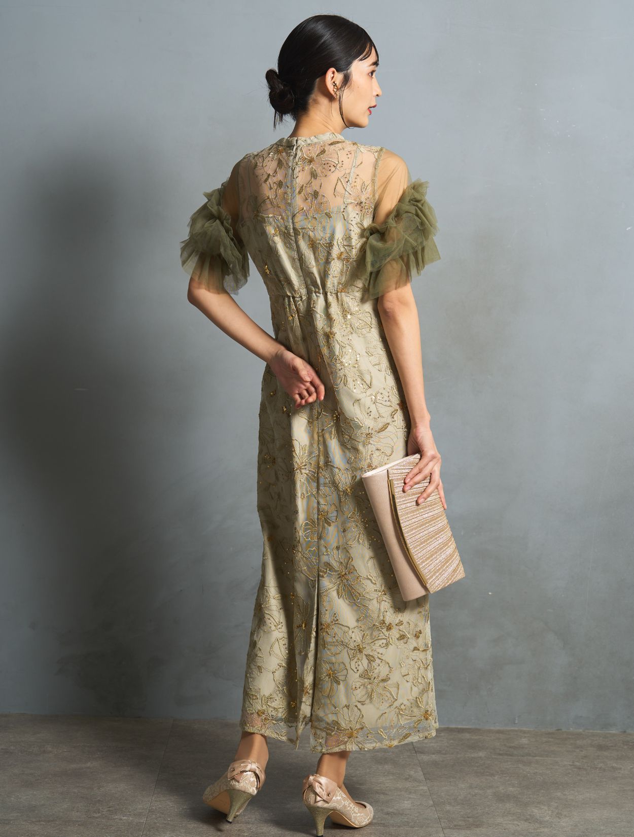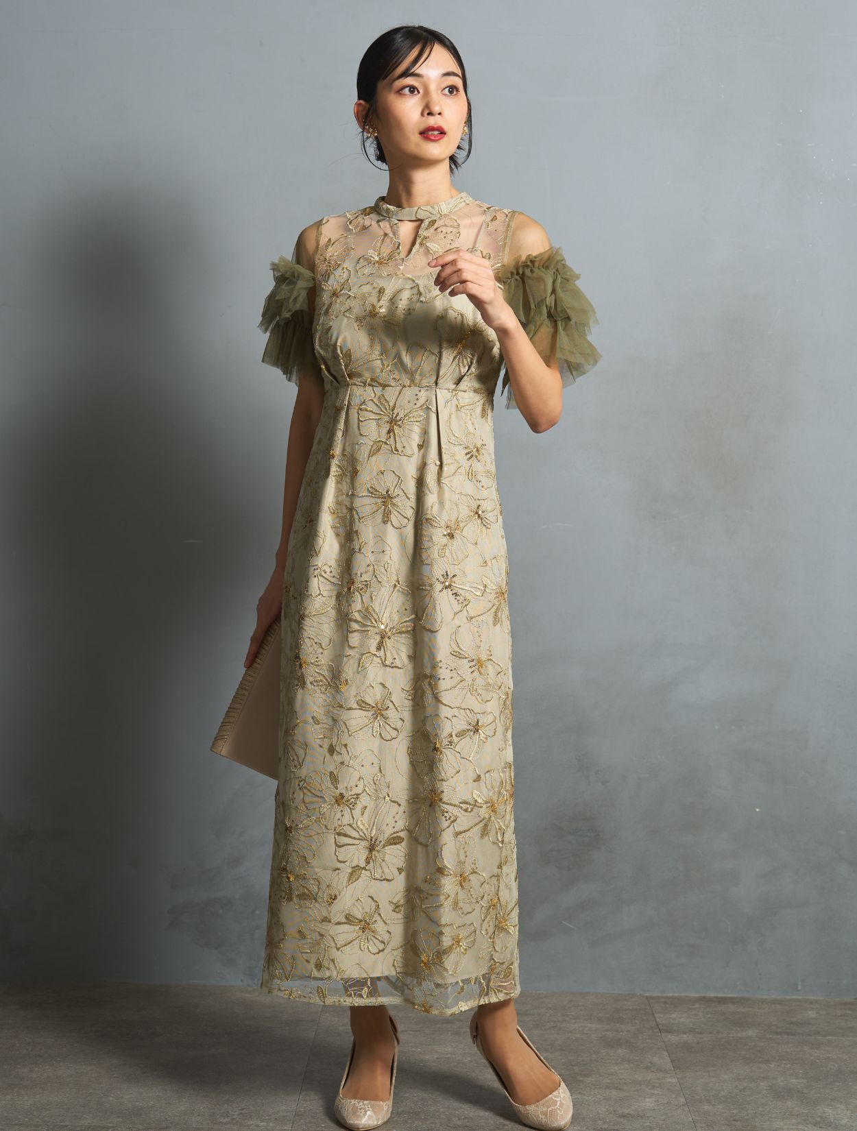 スモークがかったライトグリーンは、カラードレスでも大人っぽく上品な雰囲気に。程よく光沢のある同色の刺繍に細かいゴールドのスパンコールは、イエローベースのお肌に良くマッチします。カーキグリーンのチュールスリーブが、全体の引き締めカラーに。