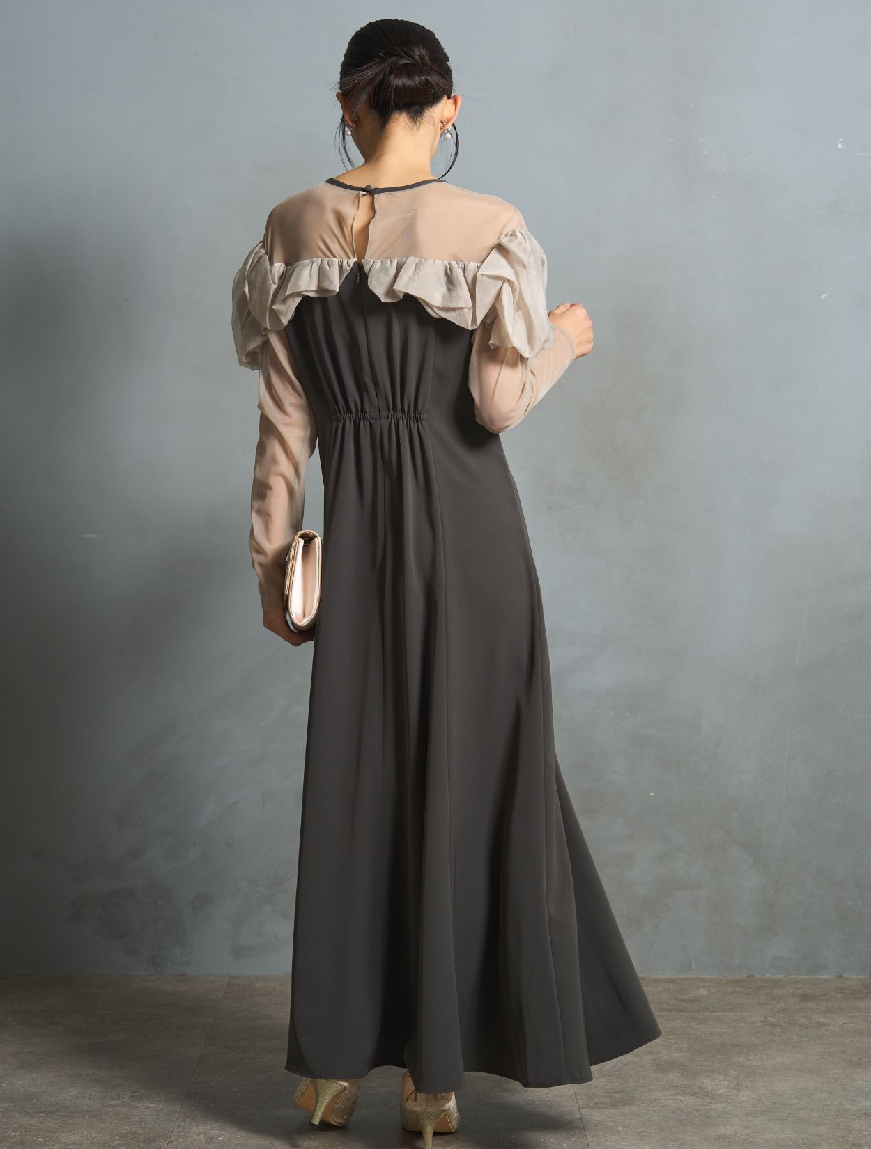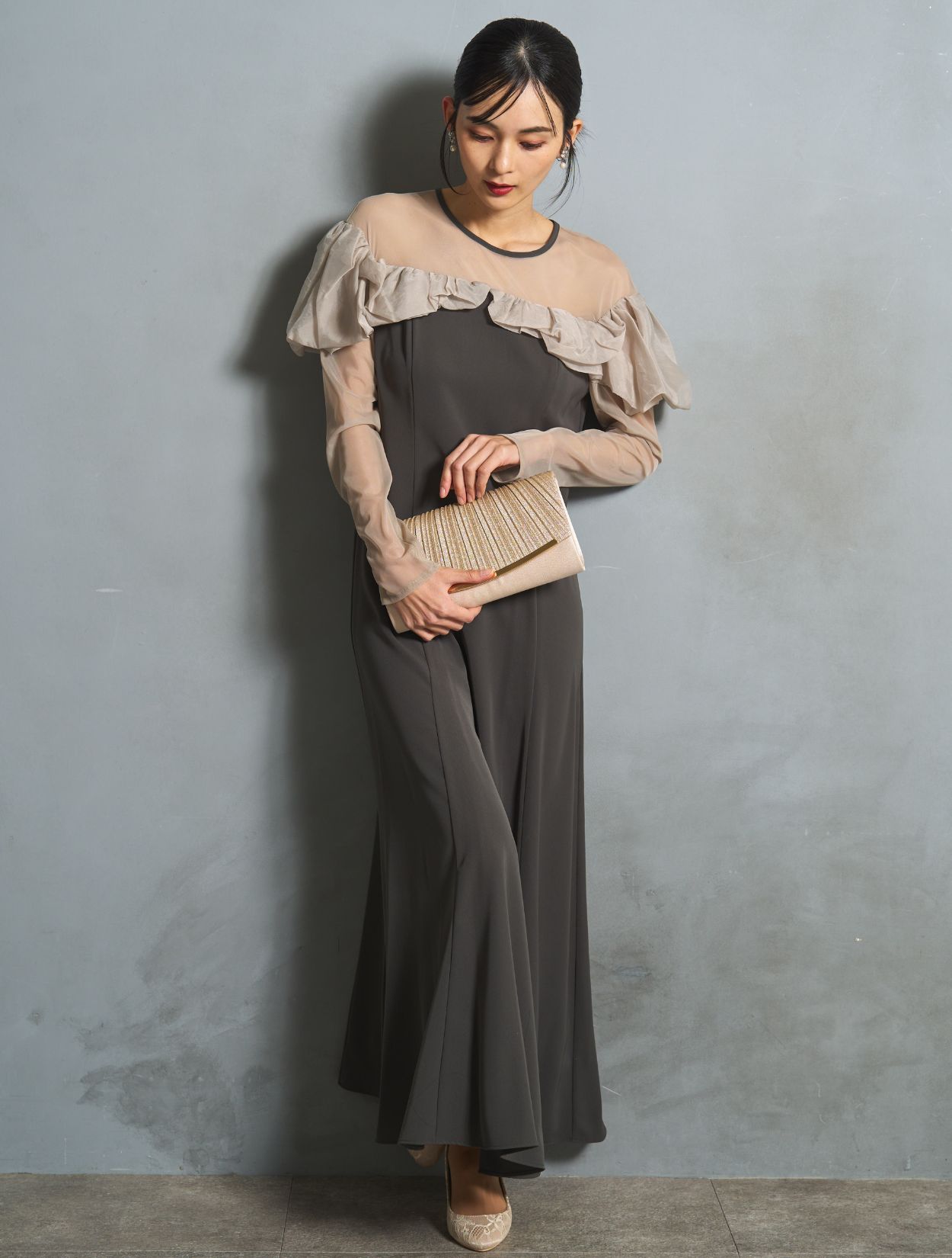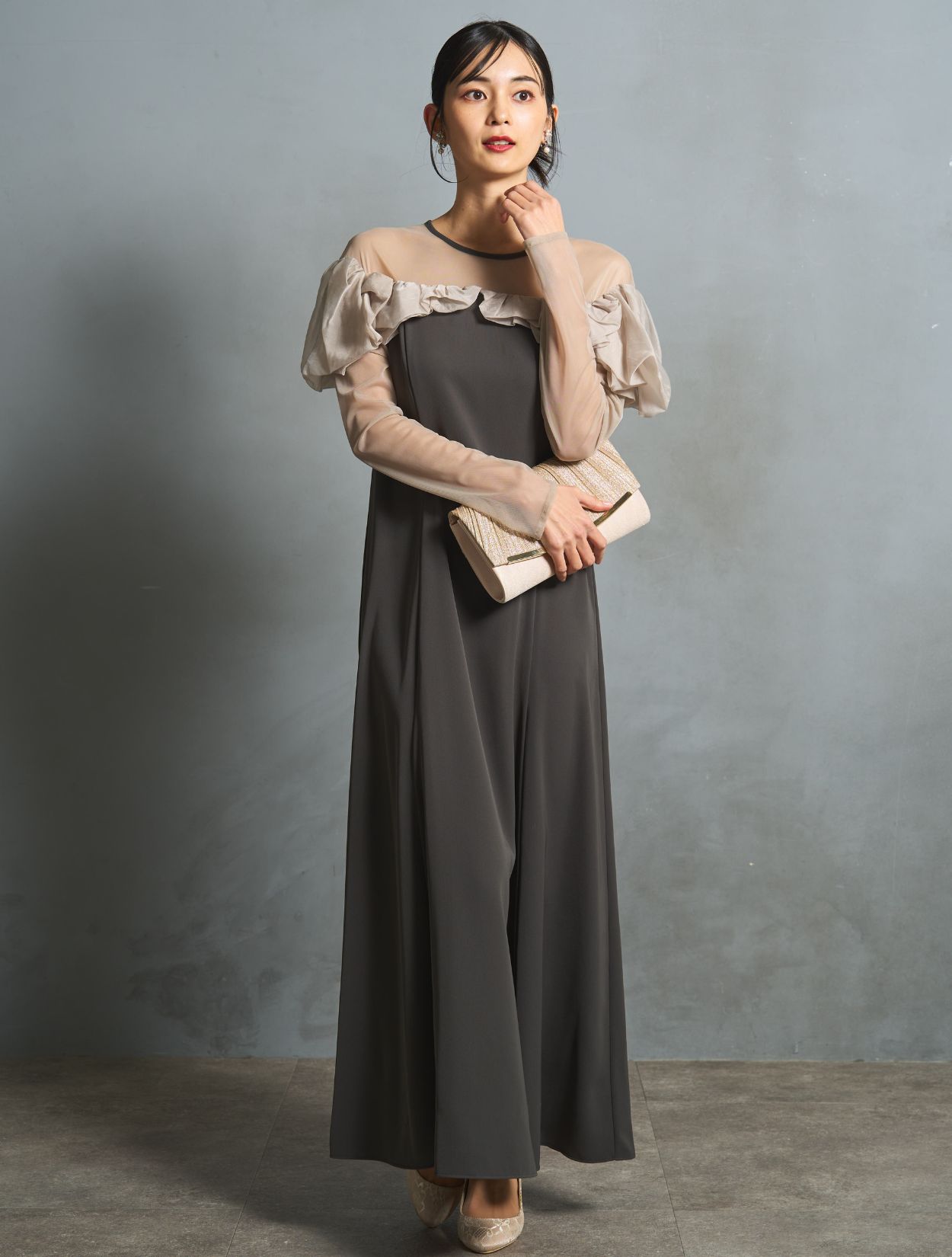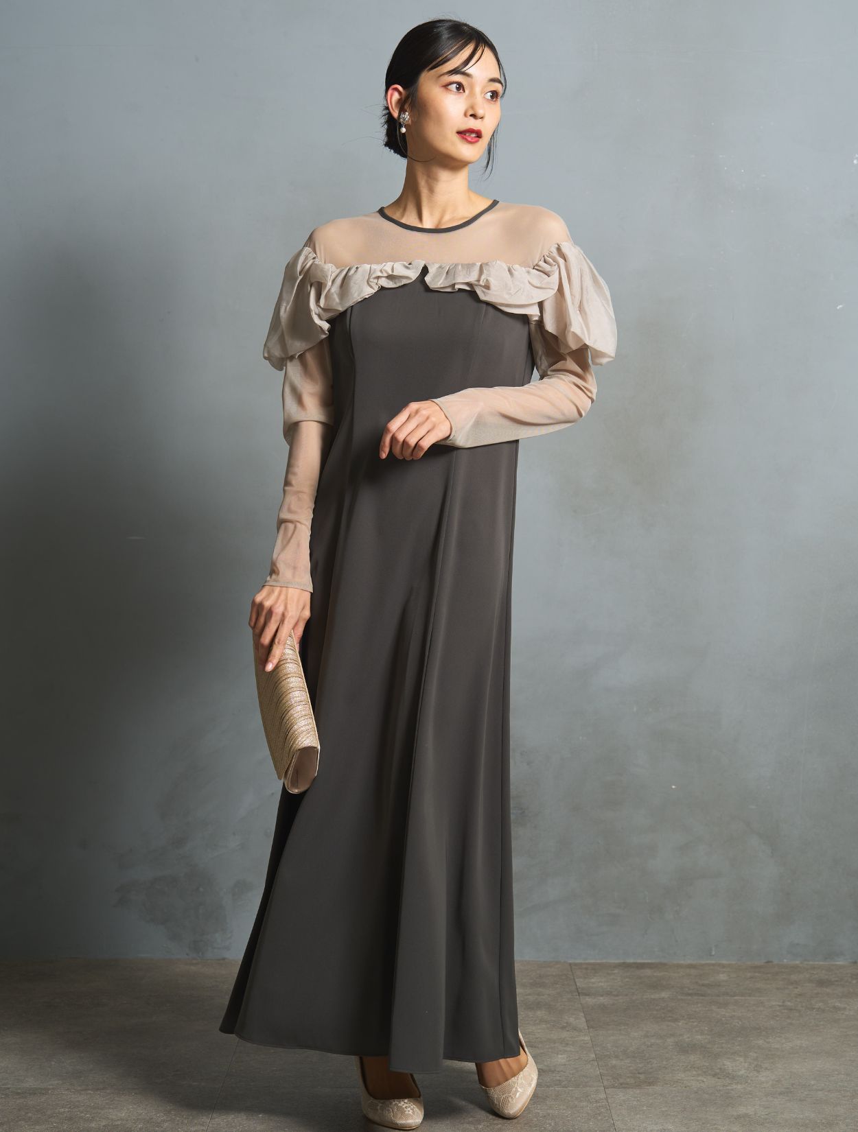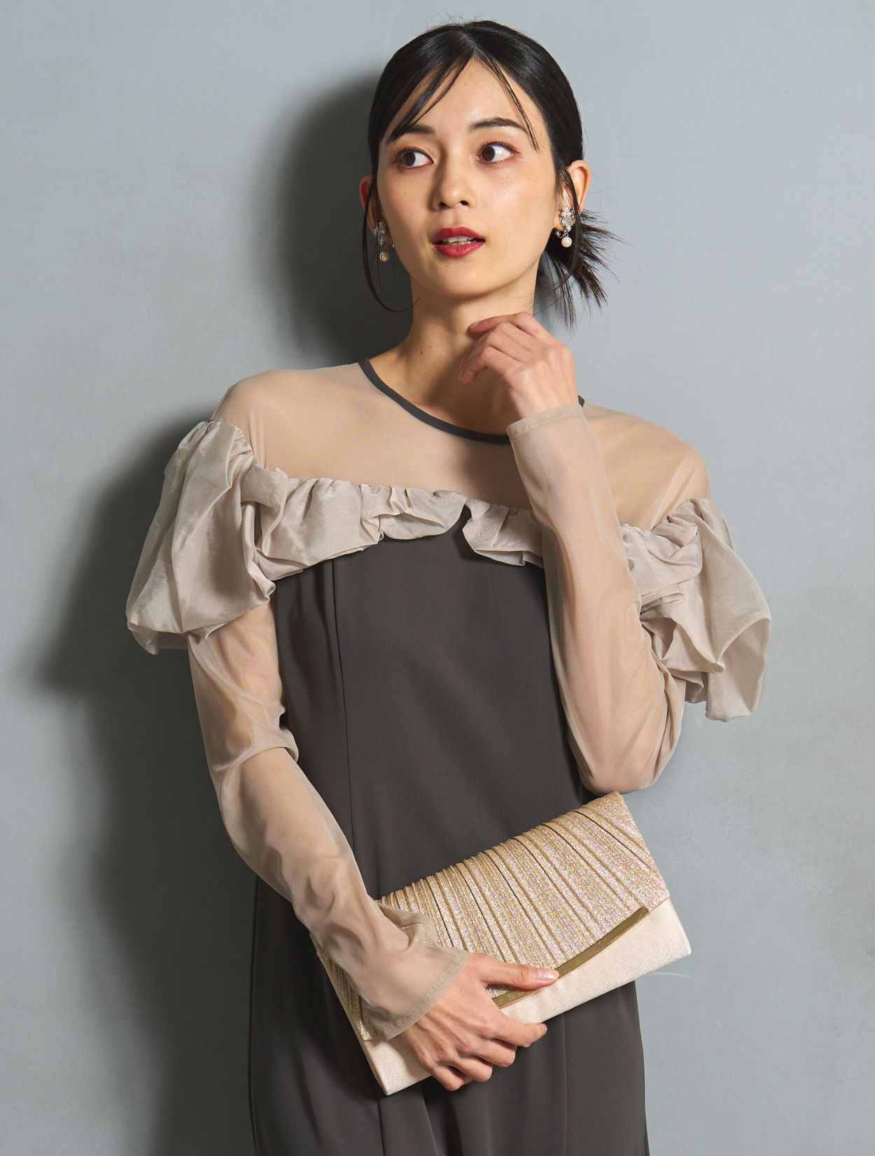 シンプルなAラインスカートのドレスに、トレンド感のあるフリルがポイントのドレス。フリル部分には立体感と艶のあるソフトオーガンジー、デコルテからスリーブ部分にはマットチュールが使われており、異素材の組み合わせがさりげなくおしゃれに見せてくれます。ネック部分にはパイピングがされており、お顔回りにメリハリをプラス。ネックラインは詰まり過ぎていないので、短い首が悩みの方でも着こなしやすいデザインです。ウエストにかけて自然とくびれて、華やかにフレアに広がるスカートのワンピースは、シンプルながらもスタイルアップ効果抜群です。お腹周りはスッキリ見えるのに締め付け感はなく、背中部分のウエストはゴム仕様なので、サイズ感にも余裕が出ます。スカートには透け感がないので、重たく見えないように5?以上のヒールと合わせるのがスタイルアップ効果もありおすすめです。程よく透け感がありつつも全体的に露出を抑えたドレスは、肌見せが苦手な方でも着やすいです。