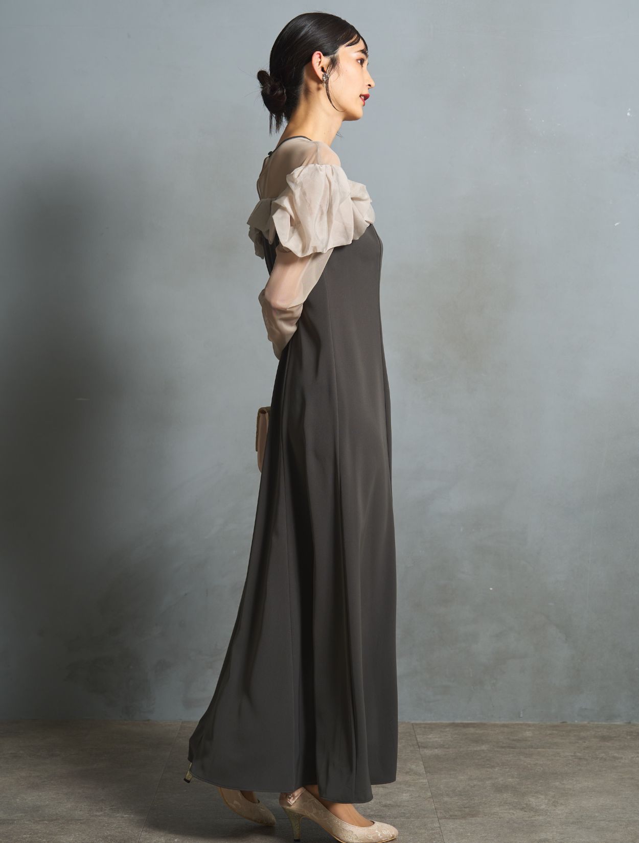 トレンド感が楽しめるニュアンスカラーのスモークグレー。デコルテからスリーブ部分にかけては、若干の黄味があるサンドグレー。どちらもおしゃれなカラーで被りにくいのがポイントです。個性的なドレスがお好きな方に人気です。