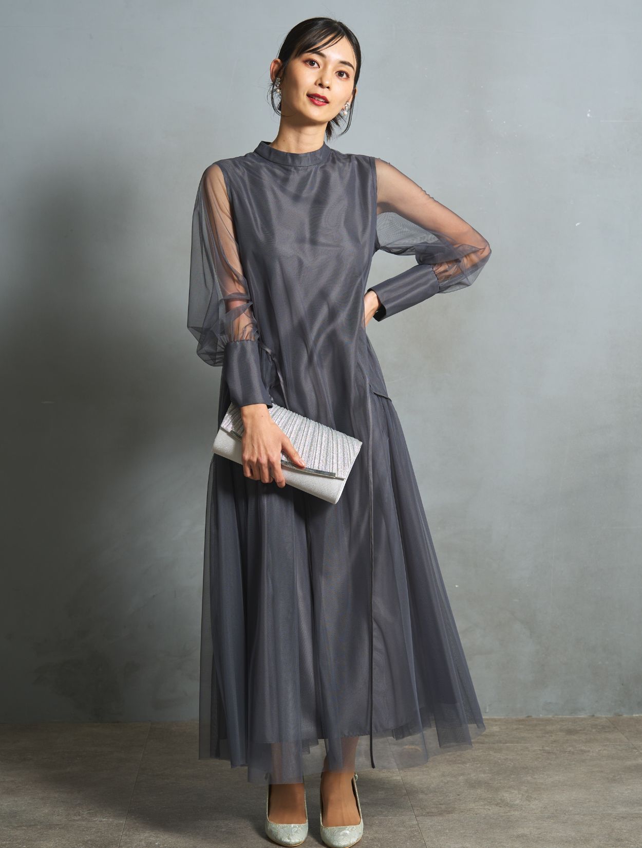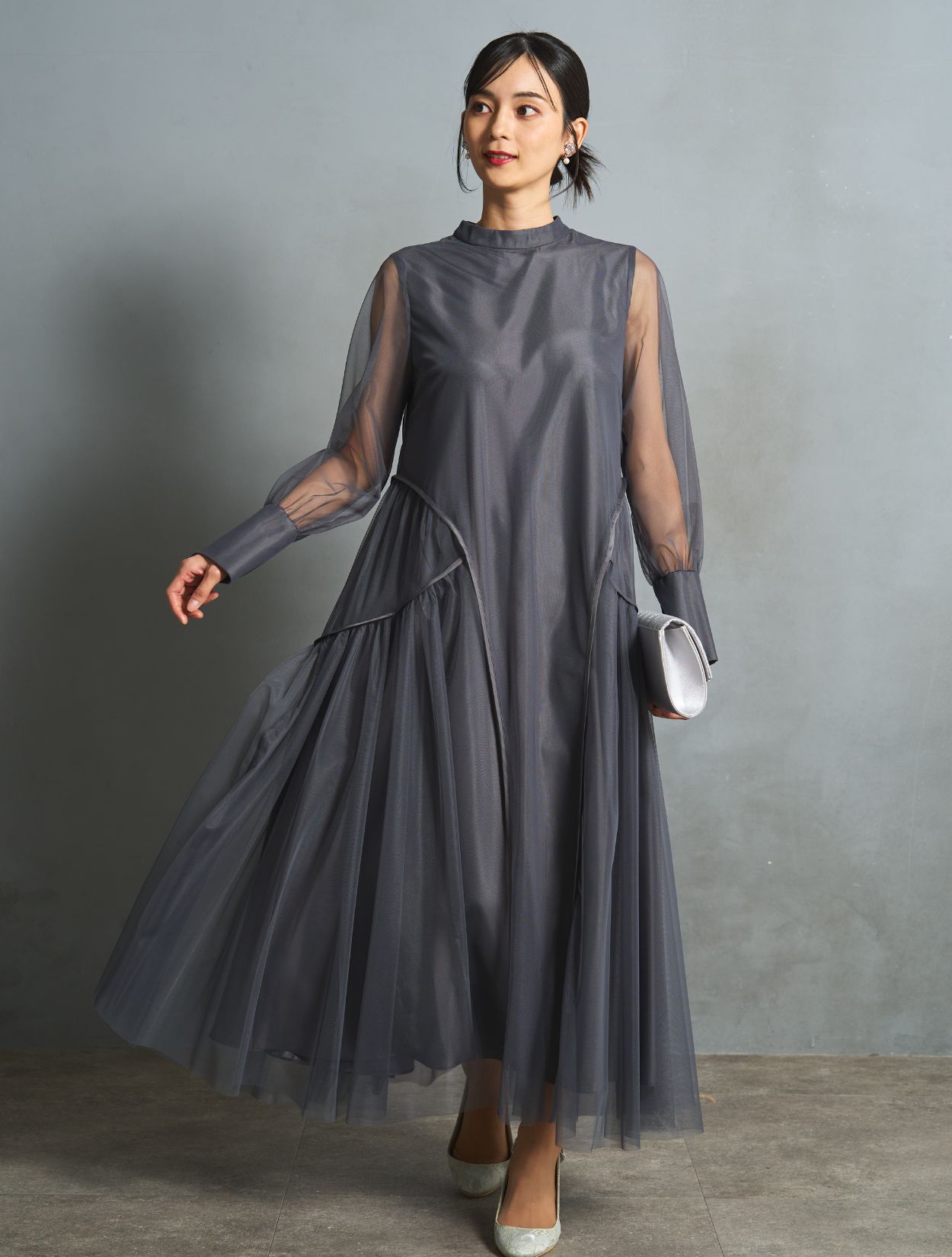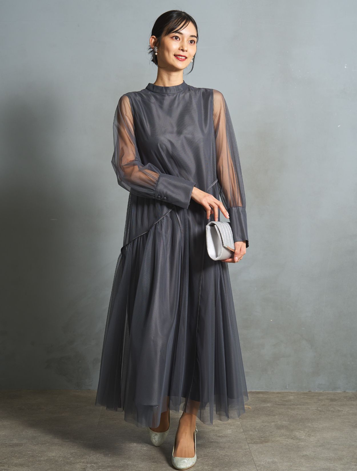 ニュアンス感がおしゃれなチャコールグレー。インナーワンピースの微光沢が、シックなカラーにこなれ感をプラスしてくれます。ブラックより明るく、ネイビーより被らない人気カラー。お呼ばれでもご親族でも使えるカラーです。