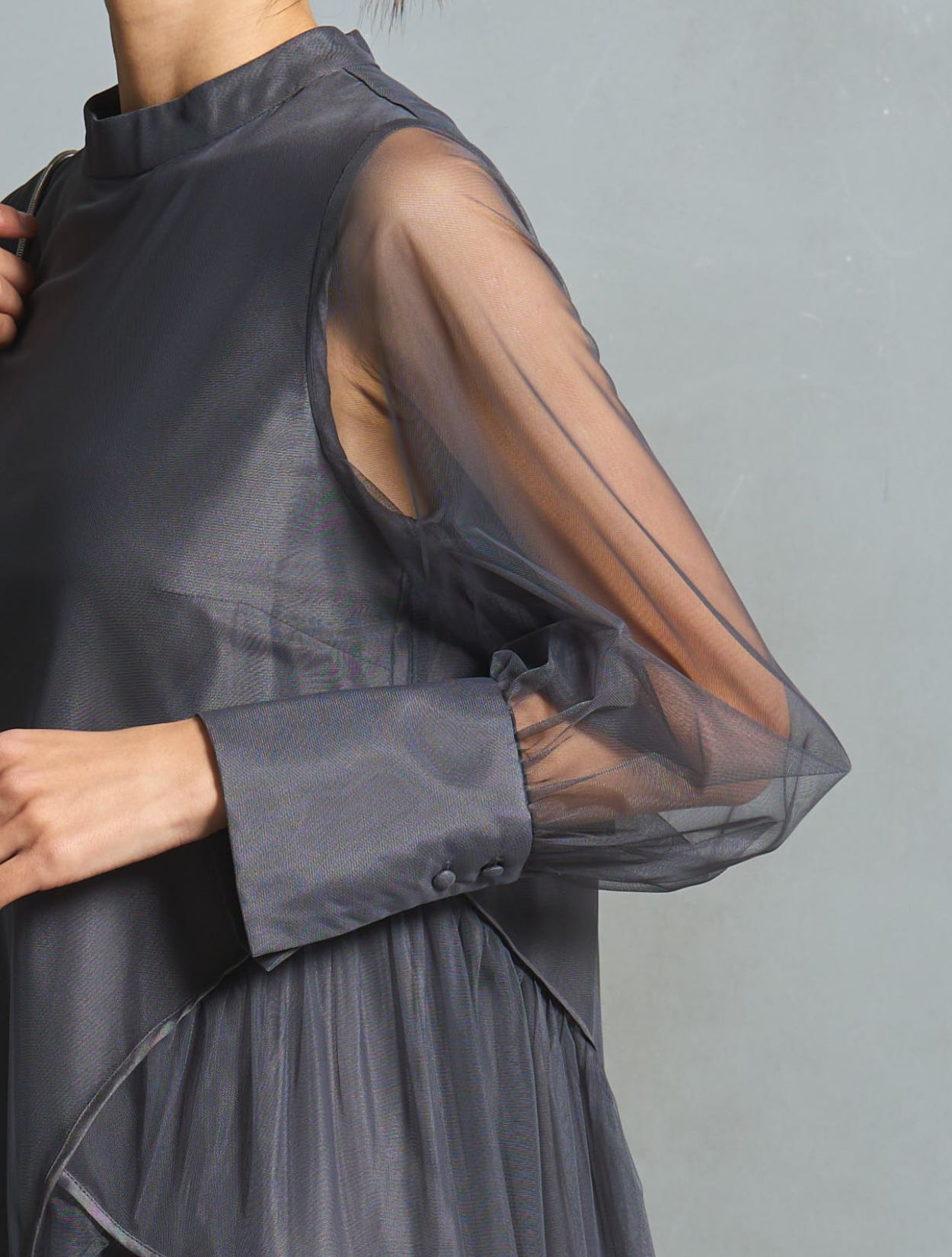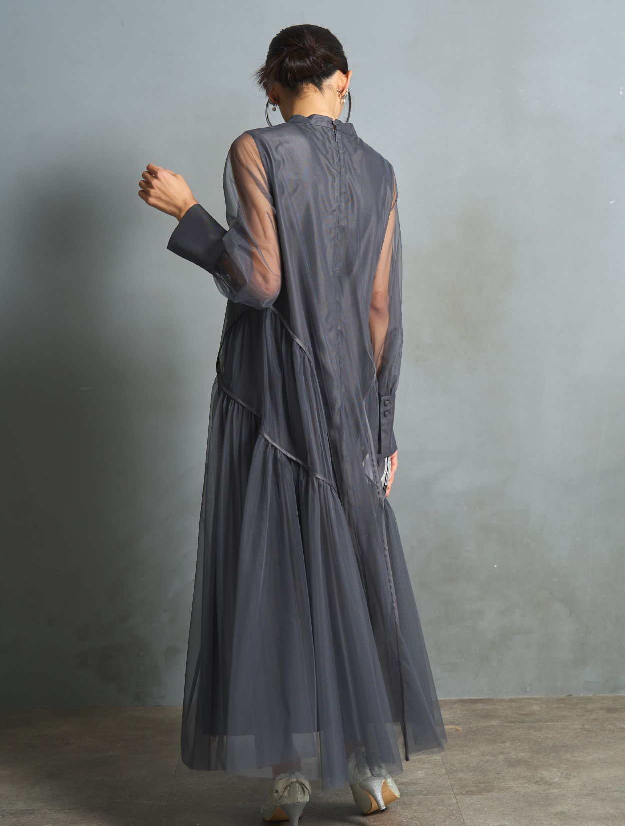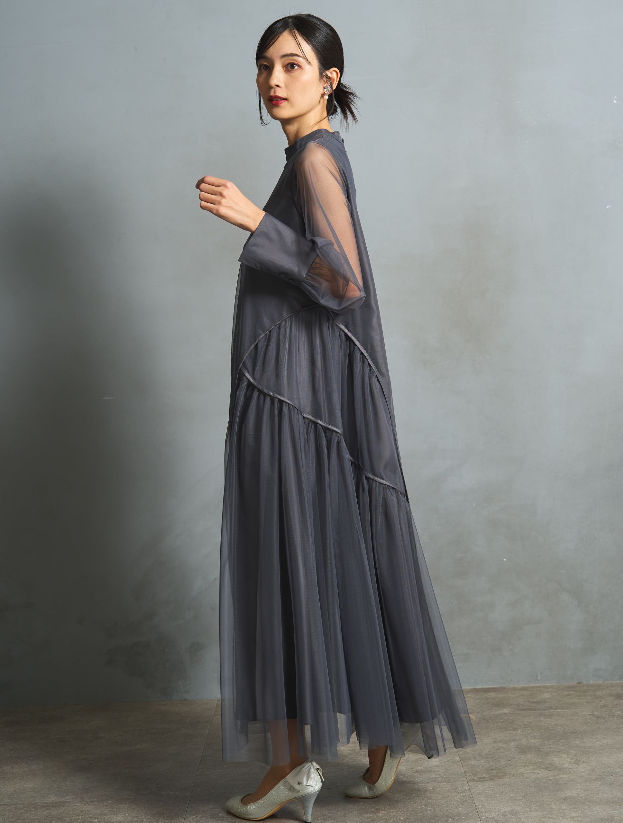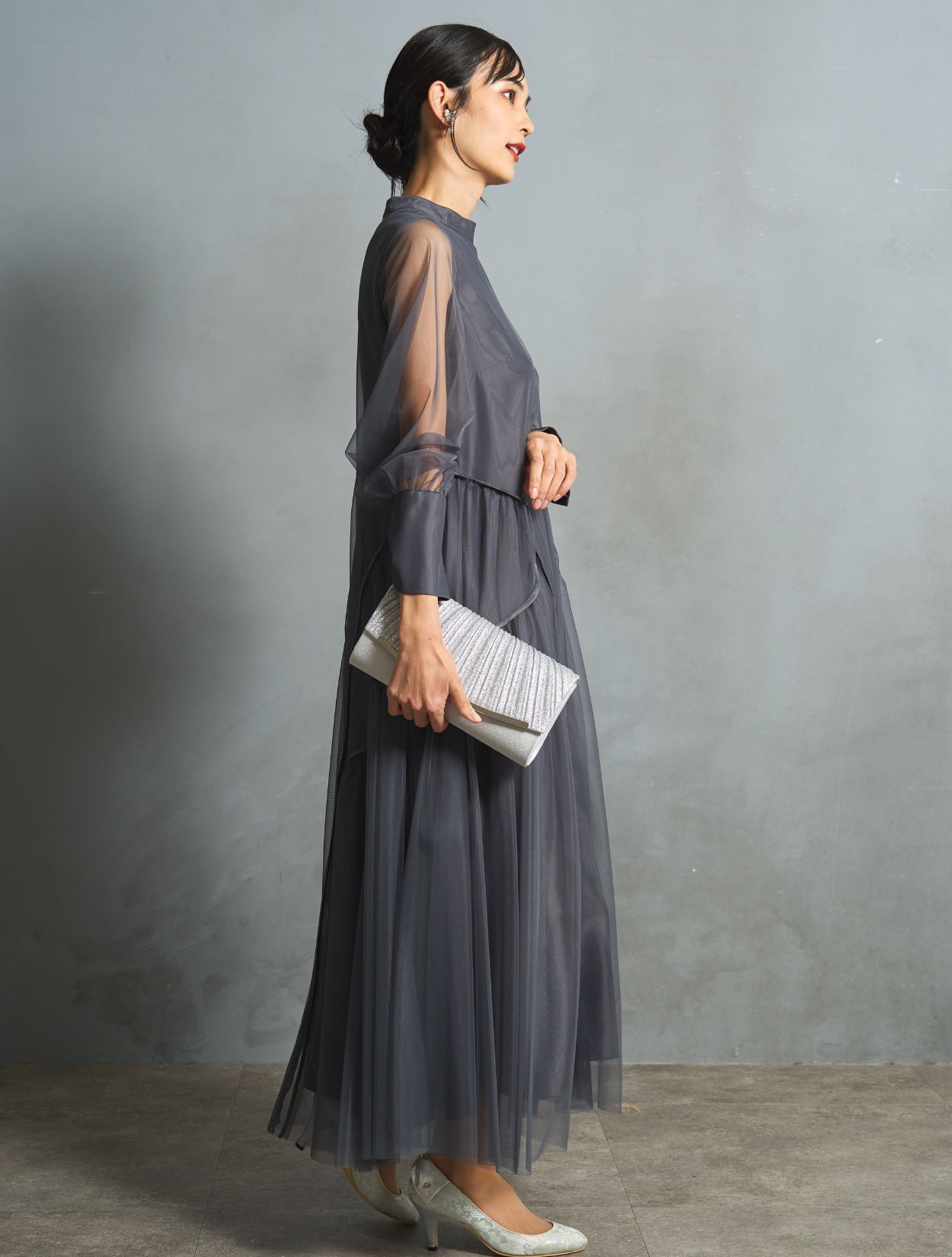 ニュアンス感がおしゃれなチャコールグレー。インナーワンピースの微光沢が、シックなカラーにこなれ感をプラスしてくれます。ブラックより明るく、ネイビーより被らない人気カラー。お呼ばれでもご親族でも使えるカラーです。