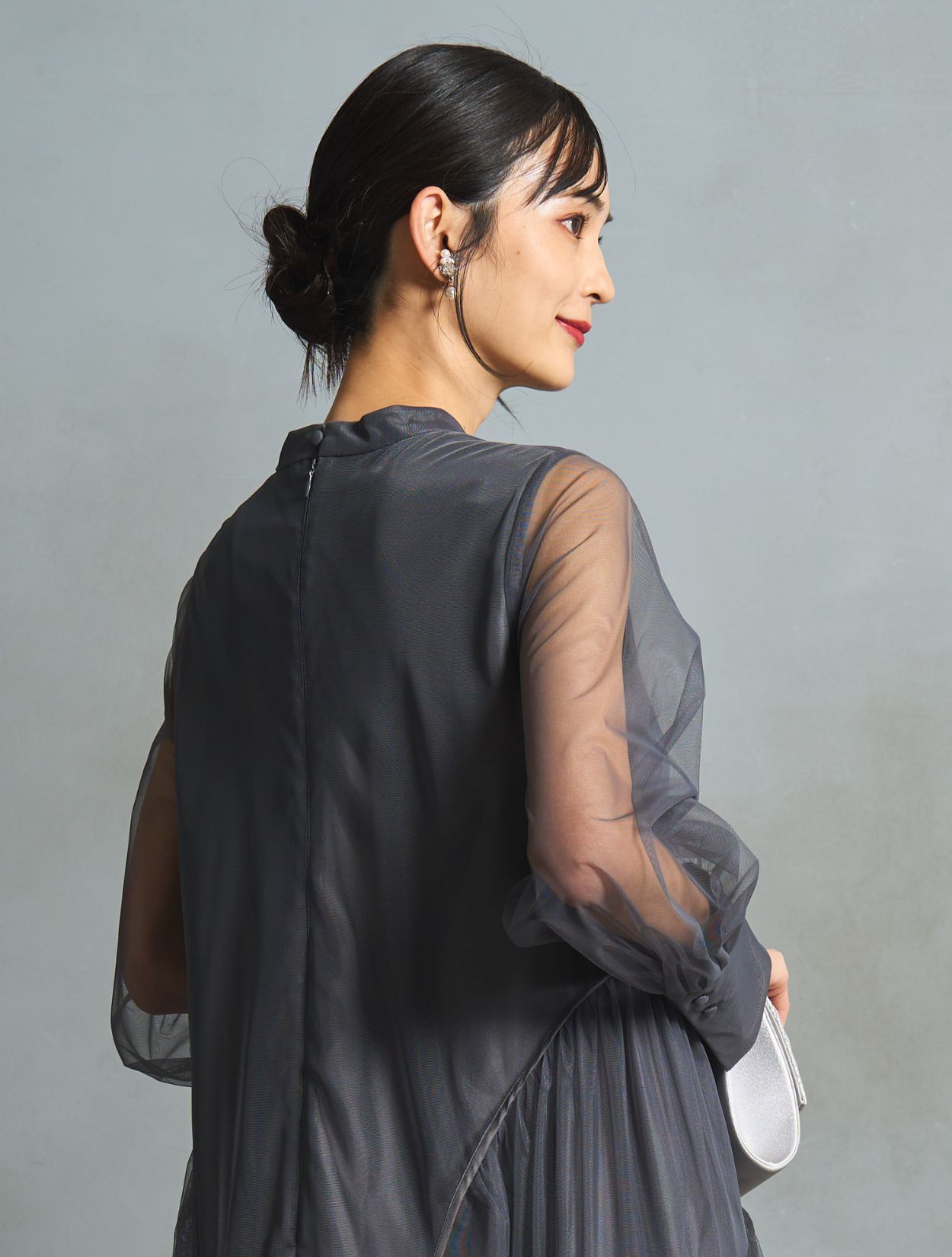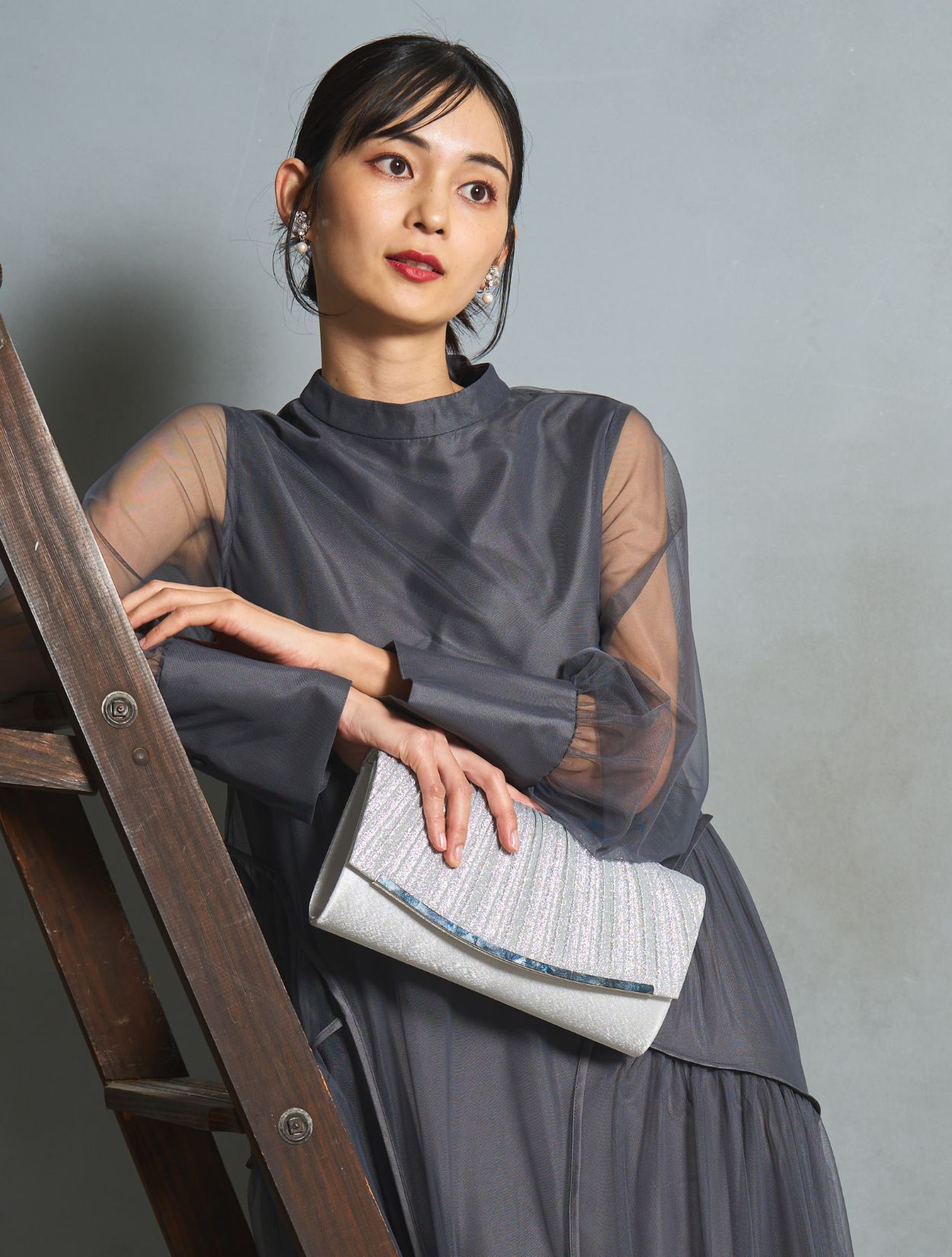フォーマル感のあるパーティーバッグを合わせてパーティー仕様にアップデート。バッグにはラメが使われていて、チャコールグレーのドレスに映えます。パールビジューのイヤリングもフォーマル度やパーティー感をアップしてくれるアイテム。写真写りも華やかになります。