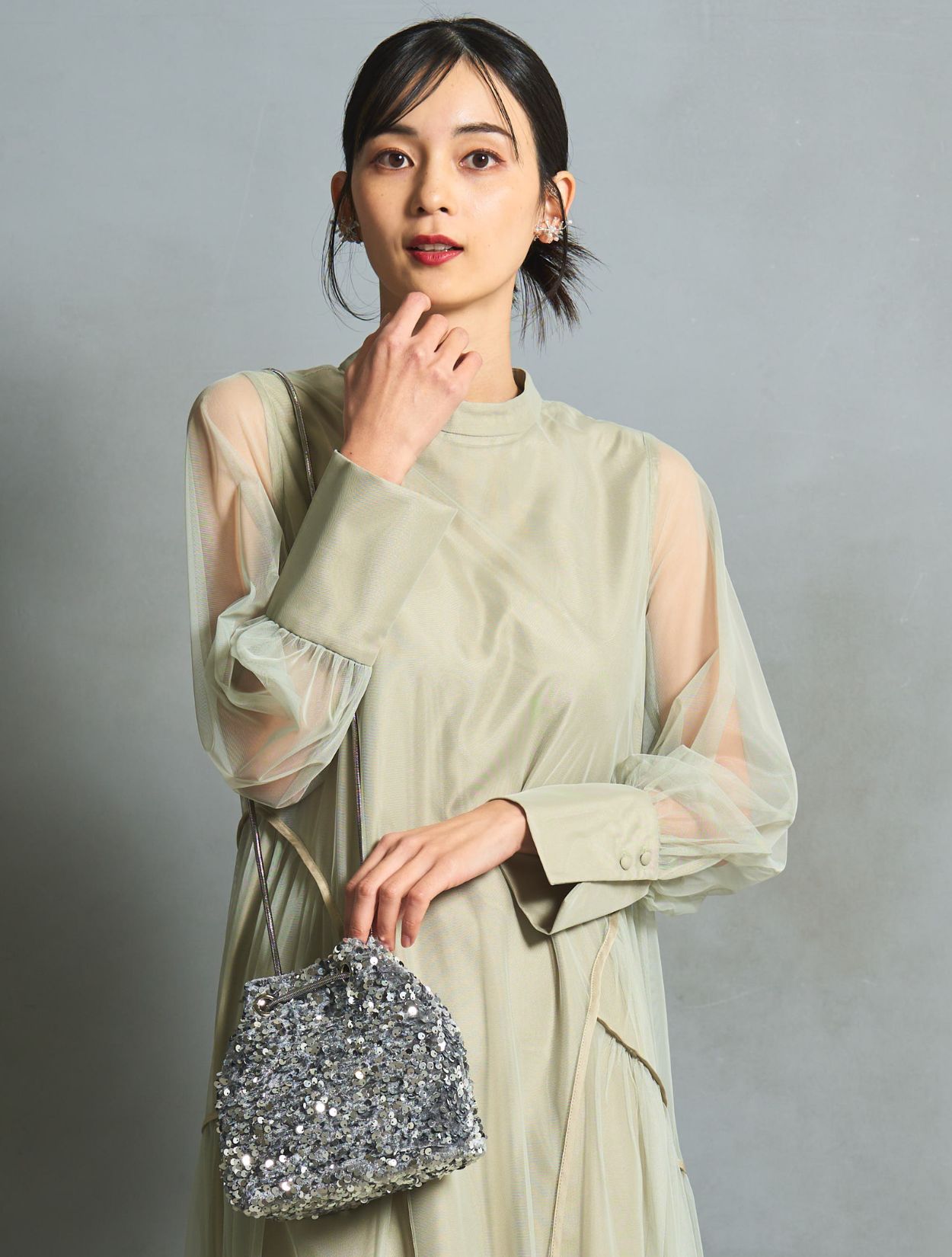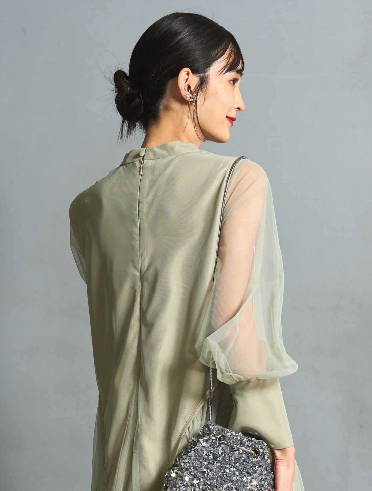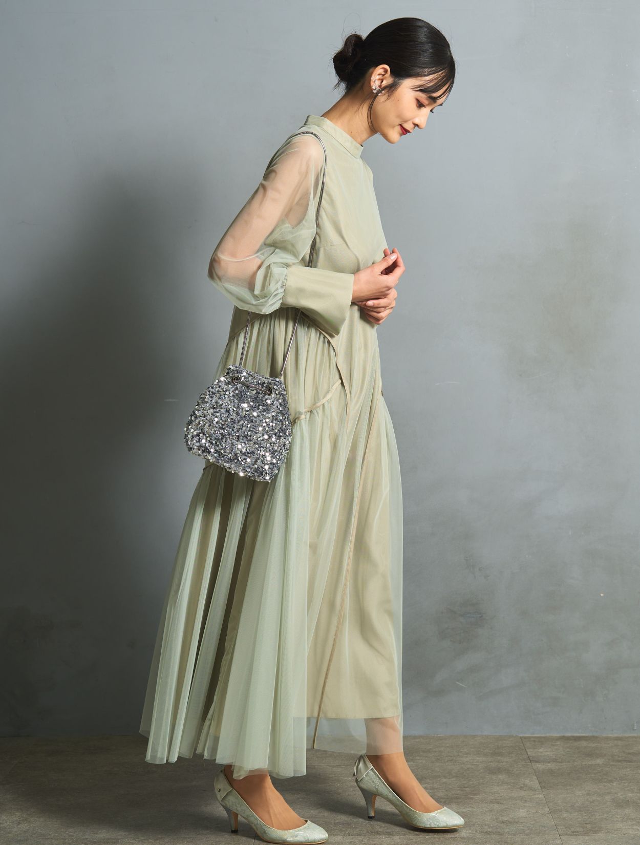 シルバーのスパンコールバッグを合わせた華やかで清涼感のあるコーディネートです。いい意味でフォーマル感を抑えたトレンド感のある着こなしができます。結婚式にはもちろん、お食事会やデートにもおすすめです。耳元にはかわいいリーフのワイヤーイヤリング。こちらもさりげないおしゃれを楽しめます。