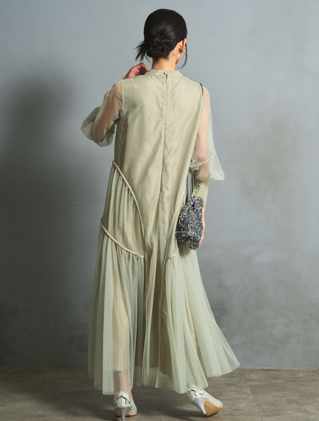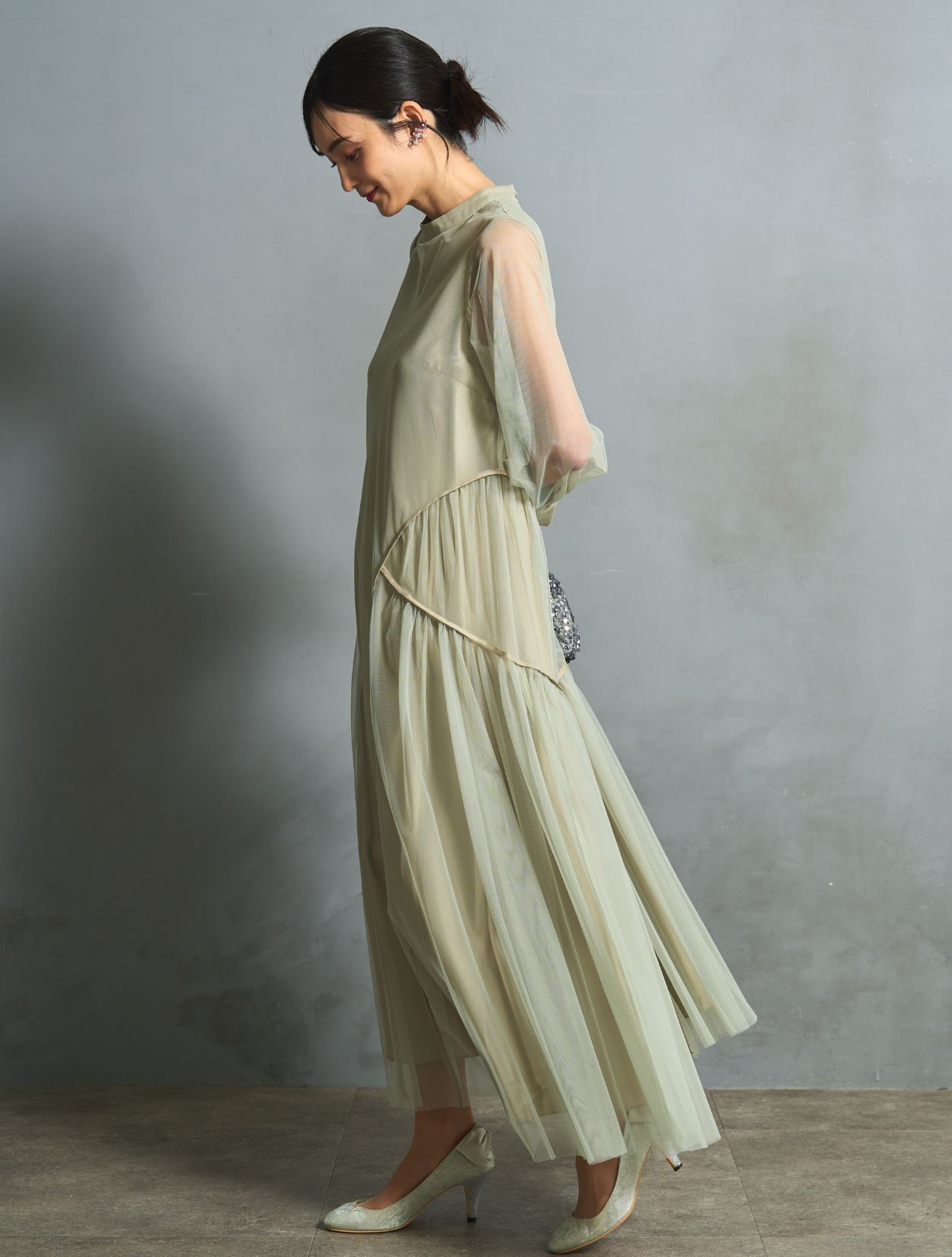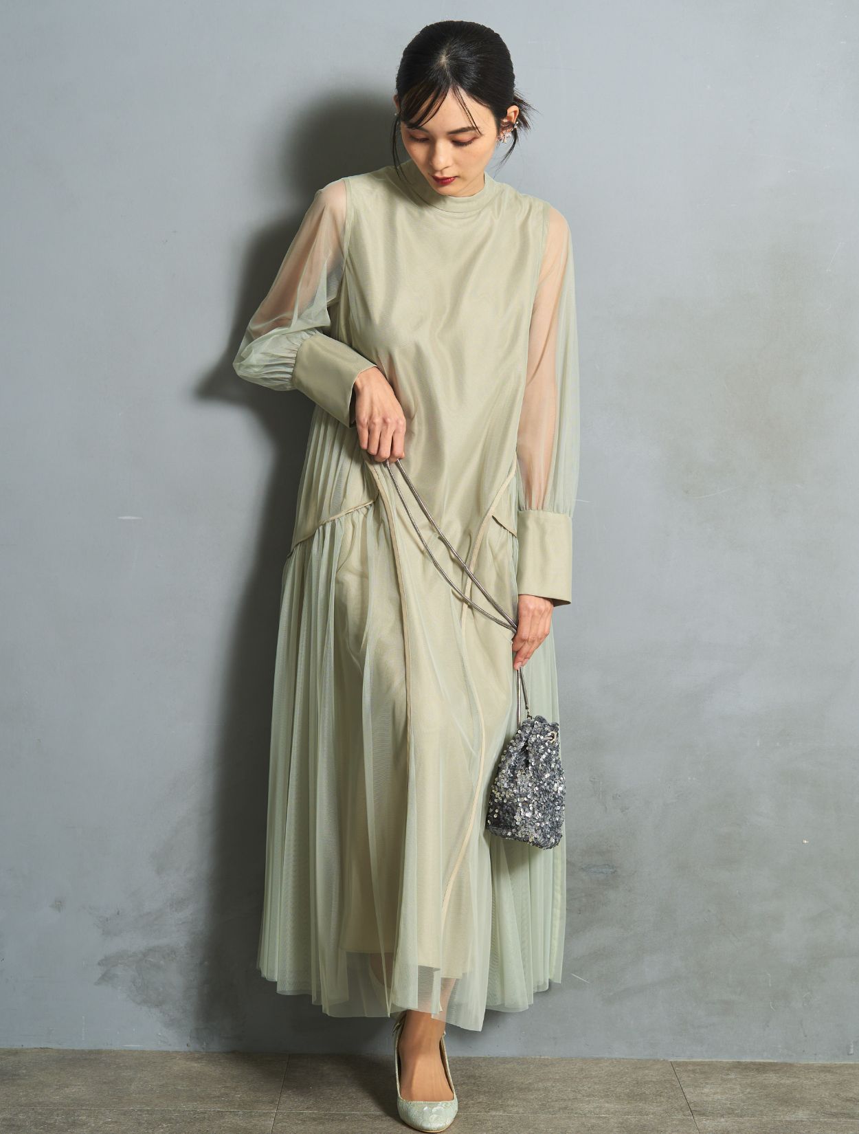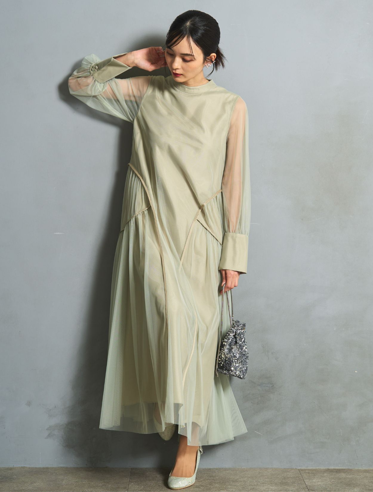 シルバーのスパンコールバッグを合わせた華やかで清涼感のあるコーディネートです。いい意味でフォーマル感を抑えたトレンド感のある着こなしができます。結婚式にはもちろん、お食事会やデートにもおすすめです。耳元にはかわいいリーフのワイヤーイヤリング。こちらもさりげないおしゃれを楽しめます。