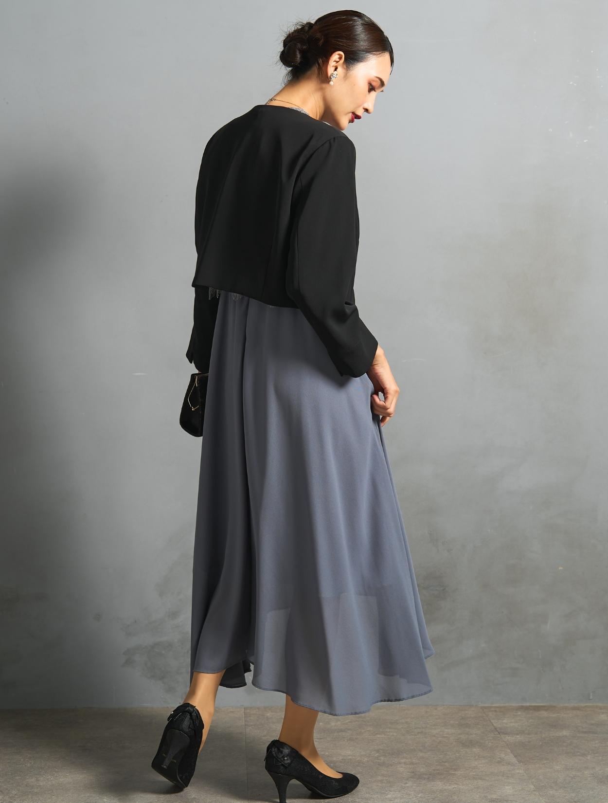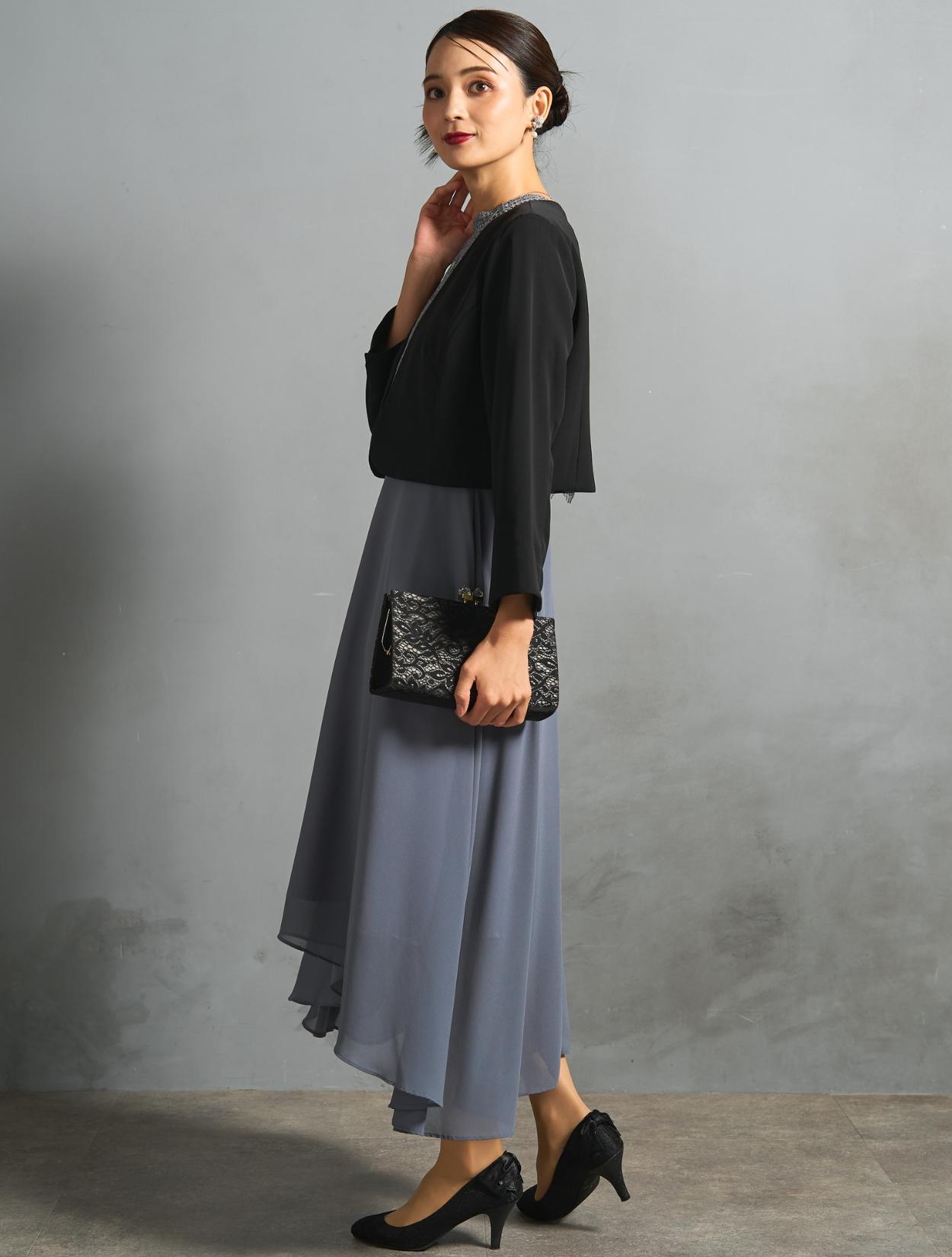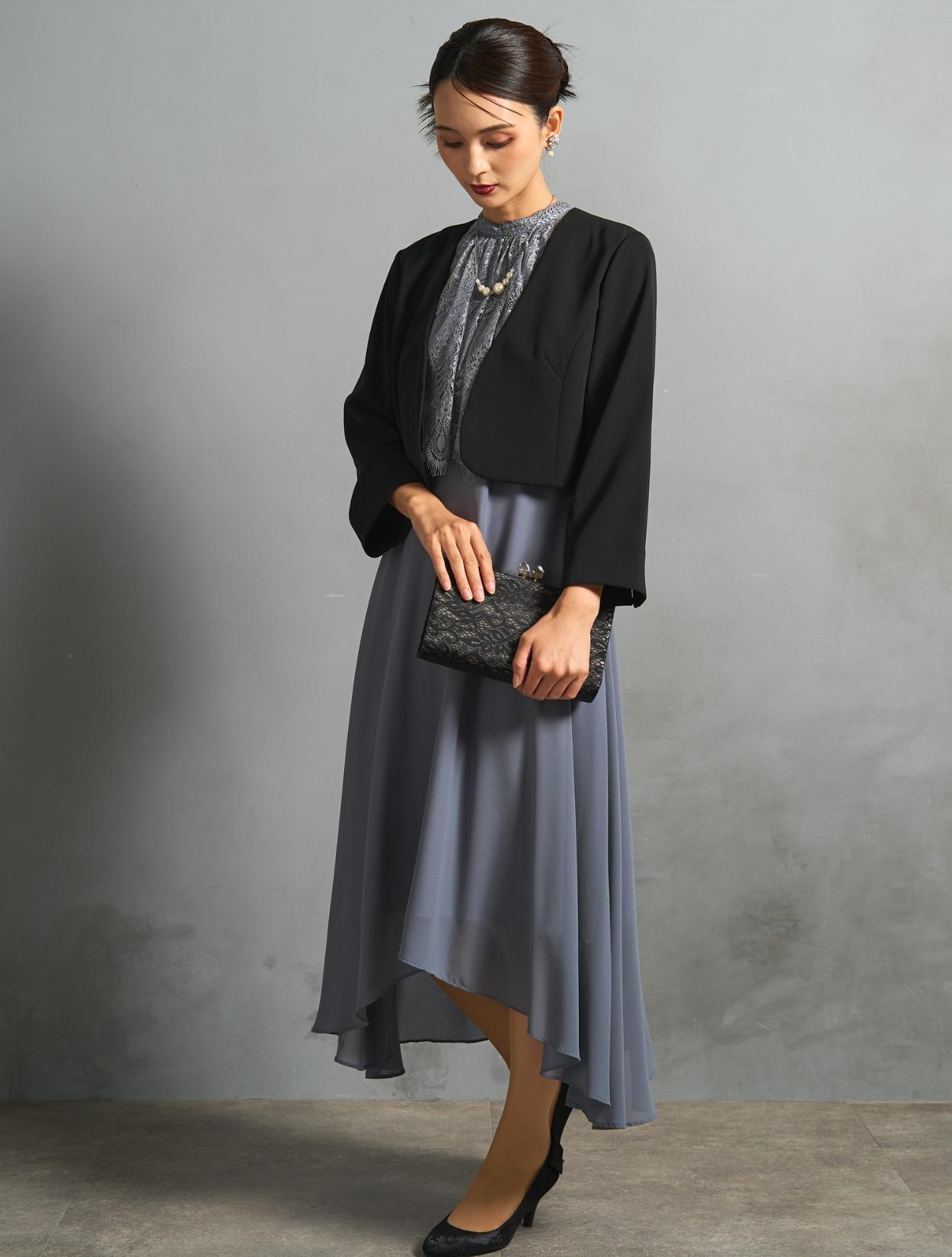 ブルーグレーのドレスにブラックジャケットを合わせた、きちんと感のある親族向きのコーディネート。ジャケットはペプラム仕様のデザインで、ブラックでも地味過ぎずフェミニンな雰囲気もあります。カラードレスを着たいご親族におすすめです。スタンドネックのデザインをスッキリ着こなす、長めのネックレスを合わせています。首が短いのがお悩みの方でも、視覚効果で詰まって見えにくいです。
