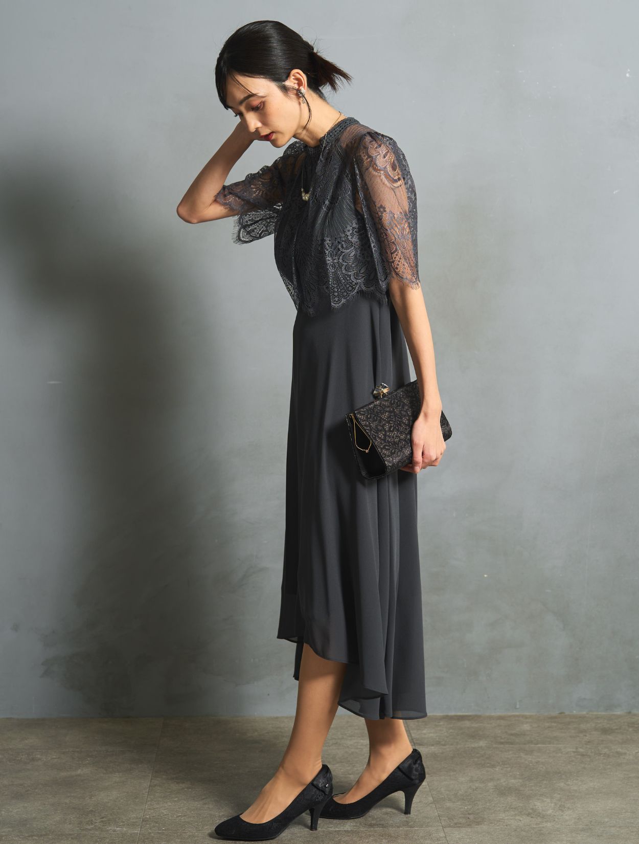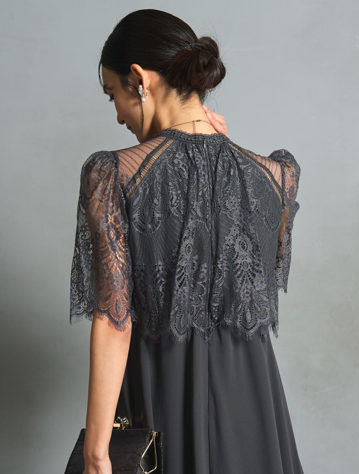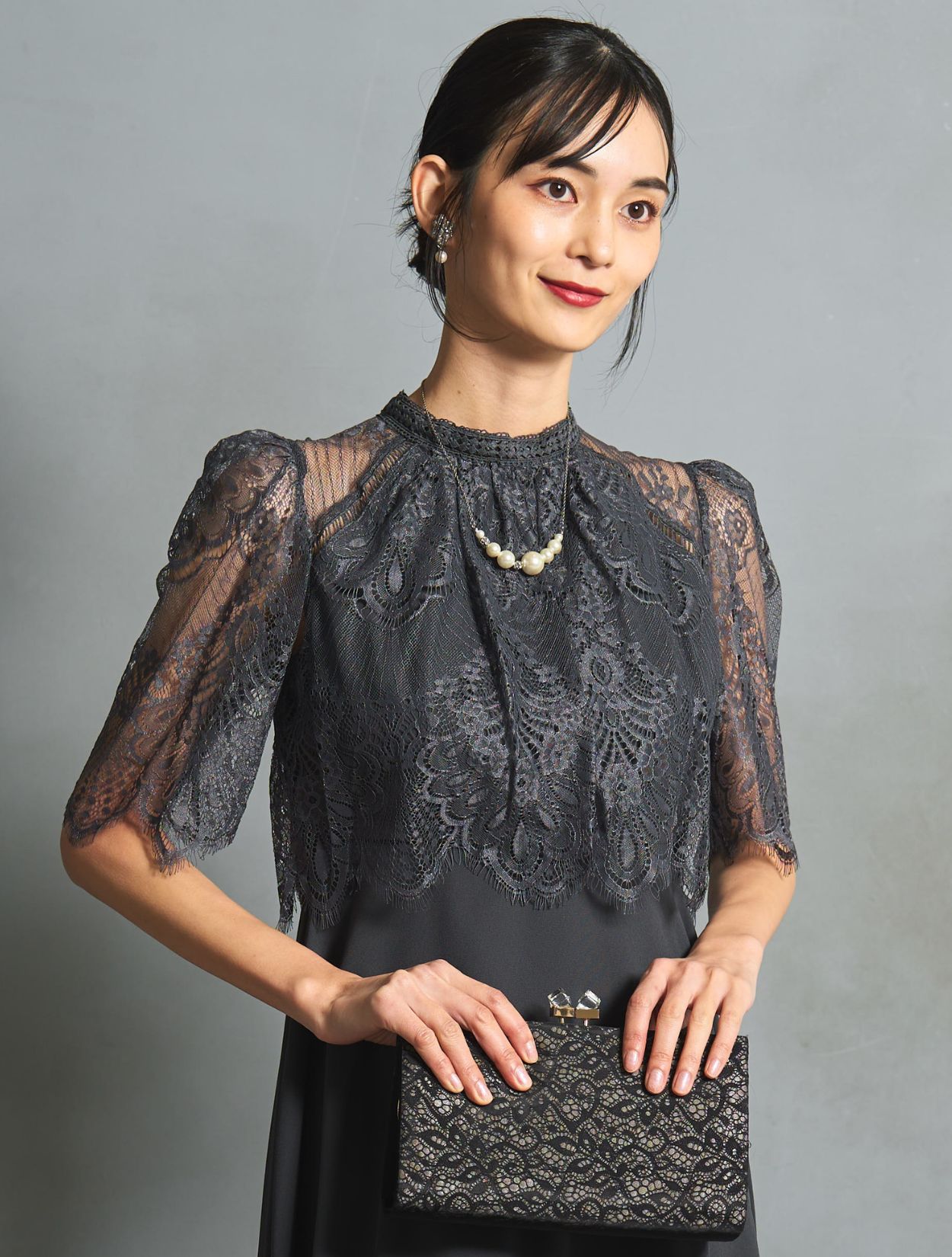 チャコールグレーのドレスにブラックのバッグを合わせたシックで大人っぽい組み合わせ。落ち着いた印象で、ご親族コーデとしても人気です。バッグはレースの柄が程よくアクセントになりドレスに立体感がでます。スタンドネックのデザインをスッキリ着こなす、長めのネックレスを合わせています。首が短いのがお悩みの方でも、視覚効果で詰まって見えにくいです。