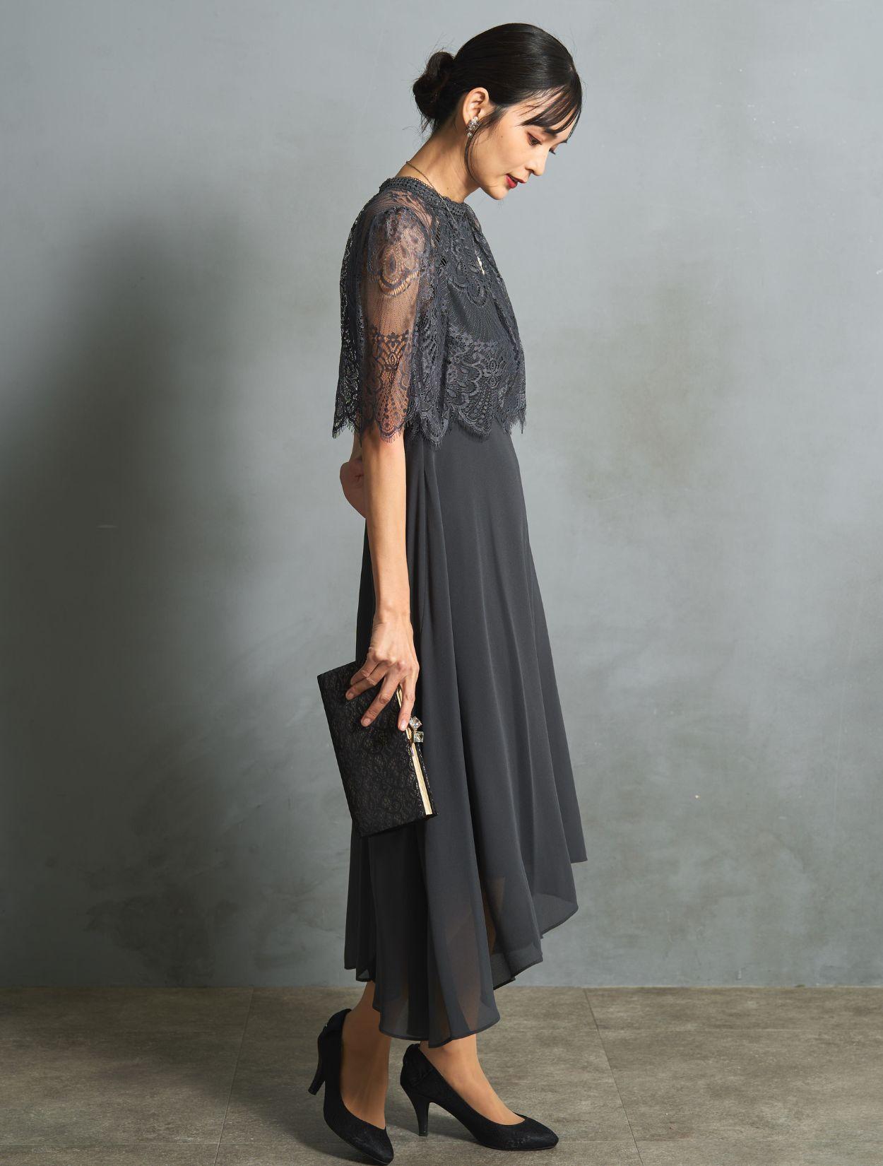 チャコールグレーのドレスにブラックのバッグを合わせたシックで大人っぽい組み合わせ。落ち着いた印象で、ご親族コーデとしても人気です。バッグはレースの柄が程よくアクセントになりドレスに立体感がでます。スタンドネックのデザインをスッキリ着こなす、長めのネックレスを合わせています。首が短いのがお悩みの方でも、視覚効果で詰まって見えにくいです。
