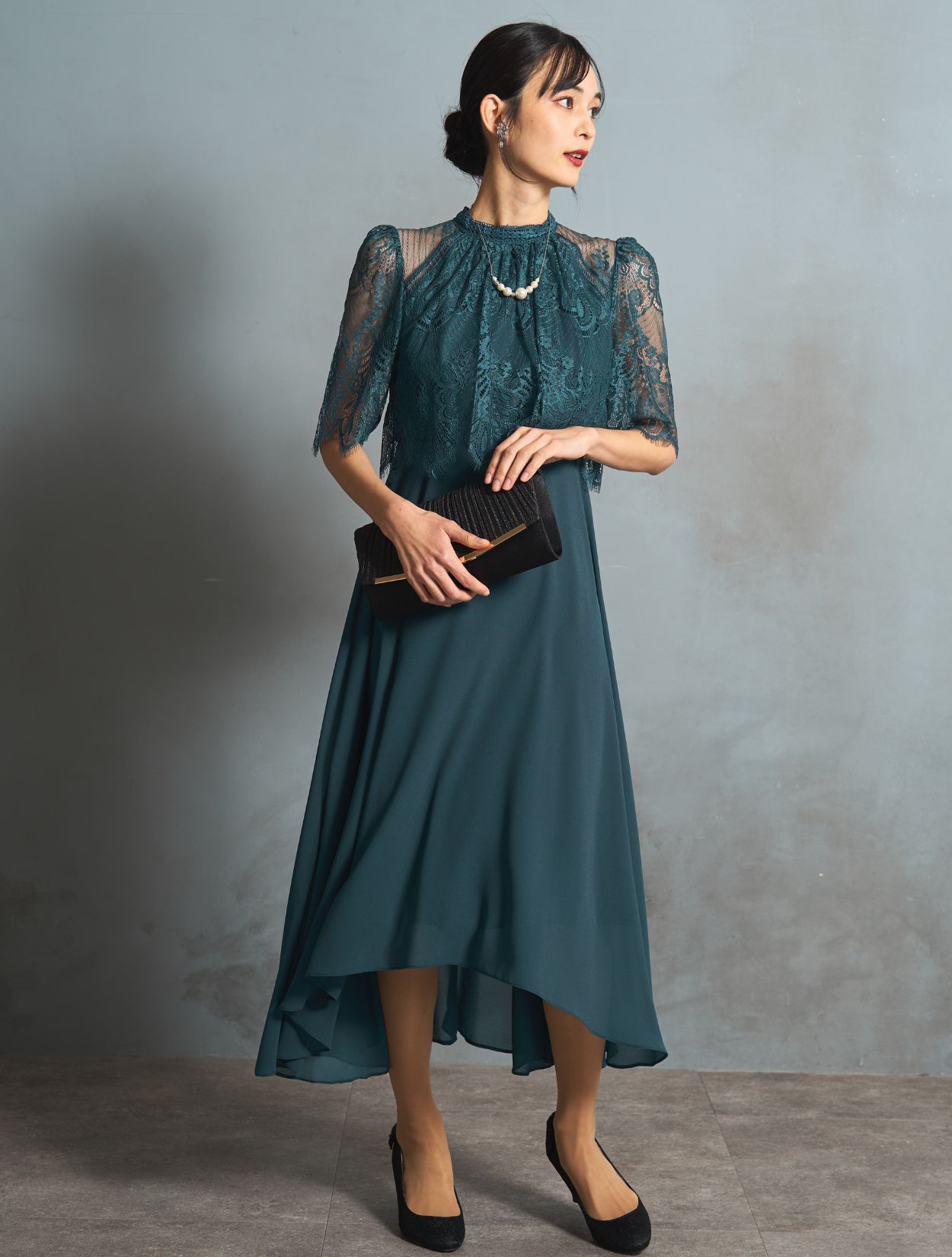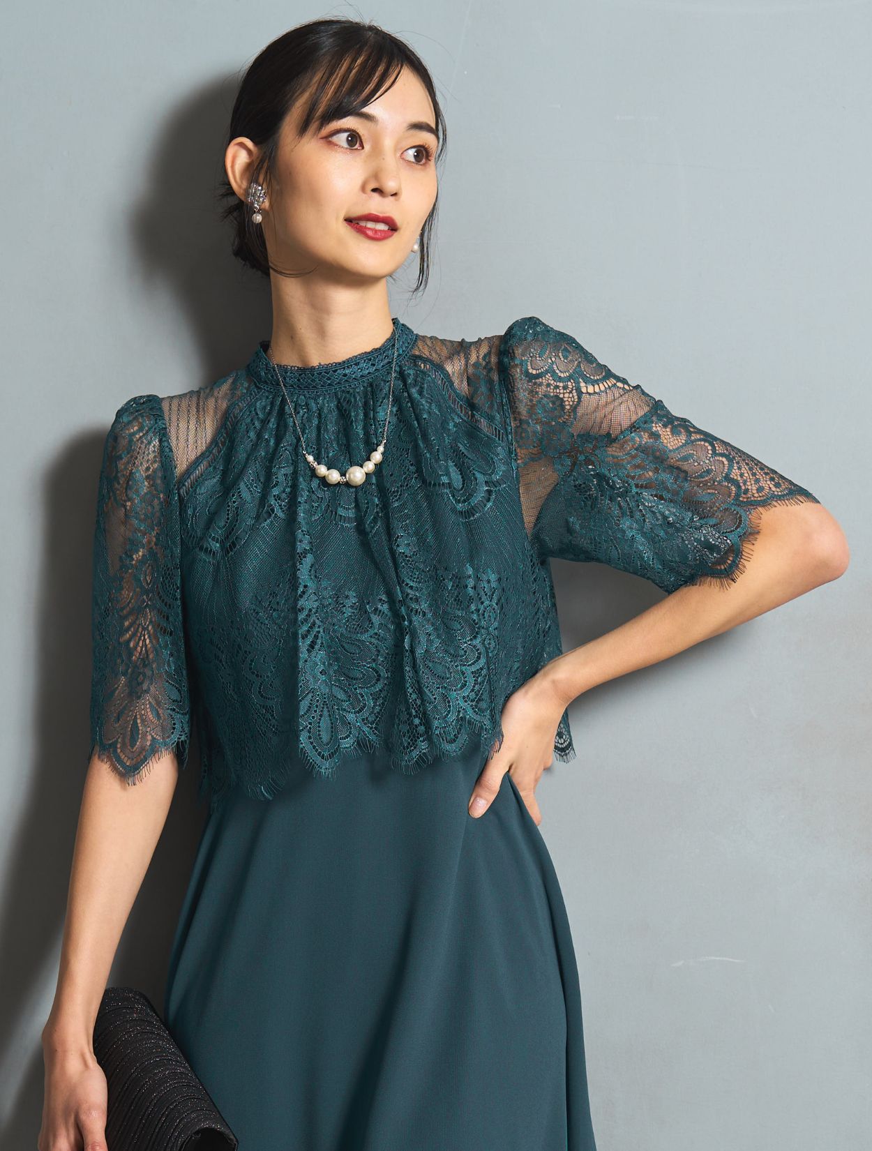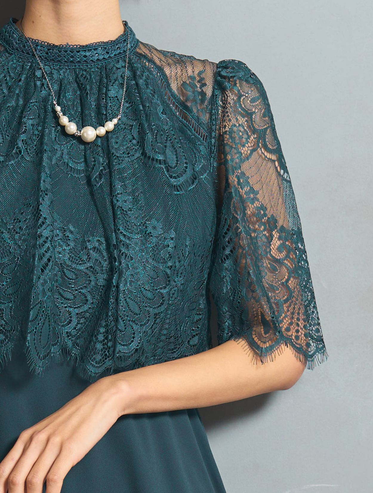 ヘム裾スカートが華やかなデザインのドレス。長すぎない丈感は、低身長の方にもおすすめです。ウエストの切り替えは、表からは見えないですが高めに設定されているので脚長効果抜群。低身長の方でもバランスよく着こなせます。フワッとしたオーバーブラウス風レースが、ウエストや腰周りをすっきり見せてくれる人気のデザイン。着痩せ効果がかなり期待できます。ウエストは背中部分のみゴム仕様で、着心地も◎。ミニスタンドネックが上品でクラシカルな印象。結婚式などのフォーマルな場面にぴったりです。肩から袖は透け感がありますが、デコルテ部分は透けないので幅広い年代が安心して着られます。