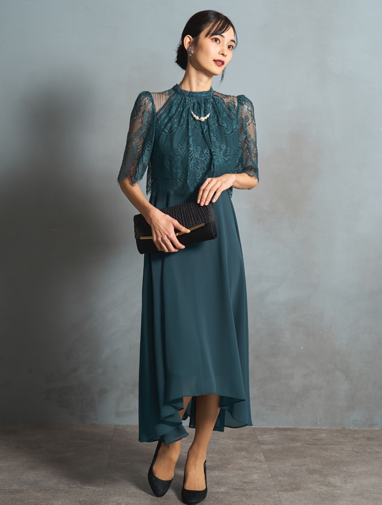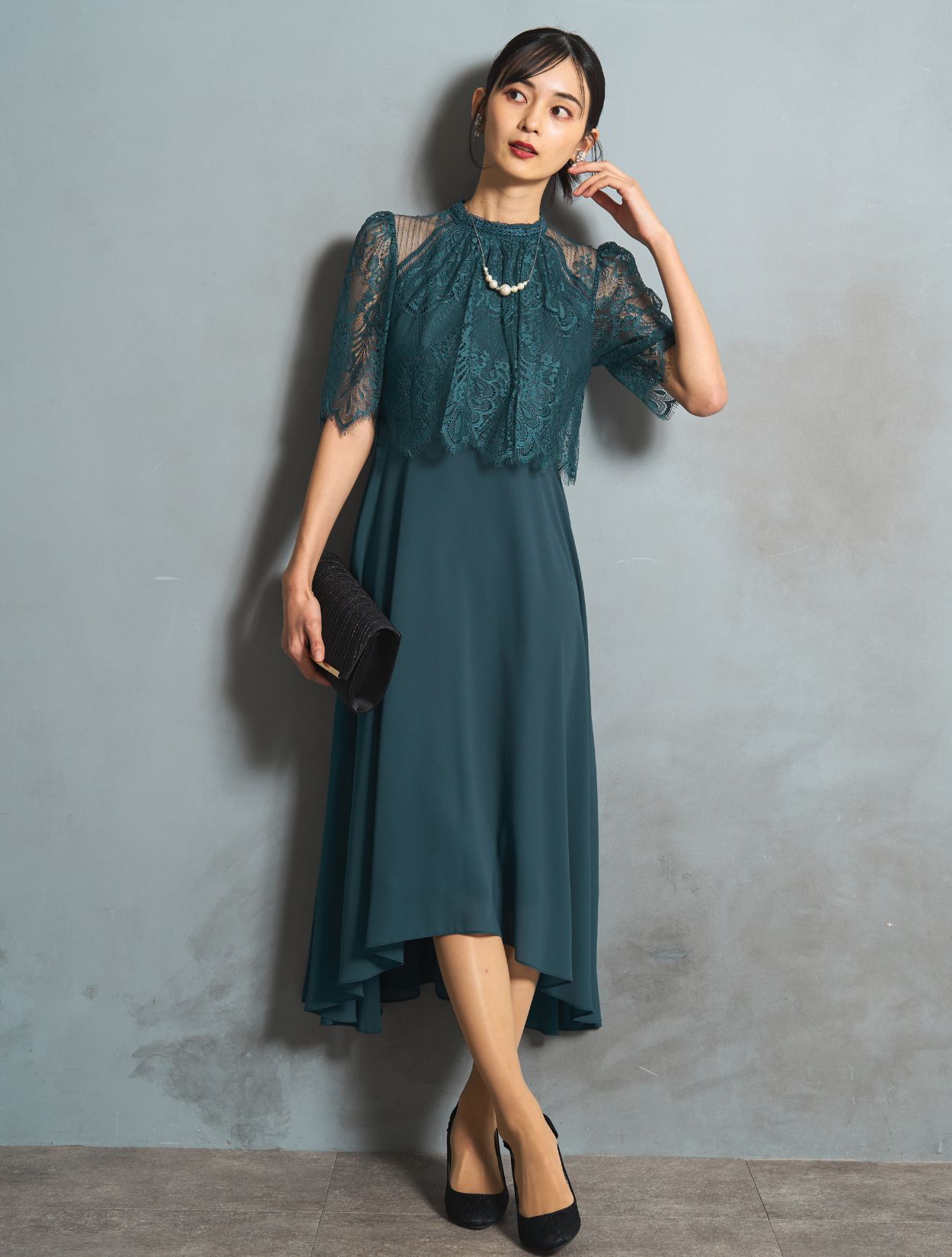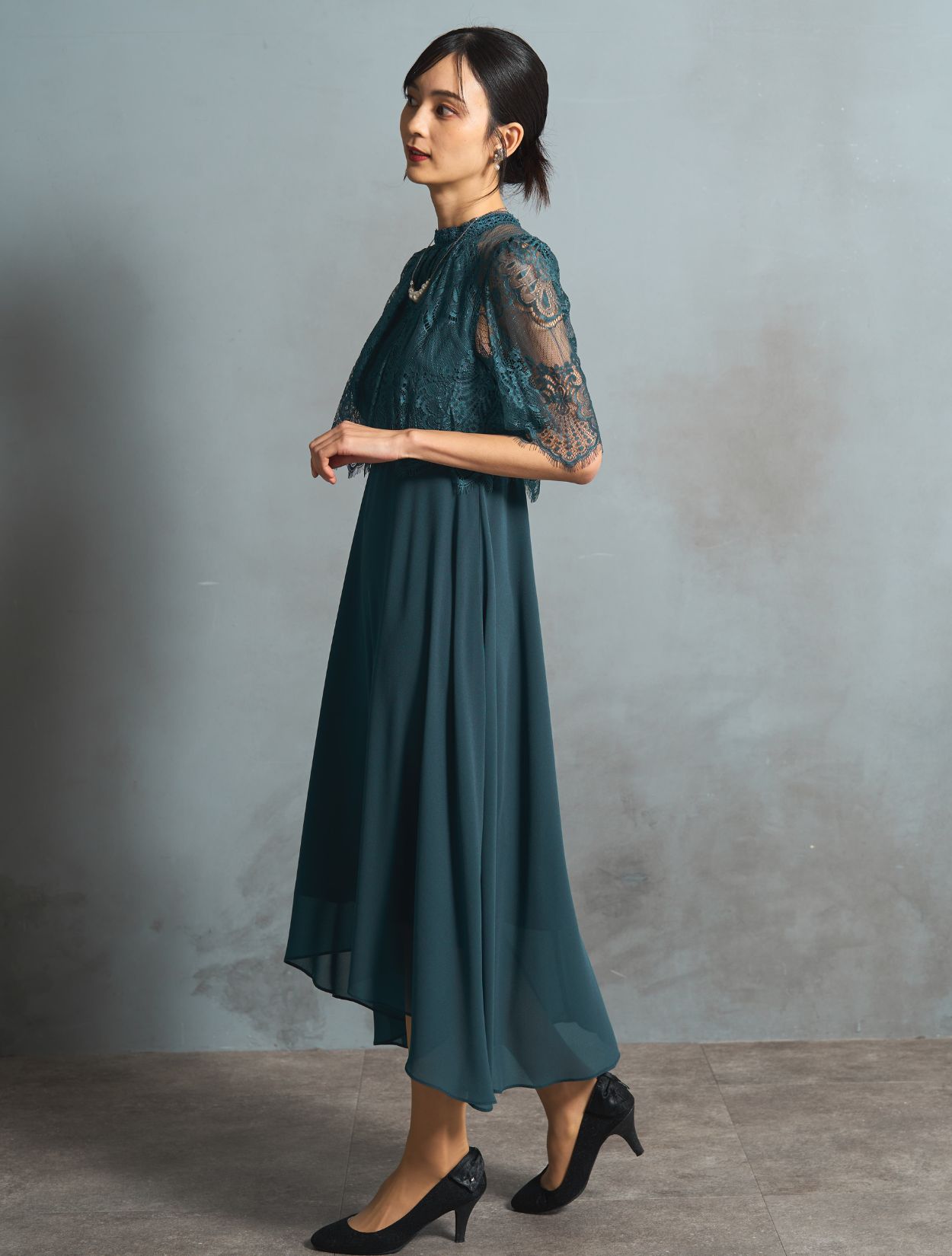 ヘム裾スカートが華やかなデザインのドレス。長すぎない丈感は、低身長の方にもおすすめです。ウエストの切り替えは、表からは見えないですが高めに設定されているので脚長効果抜群。低身長の方でもバランスよく着こなせます。フワッとしたオーバーブラウス風レースが、ウエストや腰周りをすっきり見せてくれる人気のデザイン。着痩せ効果がかなり期待できます。ウエストは背中部分のみゴム仕様で、着心地も◎。ミニスタンドネックが上品でクラシカルな印象。結婚式などのフォーマルな場面にぴったりです。肩から袖は透け感がありますが、デコルテ部分は透けないので幅広い年代が安心して着られます。