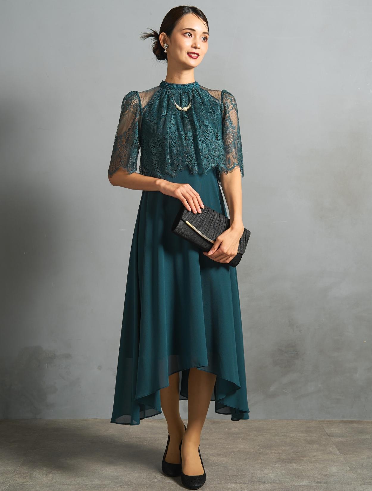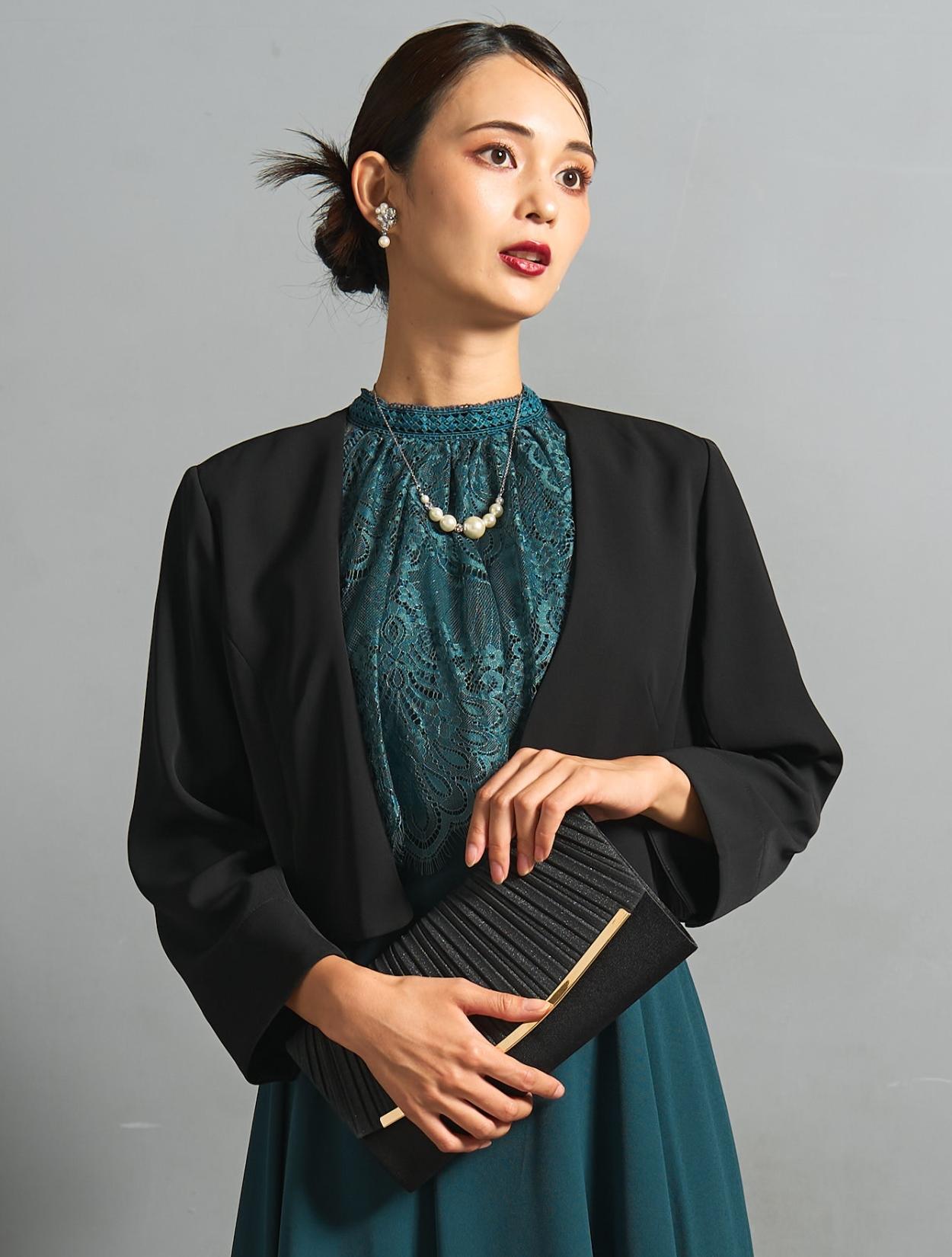 グリーンのドレスにブラックのジャケットを合わせたきちんと感のあるコーディネート。カラードレスを着たい親族におすすめのセットです。ブラックジャケットは、ドレスのグリーンが更に引き立ちますので地味に見え過ぎないのもポイント。スタンドネックのデザインをスッキリ着こなす、長めのネックレスを合わせています。首が短いのがお悩みの方でも、視覚効果で詰まって見えにくいです。