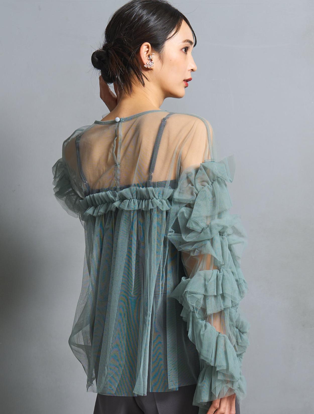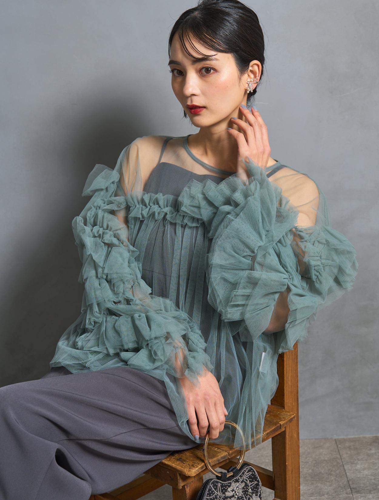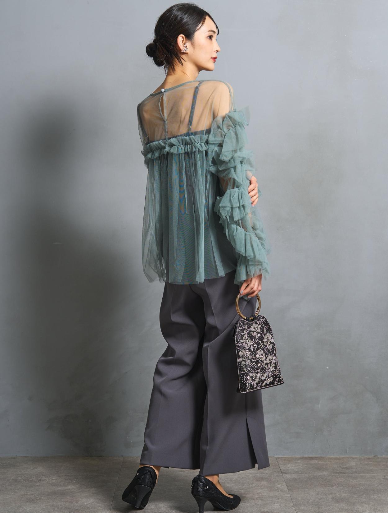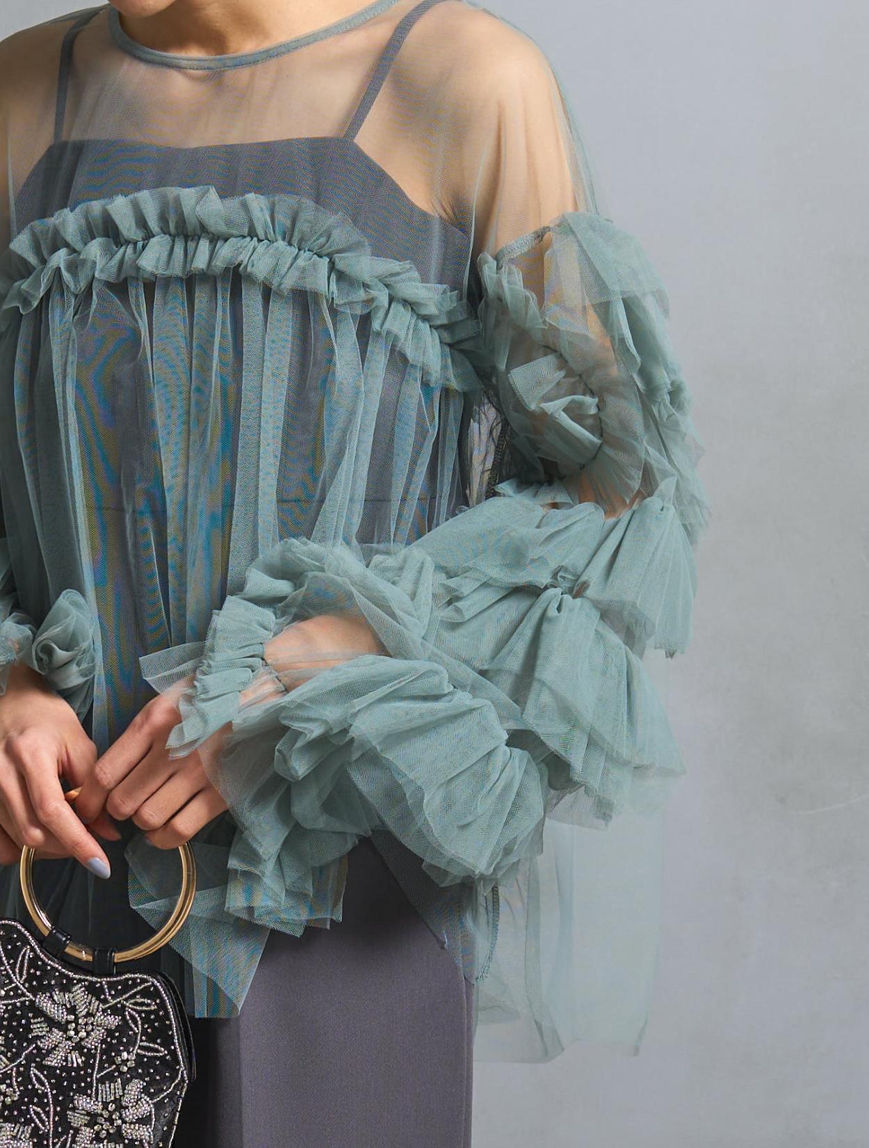 ウェーブ状に配置されたボリュームたっぷりのチュールフリルの袖は、デコラティブでシンプルなパンツドレスとの相性抜群。袖口にゴムが入っているので、お食事の時でも安心です。あえて袖をたくし上げて、さらにボリューミーな袖を楽しむのもおすすめの着こなし。オーバーサイズのデザインですが、軽くて透け感のある素材は着膨れせずに着られます。ブラウスの着丈は前後差があり、後ろ側はふんわりヒップが隠れる丈で安心感もあります。